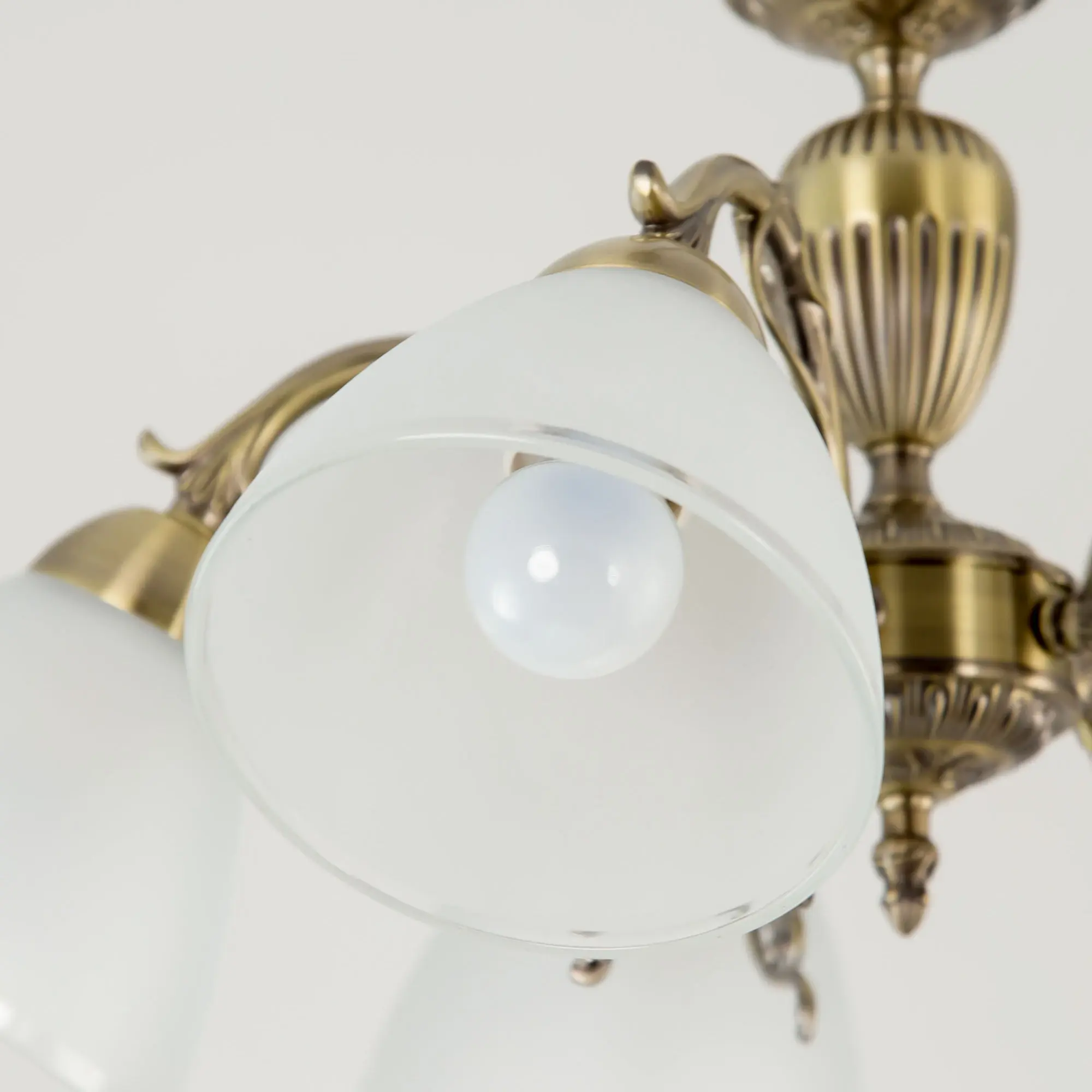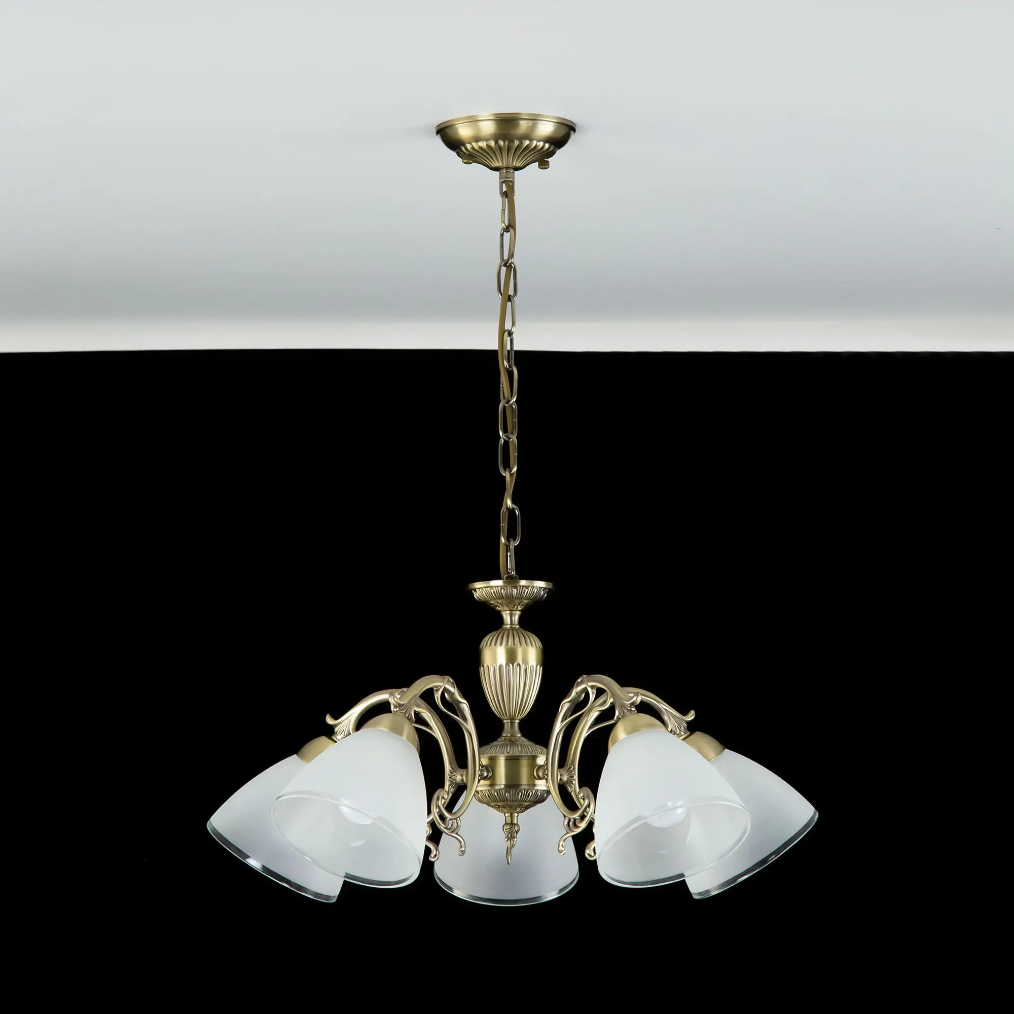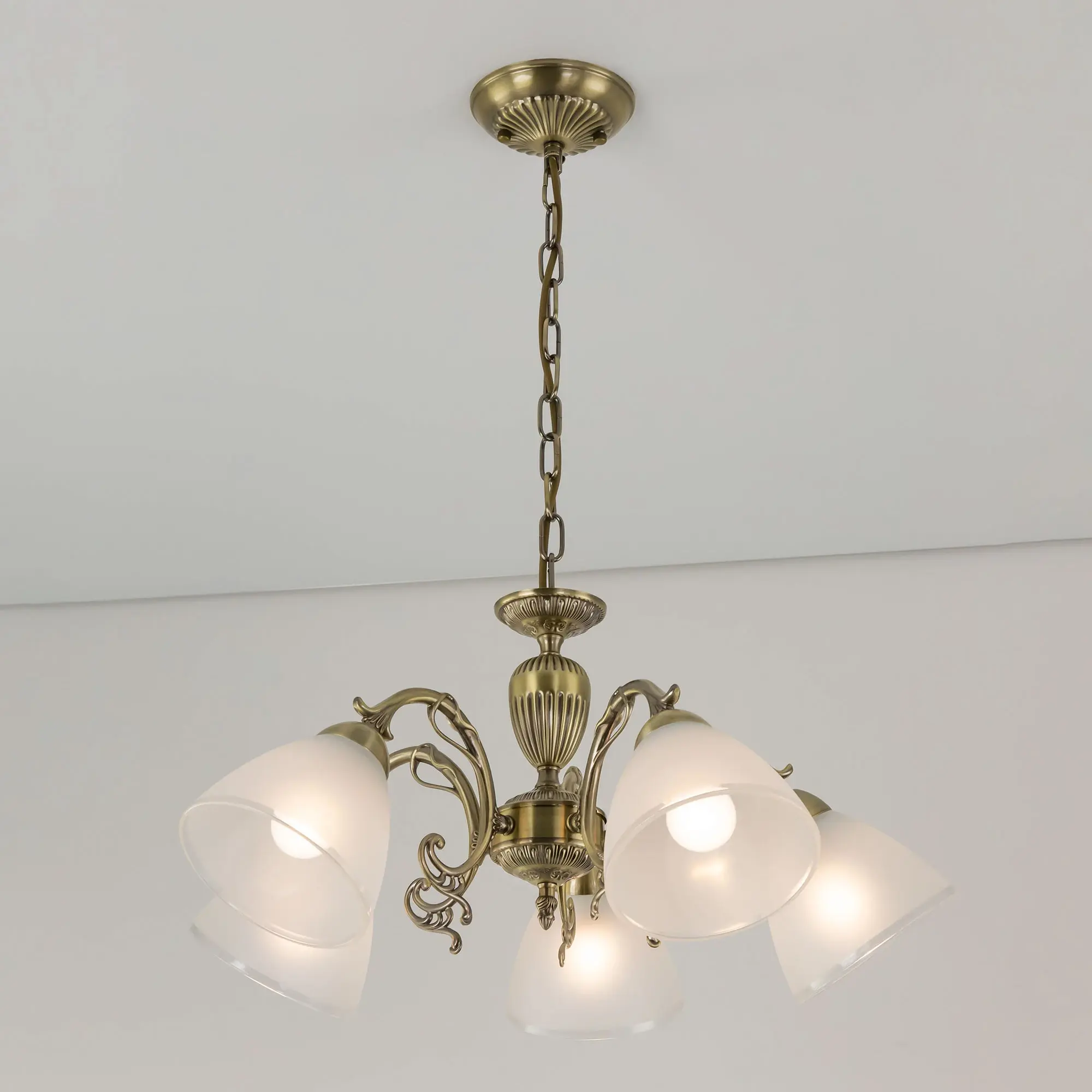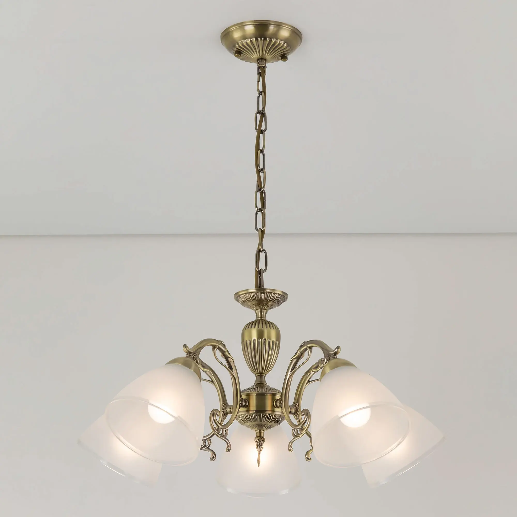 Люстра пятирожковая Citilux Латур CL413251 выполнена в классическом стиле. Корпус светильника металлический, с литыми рожками, цвет бронза. Плафоны стеклянные, полуматовые с утончённой прозрачной окантовкой. Люстра поставляется в виде комплекта для самостоятельной сборки, с подробной инструкцией. Из данного набора, можно собрать подвесную модель с плафонами, направленными вверх, дающую мягкий отраженный свет или более яркий вариант с плафонами вниз. Высота люстры на цепи 70 см, прекрасный выбор для комнат с высокими потолками. Если в помещении низкие потолки, люстру можно собрать вообще без цепи, как потолочную, высотой всего 27 см. Тип крепления к потолку – планка. Более того, на стадии сборки, вы можете подключить люстру для работы, как с одноклавишным, так и с двухклавишным выключателем. В модели используются 5 ламп с цоколем Е27 и максимальной мощностью для ламп накаливания 75Вт. Суммарная мощность 375 Вт. Светодиодные лампы можно использовать большей яркости.