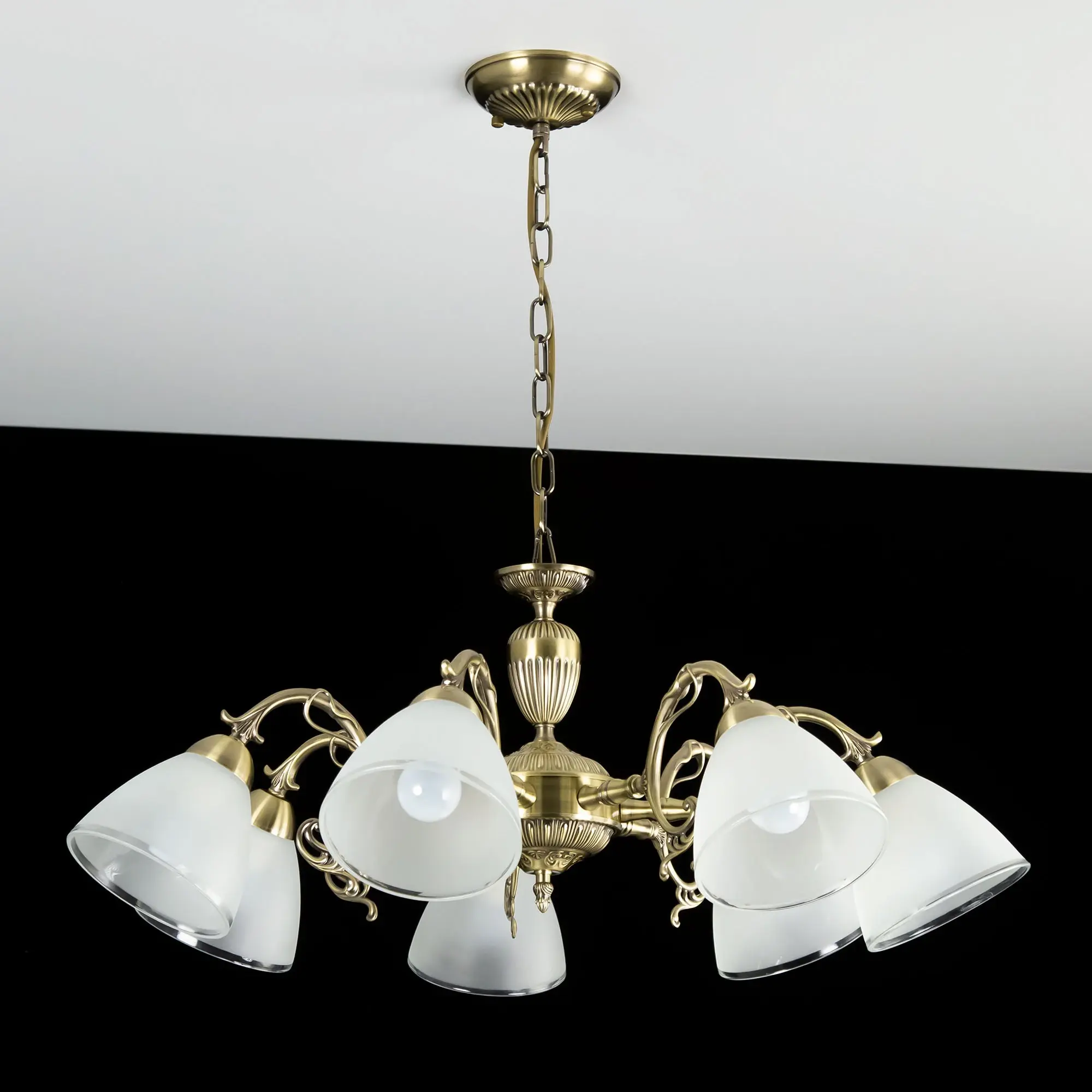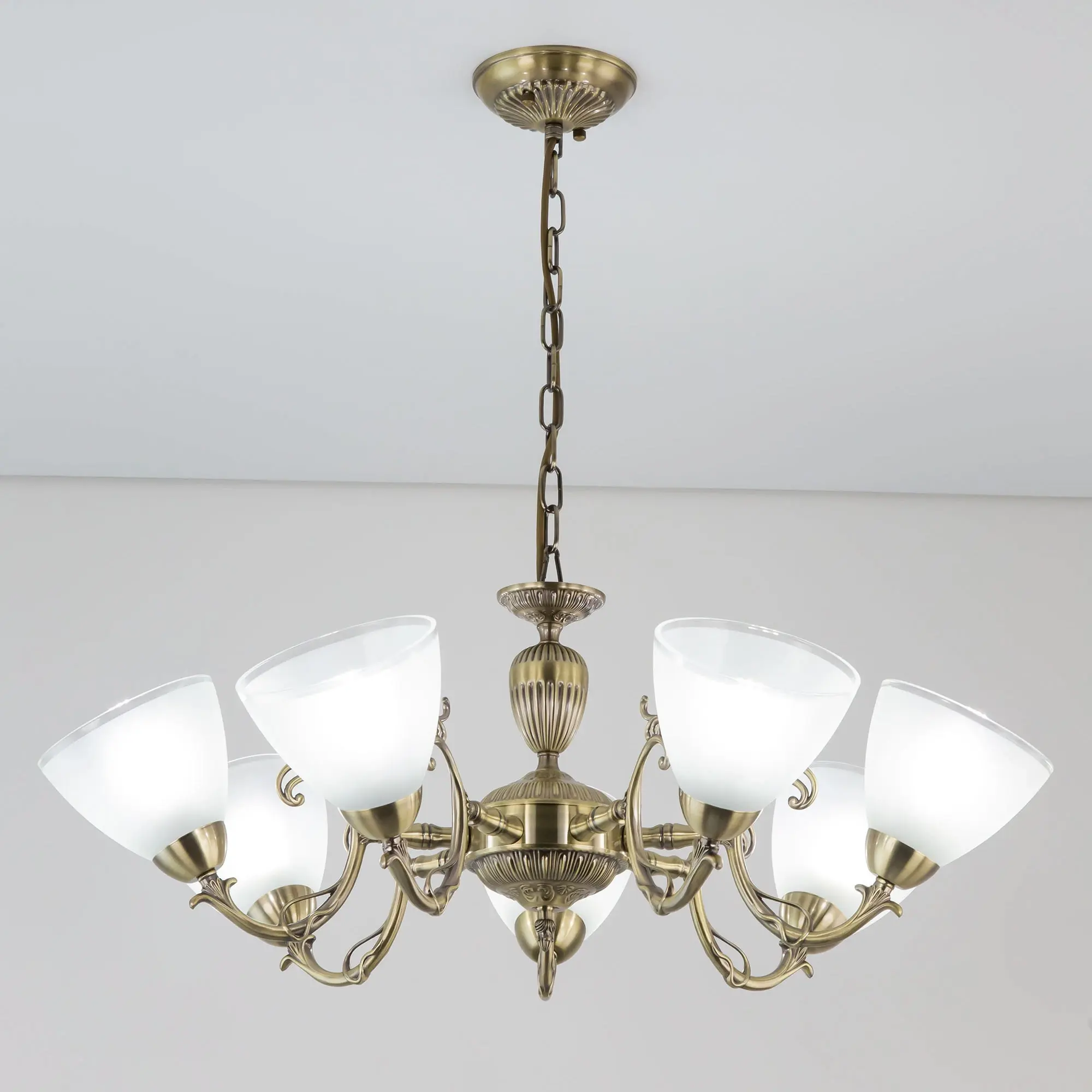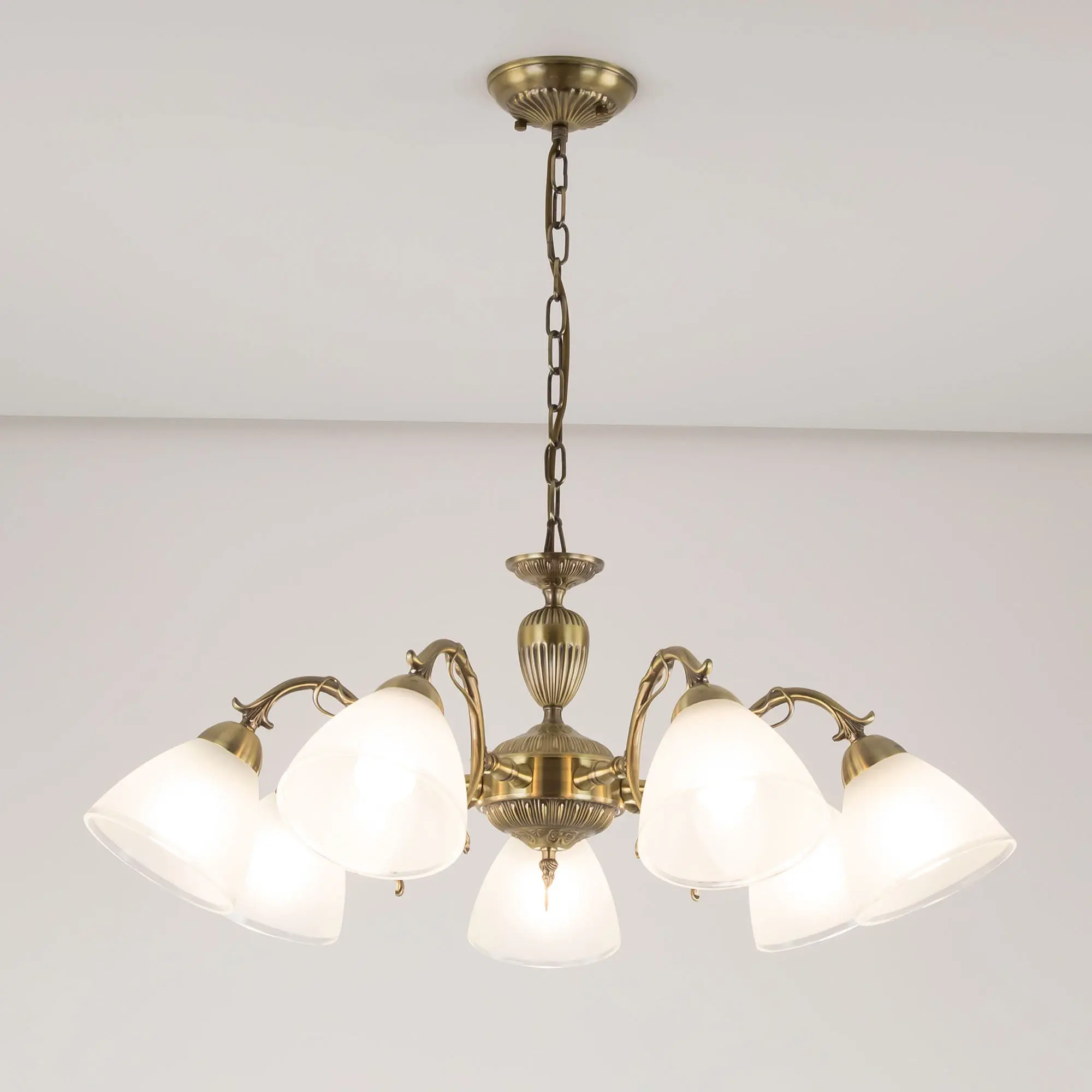 Люстра Citilux Латур CL413271 выполнена в классическом стиле. Корпус светильника металлический, с литыми рожками, цвет бронза. Плафоны стеклянные, полуматовые с утончённой прозрачной окантовкой. Люстра поставляется в виде комплекта для самостоятельной сборки, с подробной инструкцией. Из данного набора, можно собрать подвесную модель с плафонами, направленными вверх, дающую мягкий отраженный свет или более яркий вариант с плафонами вниз. Высота люстры на цепи 90 см, прекрасный выбор для комнат с высокими потолками. Если в помещении низкие потолки, люстру можно собрать вообще без цепи, как потолочную, высотой всего 27 см. Тип крепления к потолку – планка. Более того, на стадии сборки, вы можете подключить люстру для работы, как с одноклавишным, так и с двухклавишным выключателем. В модели используются 7 ламп с цоколем Е27 максимальной мощностью для ламп накаливания 75Вт. Суммарная мощность 525 Вт. Светодиодные лампы можно использовать большей яркости