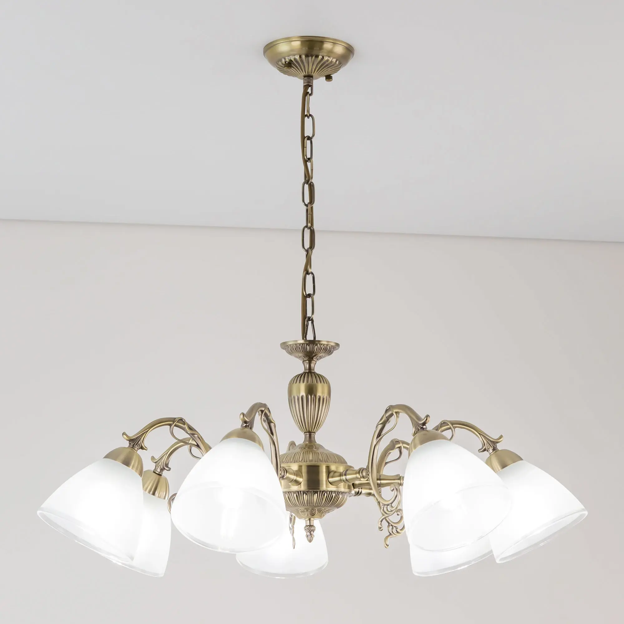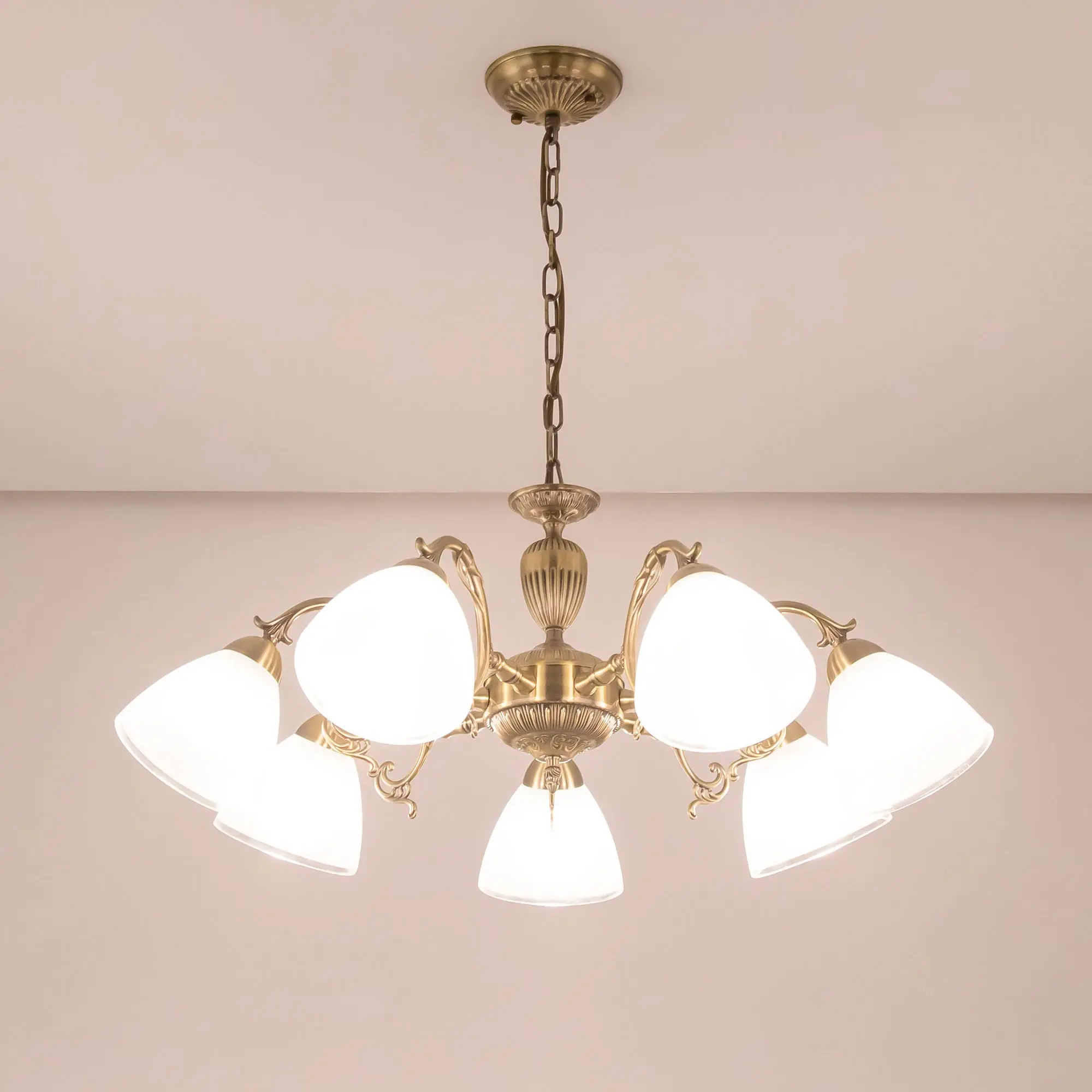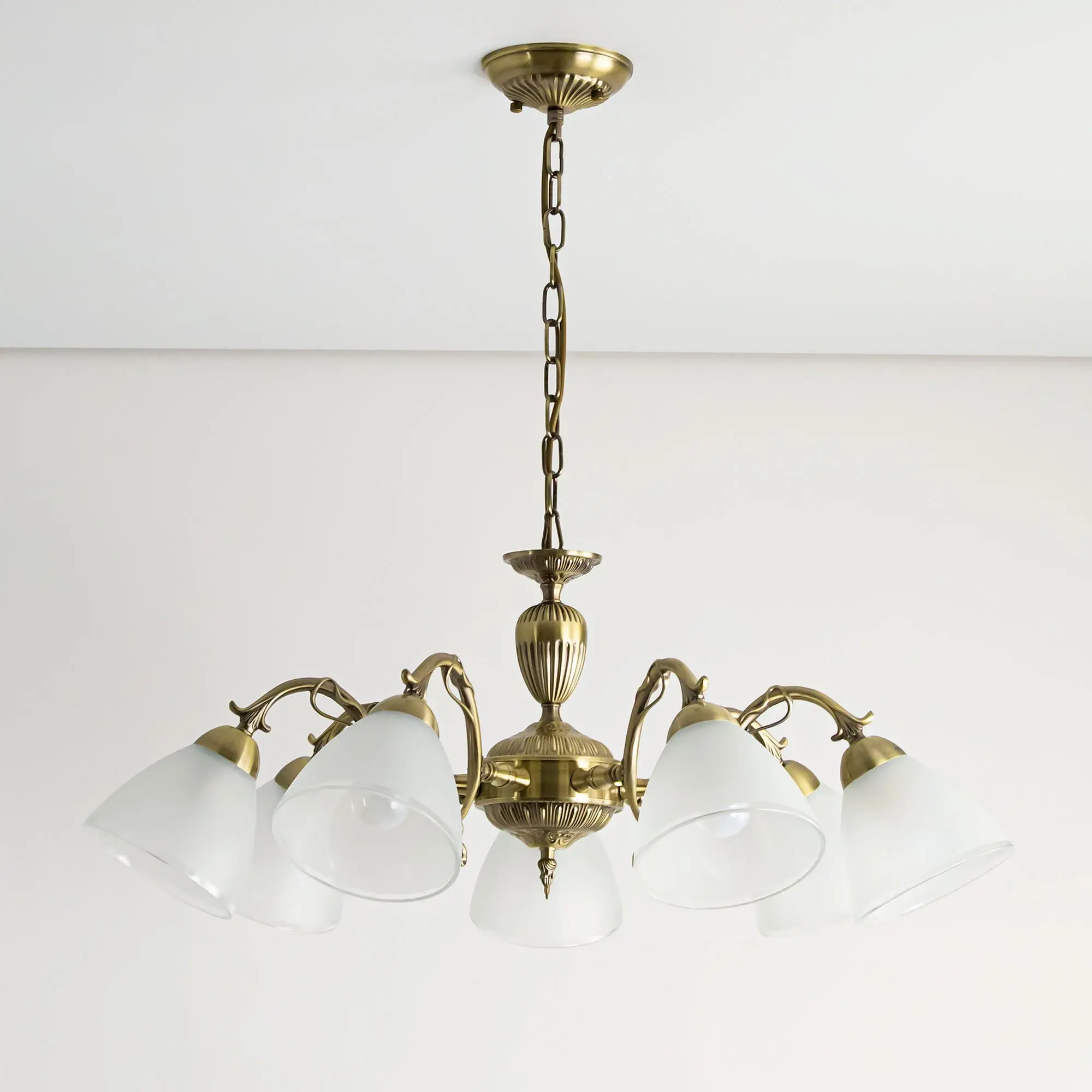 Люстра Citilux Латур CL413271 выполнена в классическом стиле. Корпус светильника металлический, с литыми рожками, цвет бронза. Плафоны стеклянные, полуматовые с утончённой прозрачной окантовкой. Люстра поставляется в виде комплекта для самостоятельной сборки, с подробной инструкцией. Из данного набора, можно собрать подвесную модель с плафонами, направленными вверх, дающую мягкий отраженный свет или более яркий вариант с плафонами вниз. Высота люстры на цепи 90 см, прекрасный выбор для комнат с высокими потолками. Если в помещении низкие потолки, люстру можно собрать вообще без цепи, как потолочную, высотой всего 27 см. Тип крепления к потолку – планка. Более того, на стадии сборки, вы можете подключить люстру для работы, как с одноклавишным, так и с двухклавишным выключателем. В модели используются 7 ламп с цоколем Е27 максимальной мощностью для ламп накаливания 75Вт. Суммарная мощность 525 Вт. Светодиодные лампы можно использовать большей яркости