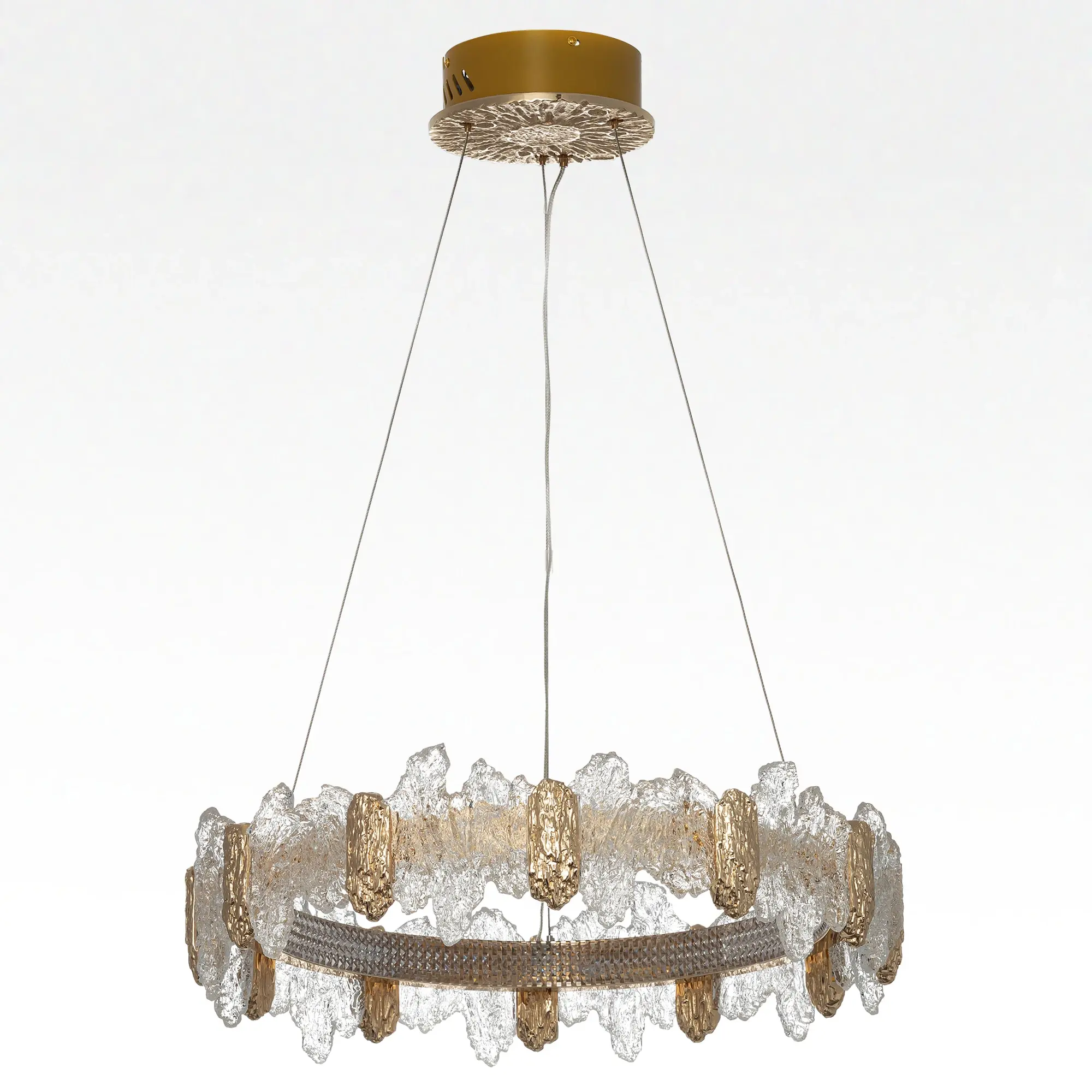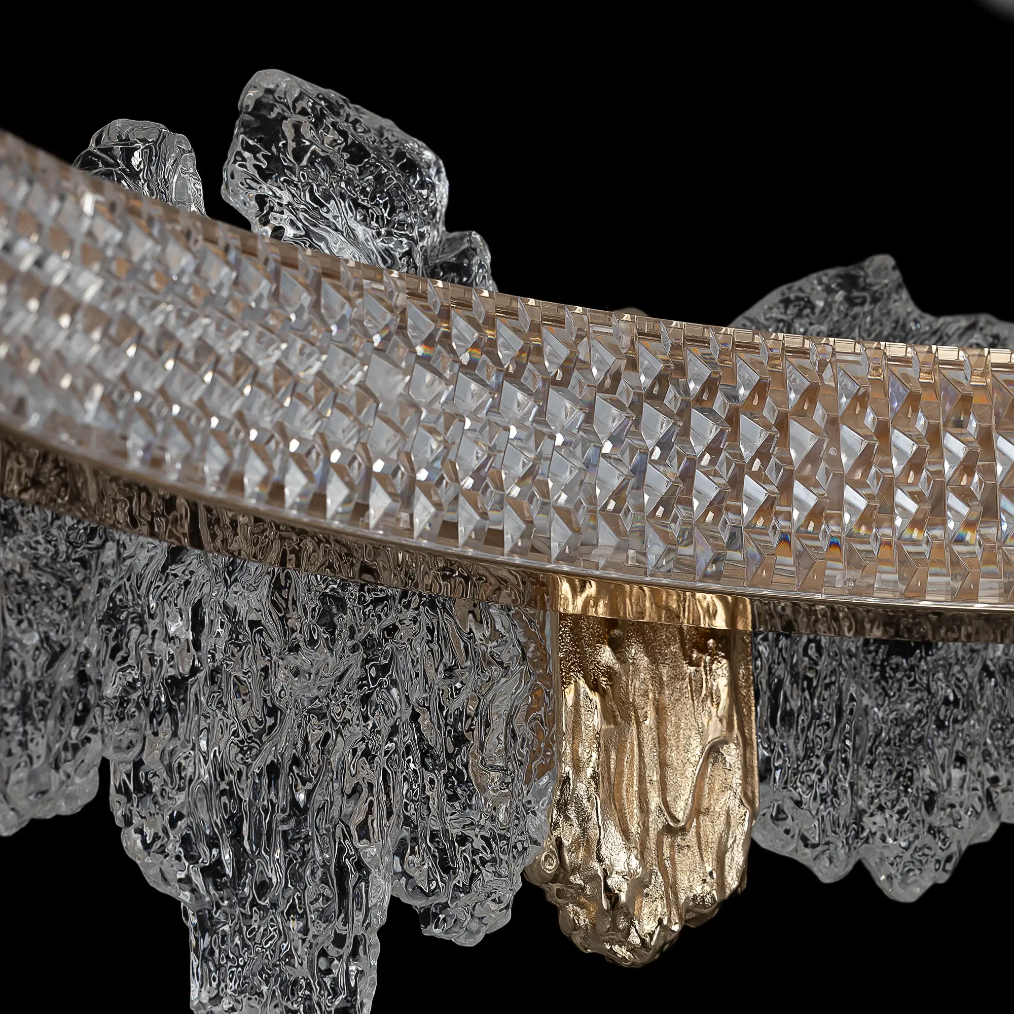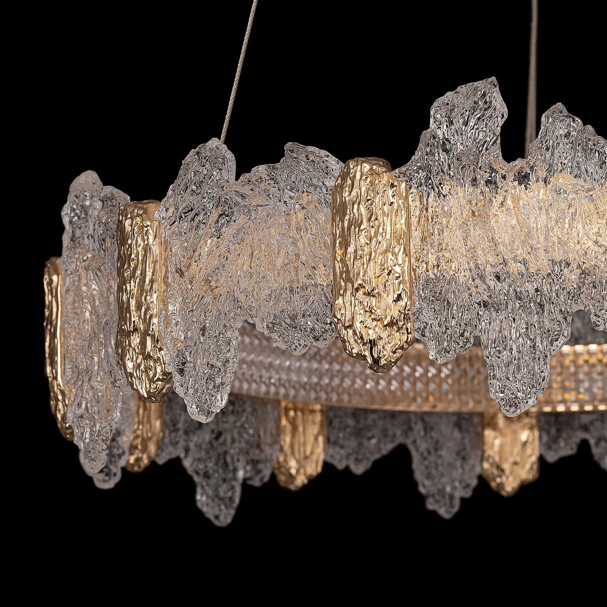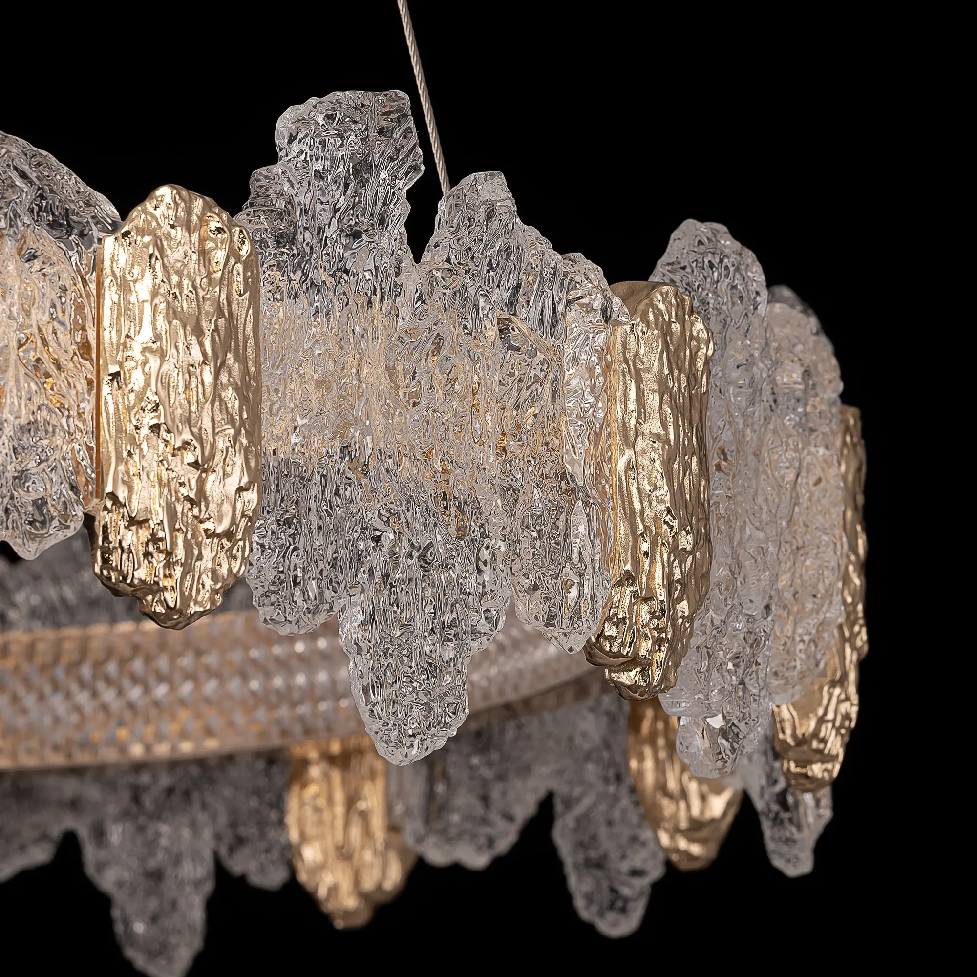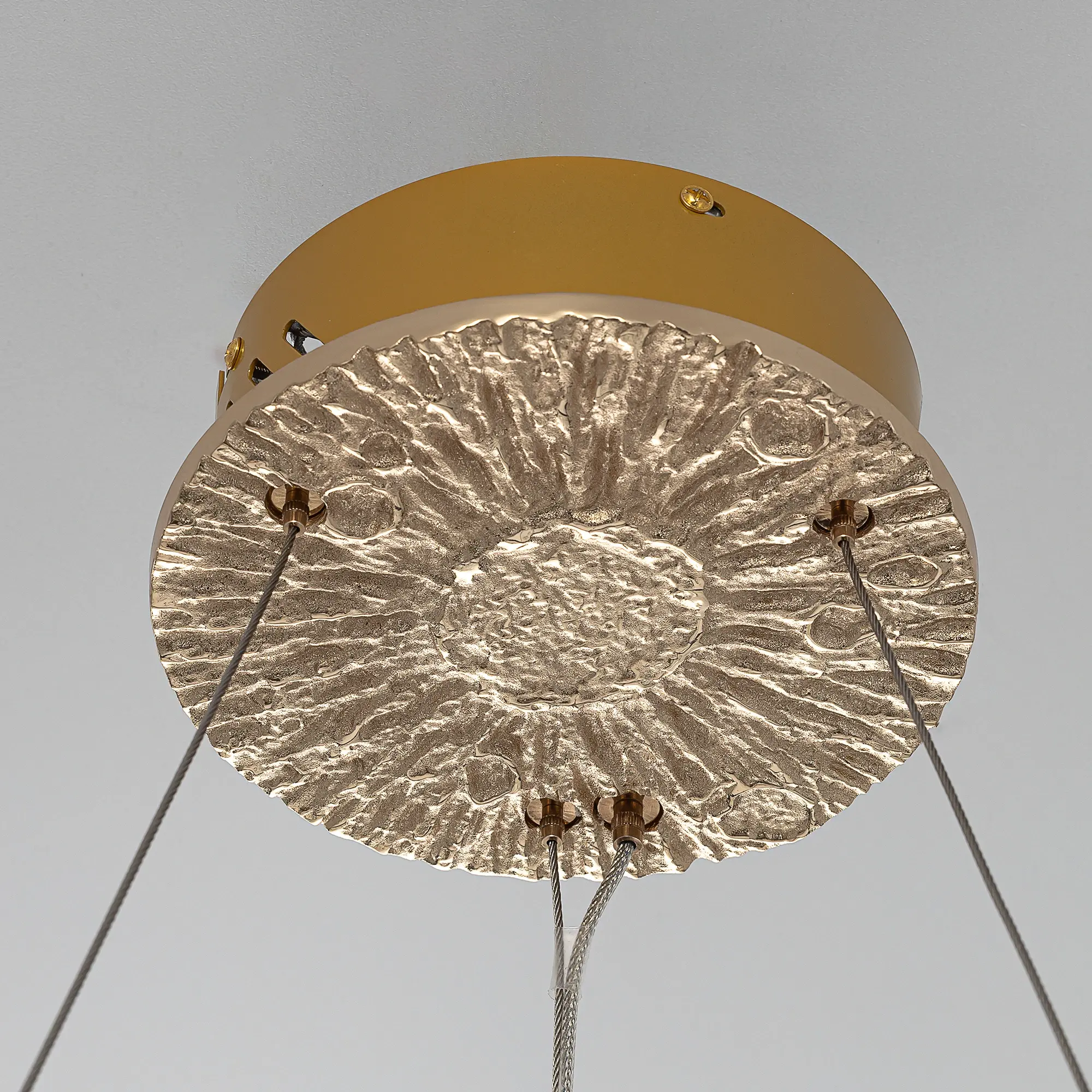 Каркас люстры — металлический, роскошного золотистого оттенка. Подвесное кольцо закреплено на тонких тросах и будто парит в воздухе. Рассеиватель из оптического полимера имеет оригинальную форму, напоминающую потоки застывшей лавы. Люстра подойдет к любому типу потолка, включая натяжные конструкции, высоту подвеса можно легко изменить.