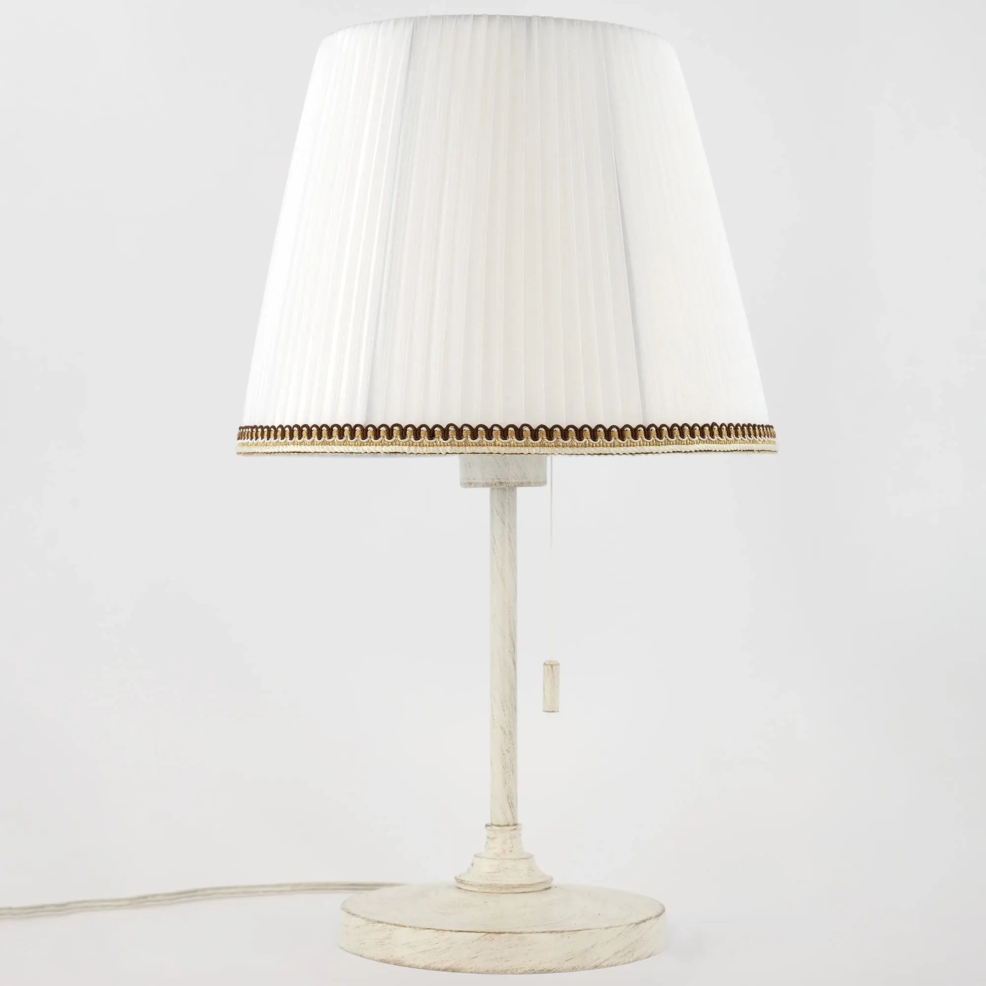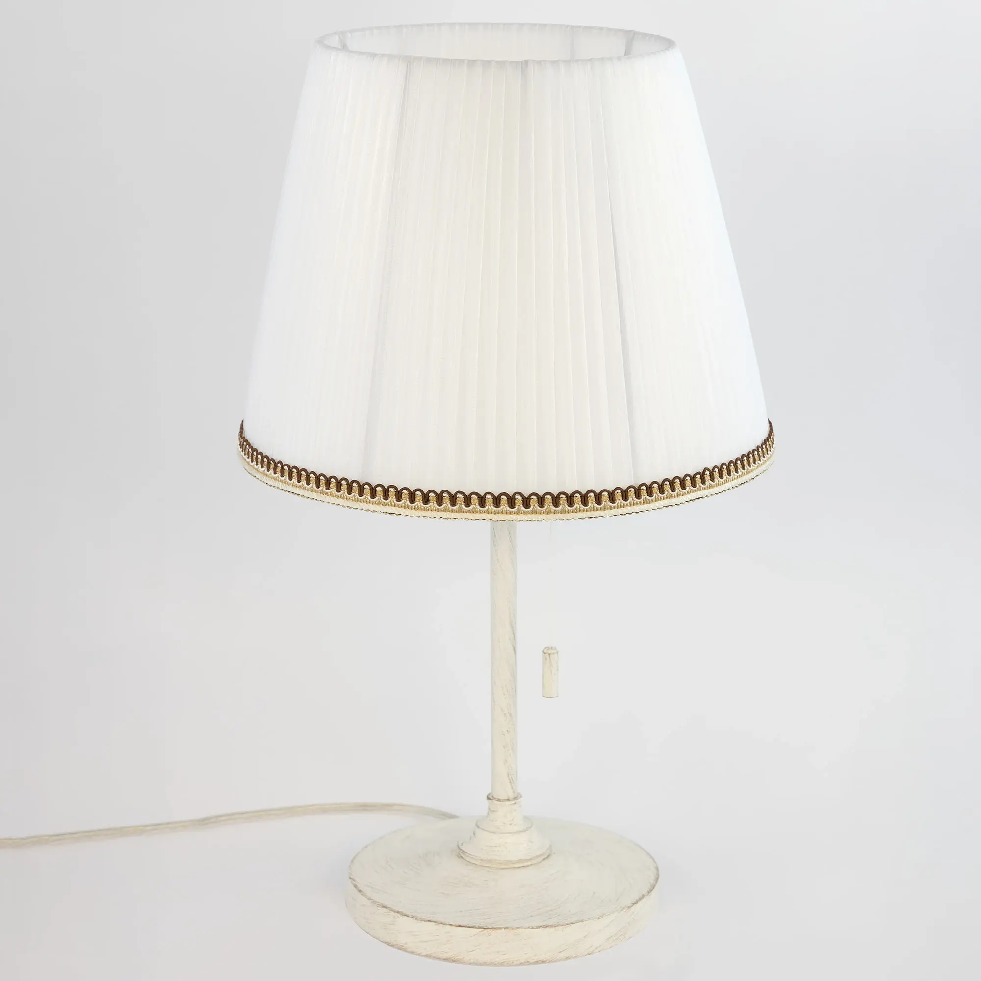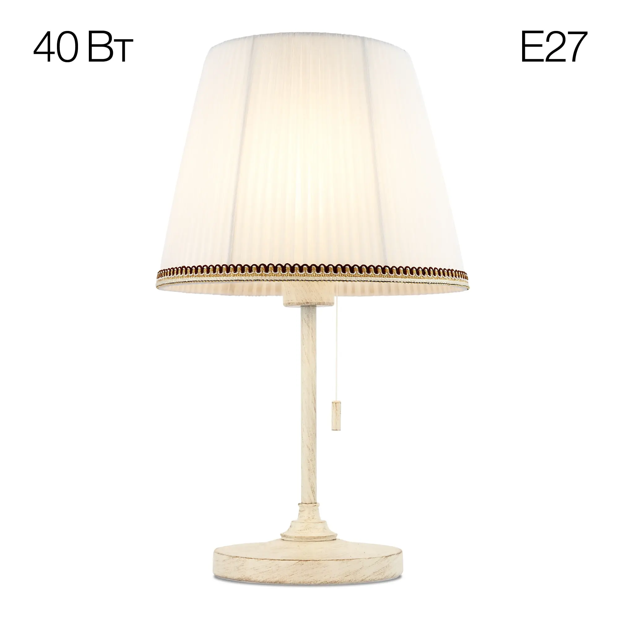 Настольный светильник Ситилюкс Линц CL402720 с тканевым абажуром и удобным выключателем. Основание металлическое, молочного цвета с золотистой патиной. Плиссированный абажур из полупрозрачной органзы белого цвета декорирован изящной тесьмой. В изделии 1 лампа с цоколем Е27 максимальной мощностью для ламп накаливания 40Вт (в комплект не входит, приобретается отдельно). Светодиодные лампы можно устанавливать более яркие. Выключатель типа сонетка («дёргалка») находится на основании. Высота светильника 45см, диаметр 28,5см, длина сетевого провод 1,8м.