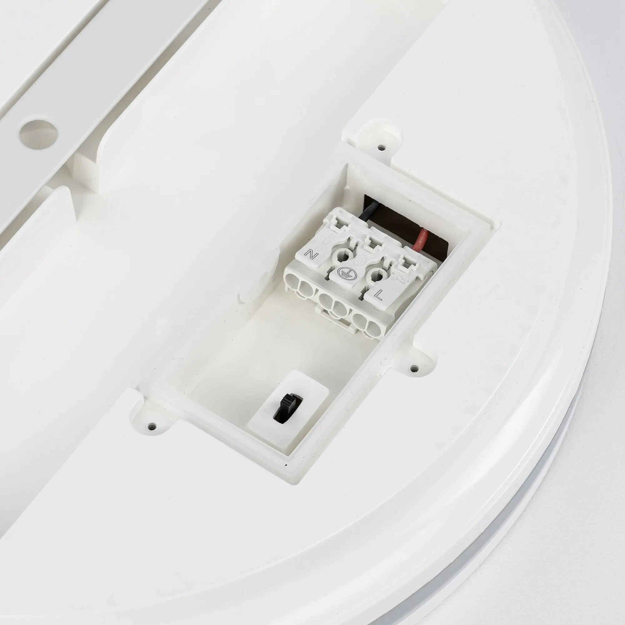 Диаметр изделия 29см, высота 5,4см, мощность 24Вт, класс защиты IP64, осветит до 8м². Модель оснащена переключателем цветовой температуры 3000К, 4000К, 6500К - тёплый, нейтральный, холодный свет. Перед монтажом, на тыльной стороне светильника, переключателем устанавливается выбранный вариант свечения. Свет безопасный для глаз, без мерцания и пульсаций.