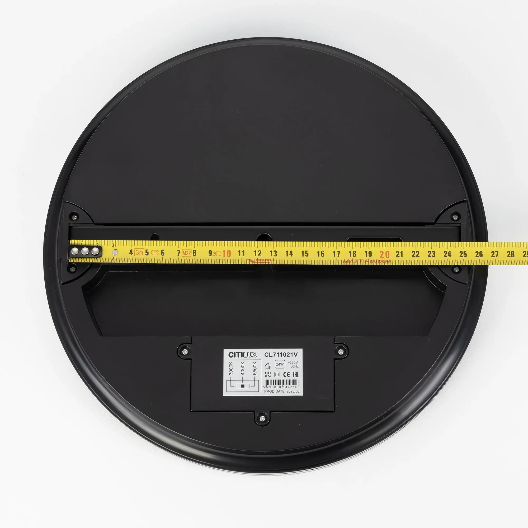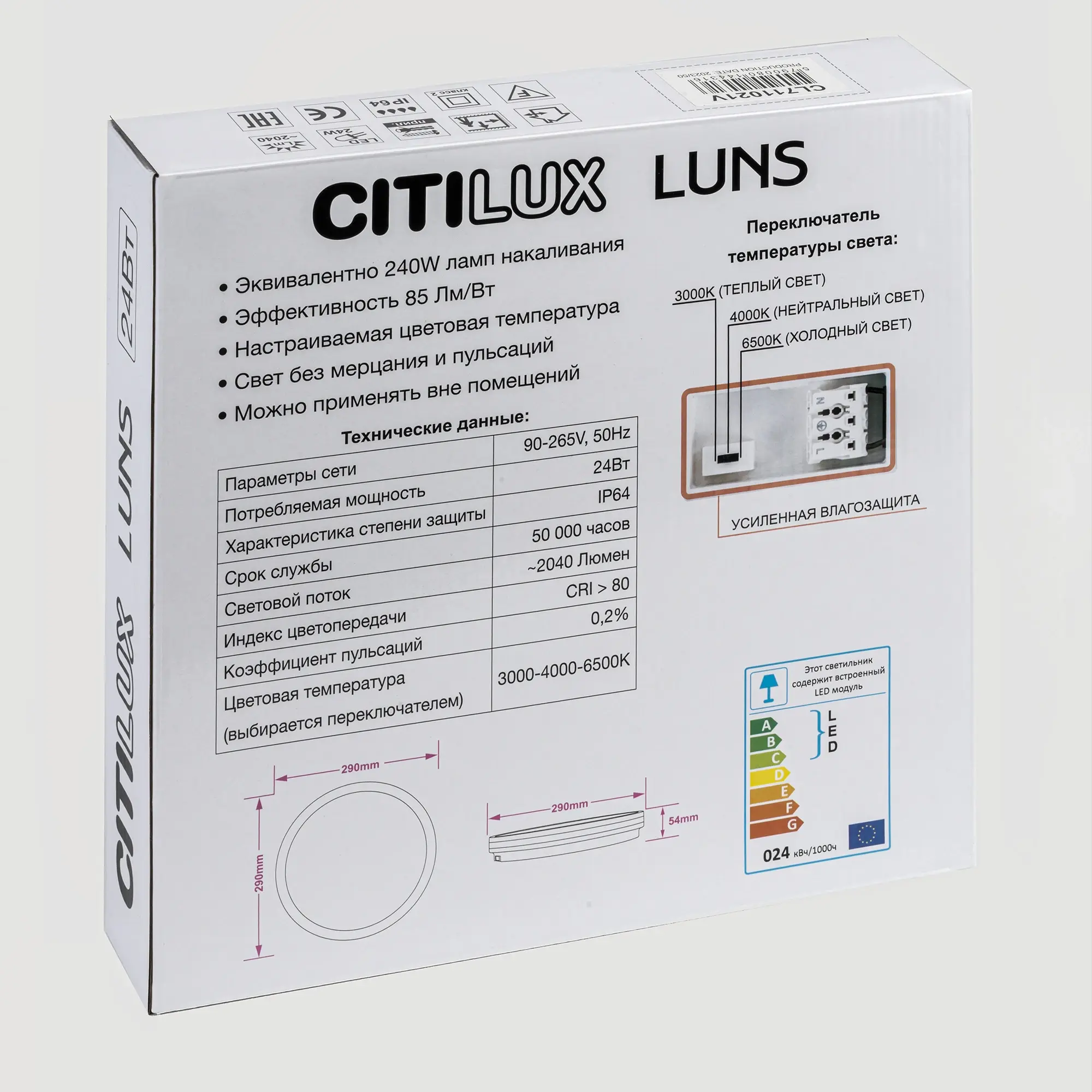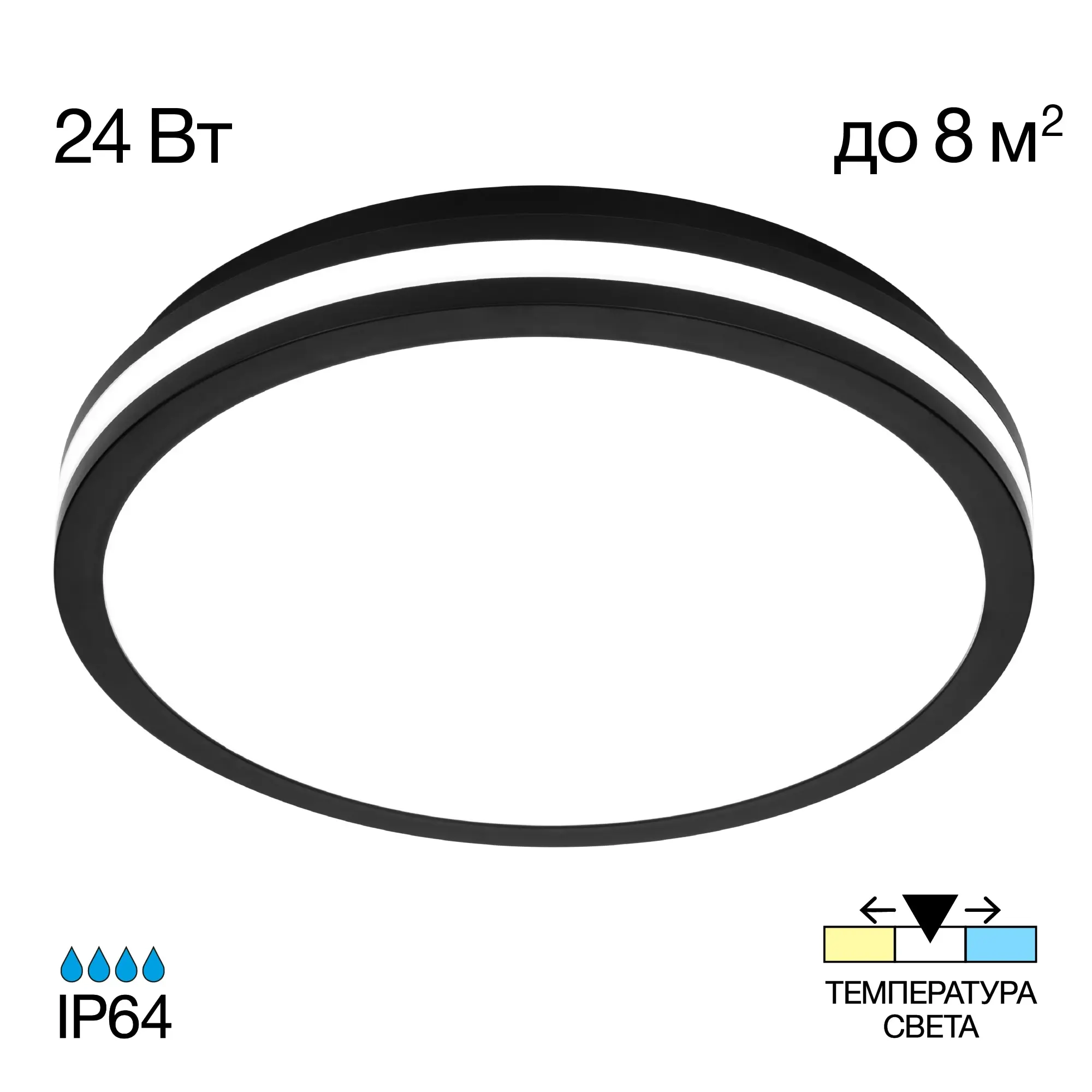 Диаметр изделия 29см, высота 5,4см, мощность 24Вт, класс защиты IP64, осветит до 8м². Модель оснащена переключателем цветовой температуры 3000К, 4000К, 6500К - тёплый, нейтральный, холодный свет. Перед монтажом, на тыльной стороне светильника, переключателем устанавливается выбранный вариант свечения. Свет безопасный для глаз, без мерцания и пульсаций.