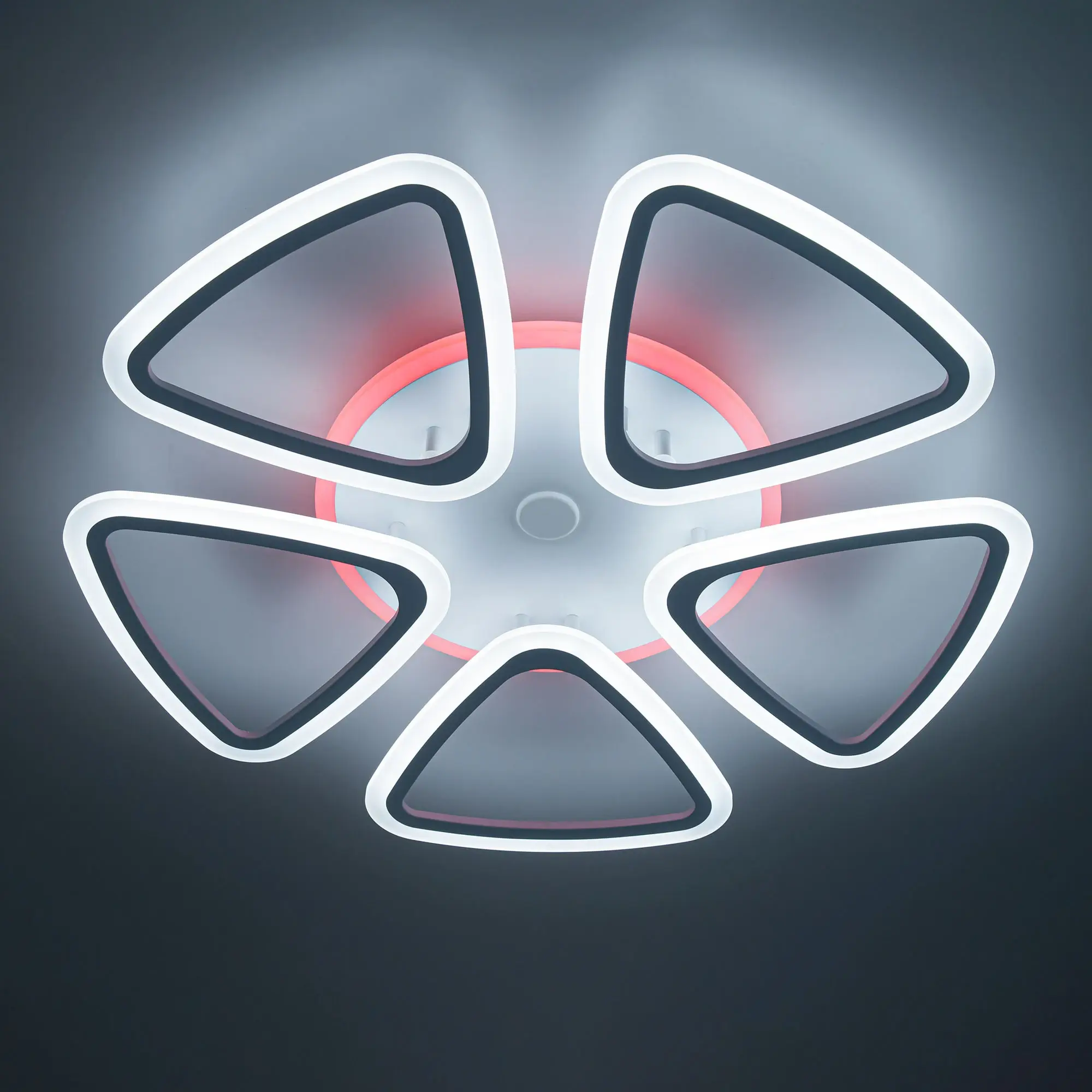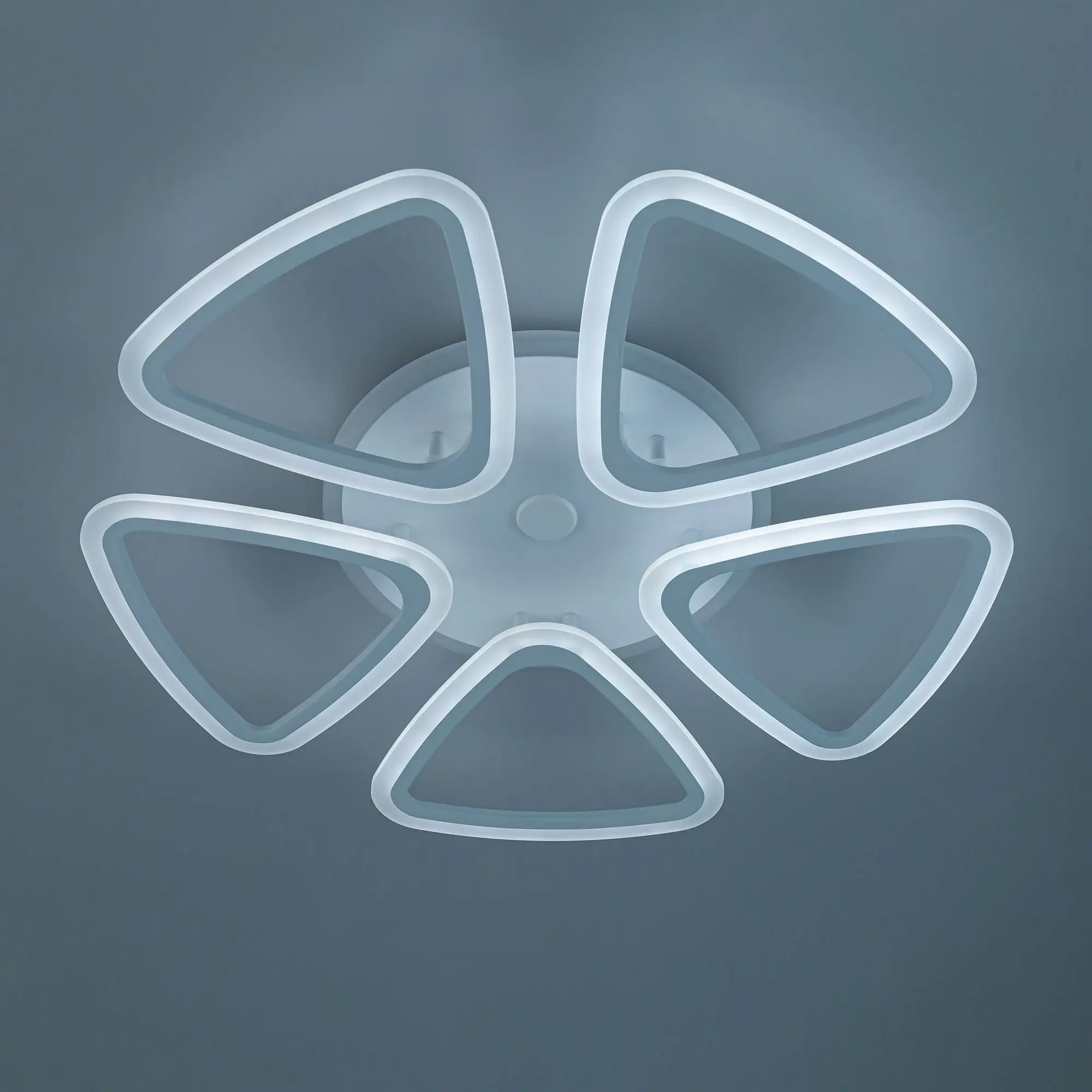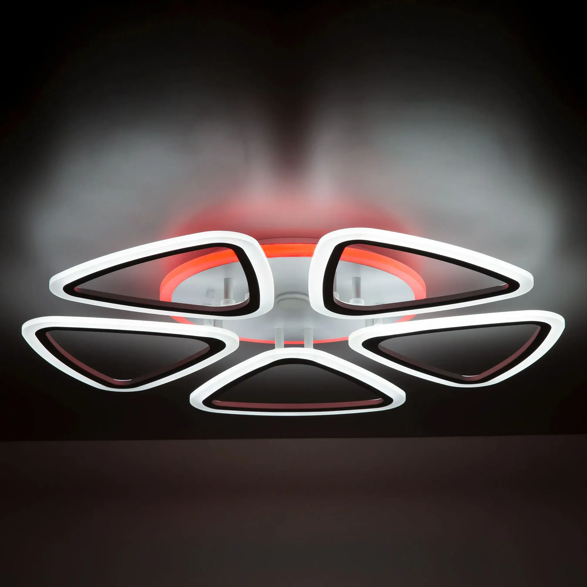 Светодиодная потолочная люстра Citilux Мальта Смарт CL234A250E RGB с голосовым управлением, яркая модель современных УМНЫХ светильников экосистемы Citilux SMART . Светильник белый матовый, с круглым основанием. Пять светодиодных модулей плафонов, формирующих внешний вид люстры, треугольной формы. Корпус плафонов белого цвета изготовлен из металла, рассеиватель белый матовый из оптического полимера. Изделие подходит для всех типов потолков, в том числе натяжных. Люстрой можно управлять: из приложения на смартфоне по Wi-Fi при наличии интернета, с помощью голосовых помощников Алиса и Маруся, есть возможность запуска настроенных сценариев с помощью Сири, а также пультом дистанционного управления и с настенного выключателя. Изделие оснащено мощными светодиодами, с возможностью плавной регулировки яркости от 100 до 10%. Цветовая температура регулируется в диапазоне от 3000К до 5500К, позволяя настроить любые оттенки теплого, нейтрального или холодного света. В основании светильника установлена независимая цветная RGB подсветка. Мощность люстры 60Вт, световой поток 5800Лм. Пульт ДУ в комплекте, тип батареек ААА (батарейками не комплектуется).