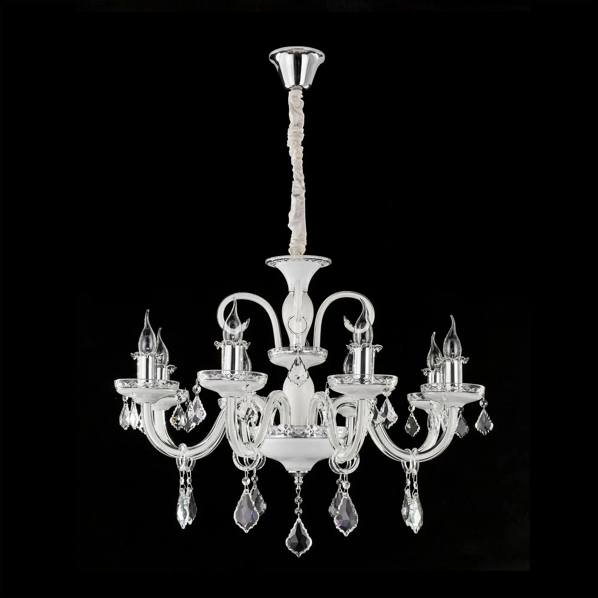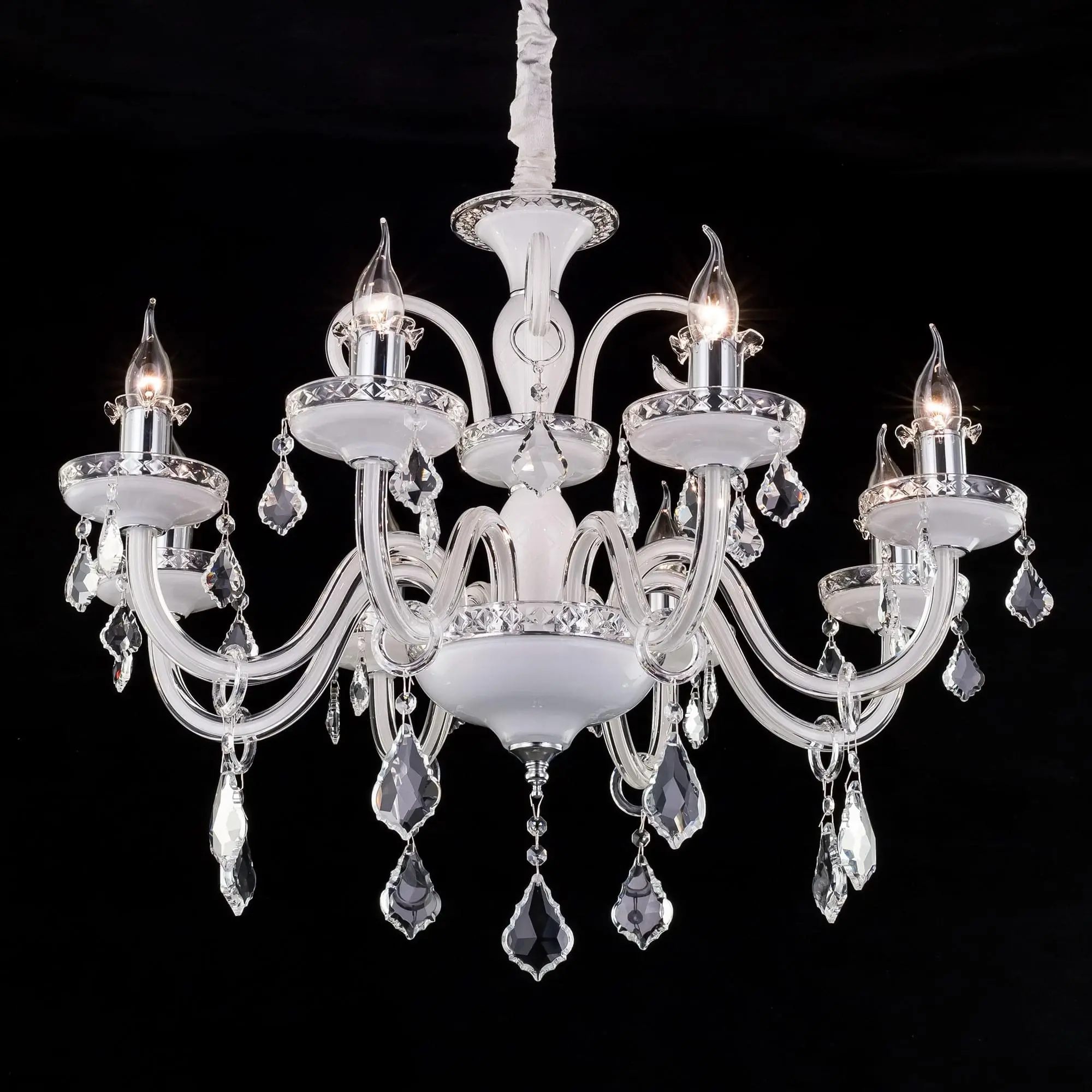 Подвесная люстра Citilux Марена CL352180 поражает своей изысканной красотой. Светильник искусно выполнен из белого глянцевого стекла с прозрачным декором и украшен хрустальными подвесками. В изделии используются 8 ламп с цоколем Е14 максимальной мощностью для ламп накаливания 60Вт (в комплект не входят, приобретаются отдельно). Диаметр люстры 75см, высота легко регулируется при установке в диапазоне от 85см до 1,12м. Подходит для всех типов потолков, в том числе натяжных, тип крепления – крючок.