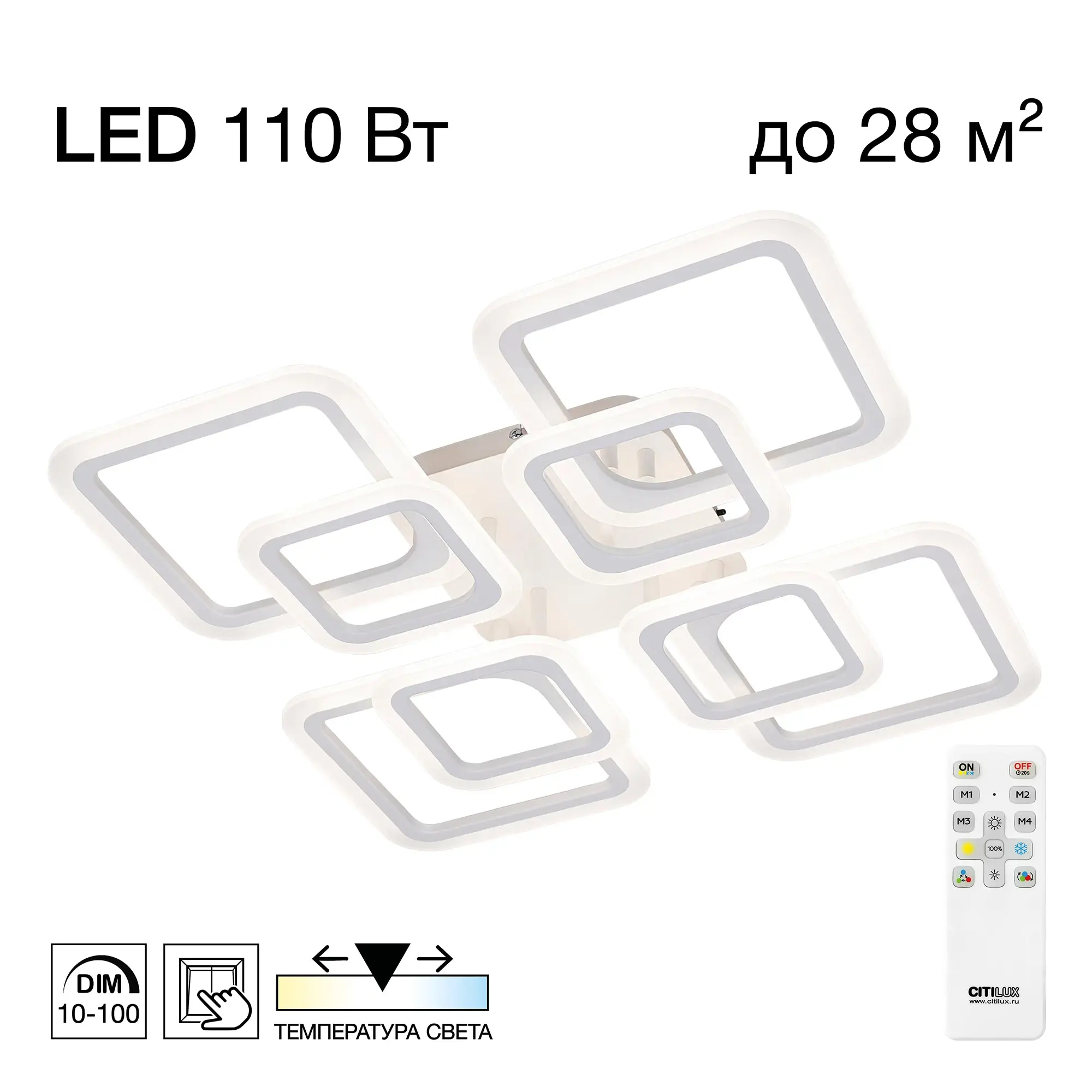Светодиодная потолочная люстра Citilux Марсель CL232180R с пультом дистанционного управления. Металлическое основание и восемь светодиодных модулей плафонов, формирующих внешний вид люстры, имеют квадратную форму. Корпус плафонов металлический, рассеиватель из оптического полимера. Люстрой можно управлять с помощью пульта дистанционного управления и настенным выключателем. Изделие оснащено яркими светодиодами, с возможностью плавной регулировки яркости от 10% до 100%. Цветовая температура регулируется в диапазоне от 3000К до 5500К, позволяя настроить любые оттенки теплого, нейтрального или холодного света, без мерцания и пульсаций. Есть настраиваемые режимы памяти и таймер выключения. Модель подходит для всех типов потолков, в том числе натяжных, тип крепления – планка. Пульт ДУ в комплекте, тип батареек ААА (батарейками не комплектуется). Люстра плоская – высота всего 11см, размер 60х60см, мощность 110Вт, световой поток 11000Лм,