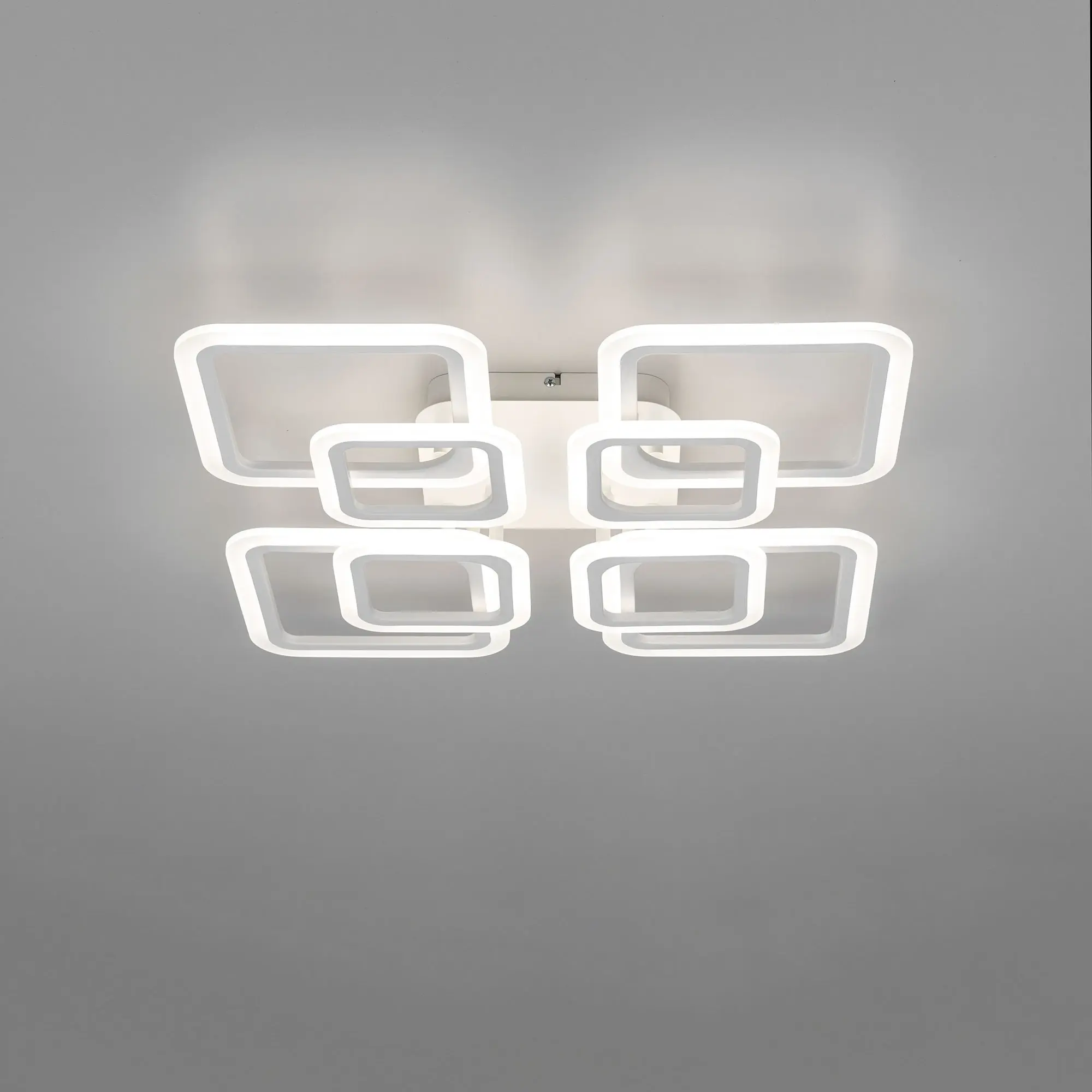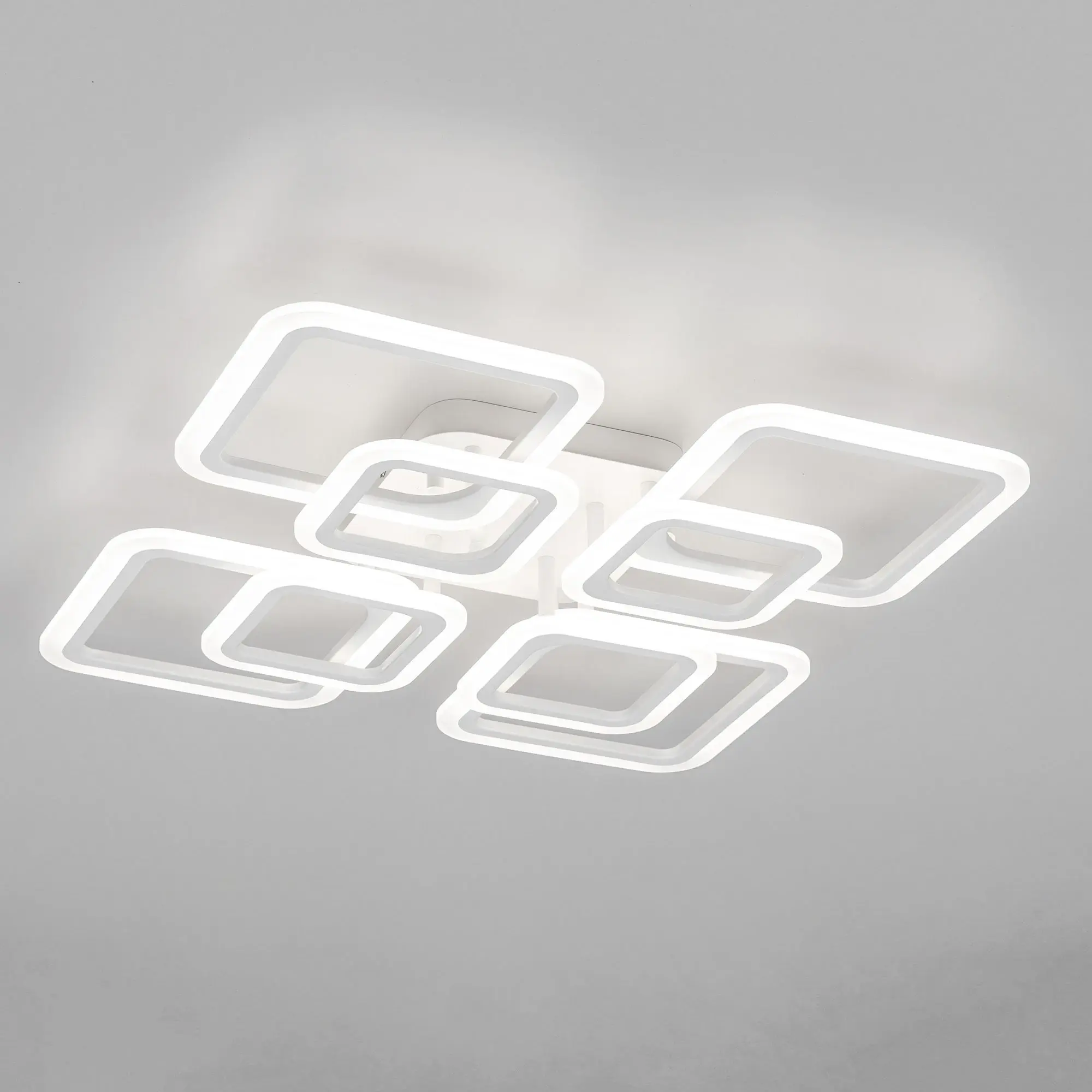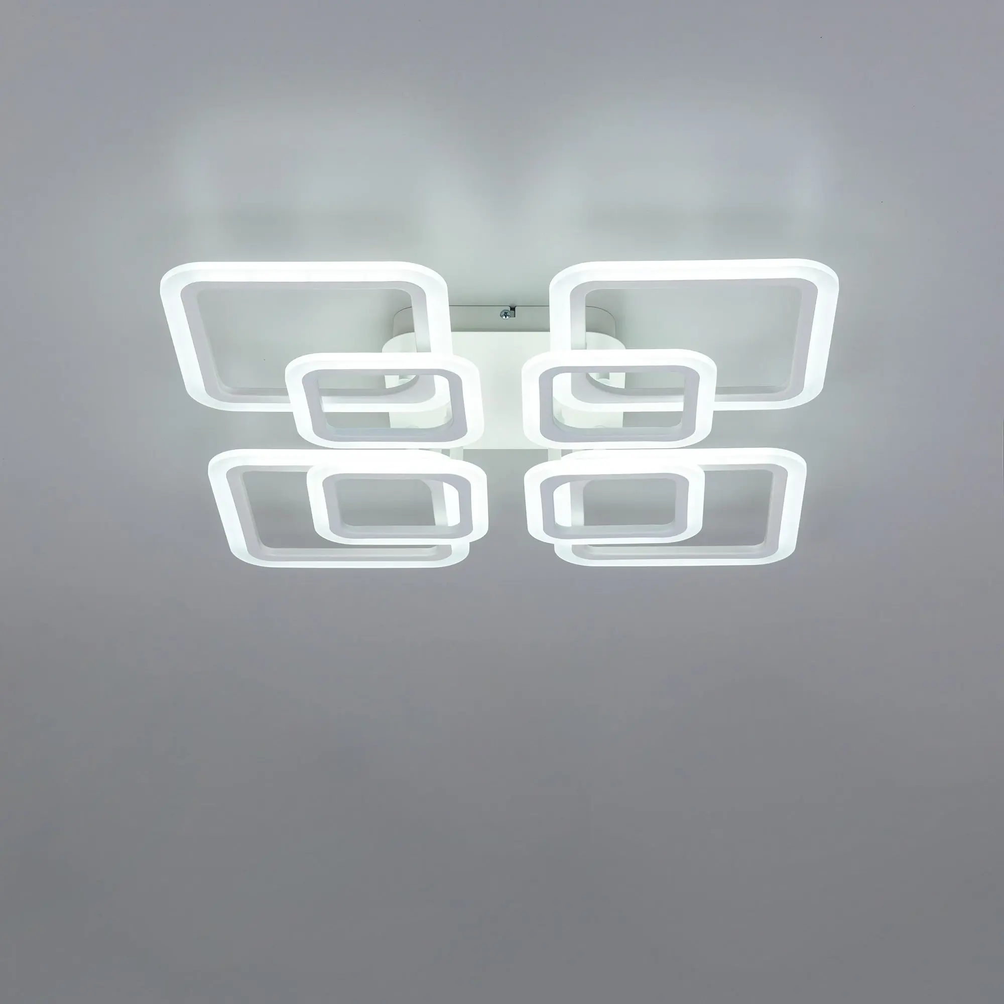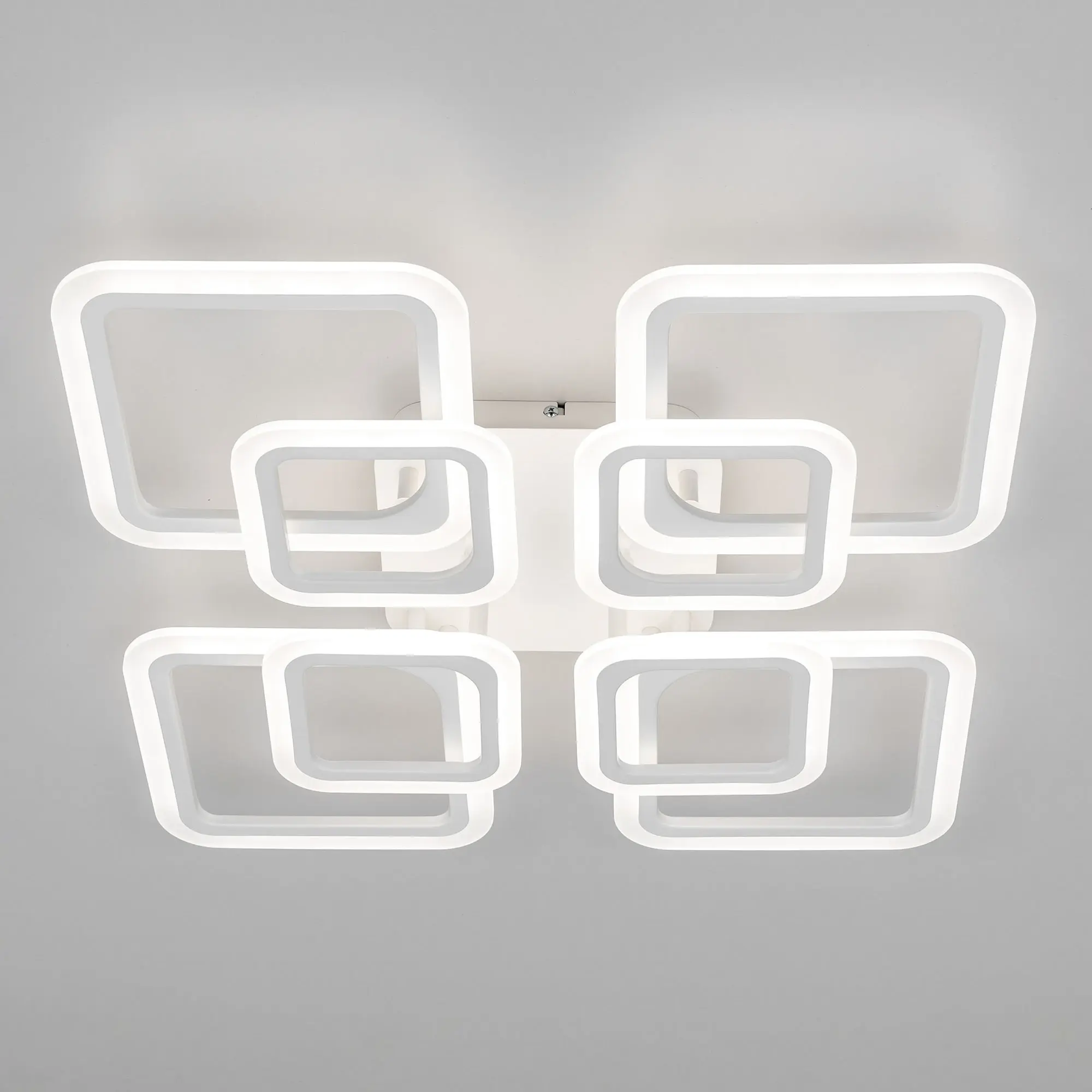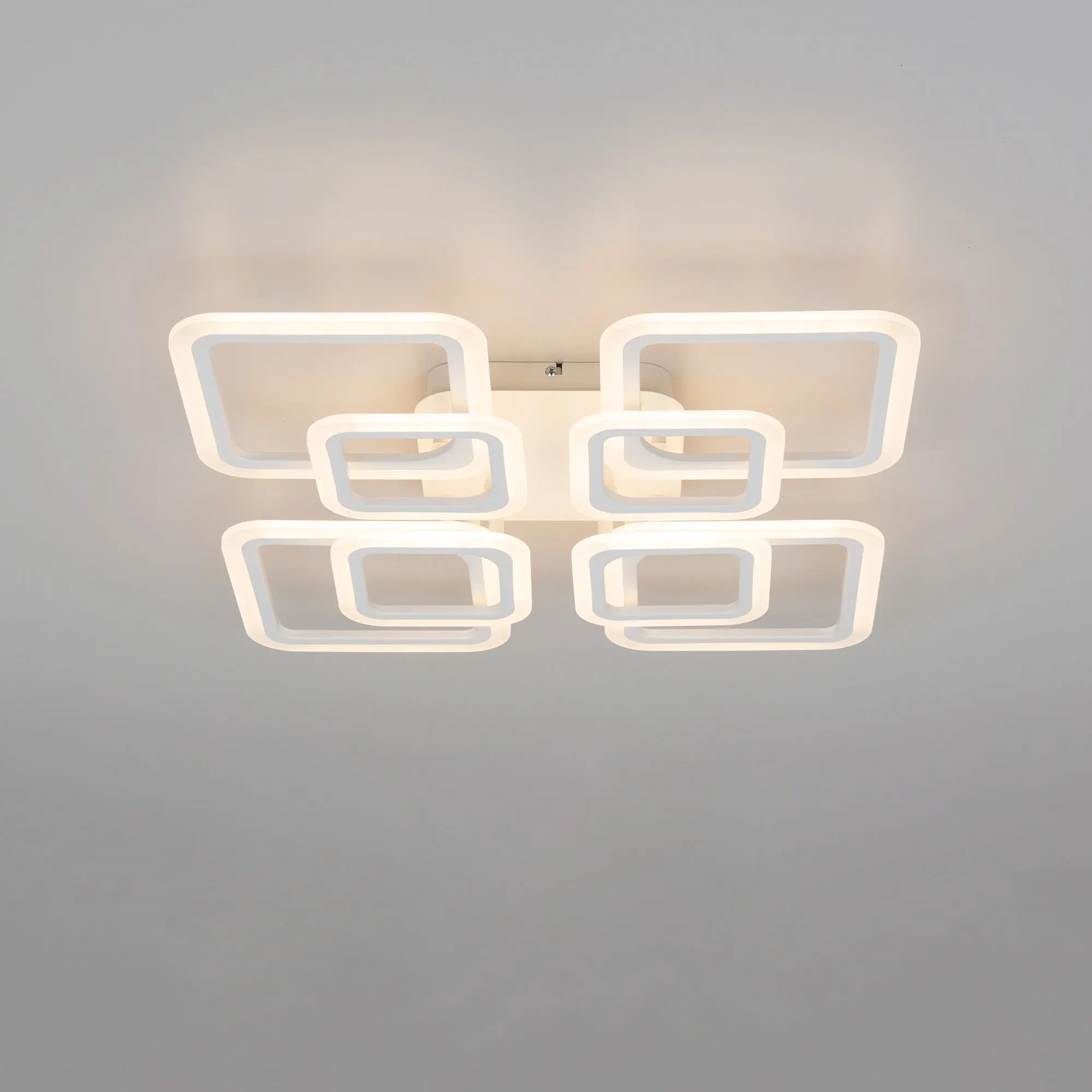 Светодиодная потолочная люстра Citilux Марсель CL232180R с пультом дистанционного управления. Металлическое основание и восемь светодиодных модулей плафонов, формирующих внешний вид люстры, имеют квадратную форму. Корпус плафонов металлический, рассеиватель из оптического полимера. Люстрой можно управлять с помощью пульта дистанционного управления и настенным выключателем. Изделие оснащено яркими светодиодами, с возможностью плавной регулировки яркости от 10% до 100%. Цветовая температура регулируется в диапазоне от 3000К до 5500К, позволяя настроить любые оттенки теплого, нейтрального или холодного света, без мерцания и пульсаций. Есть настраиваемые режимы памяти и таймер выключения. Модель подходит для всех типов потолков, в том числе натяжных, тип крепления – планка. Пульт ДУ в комплекте, тип батареек ААА (батарейками не комплектуется). Люстра плоская – высота всего 11см, размер 60х60см, мощность 110Вт, световой поток 11000Лм.,