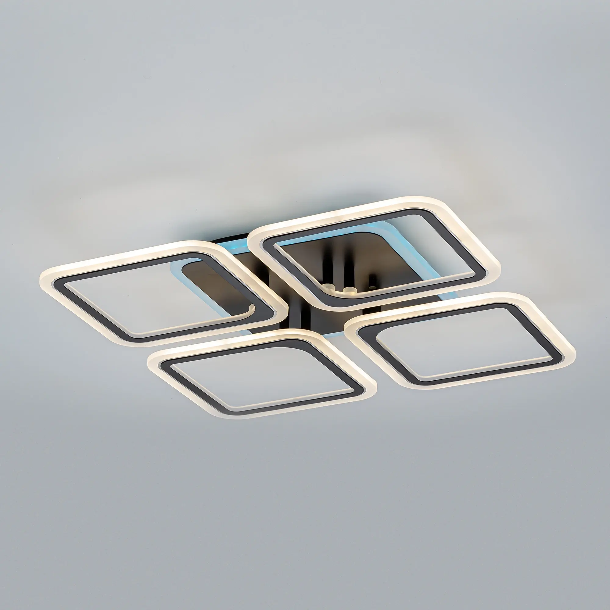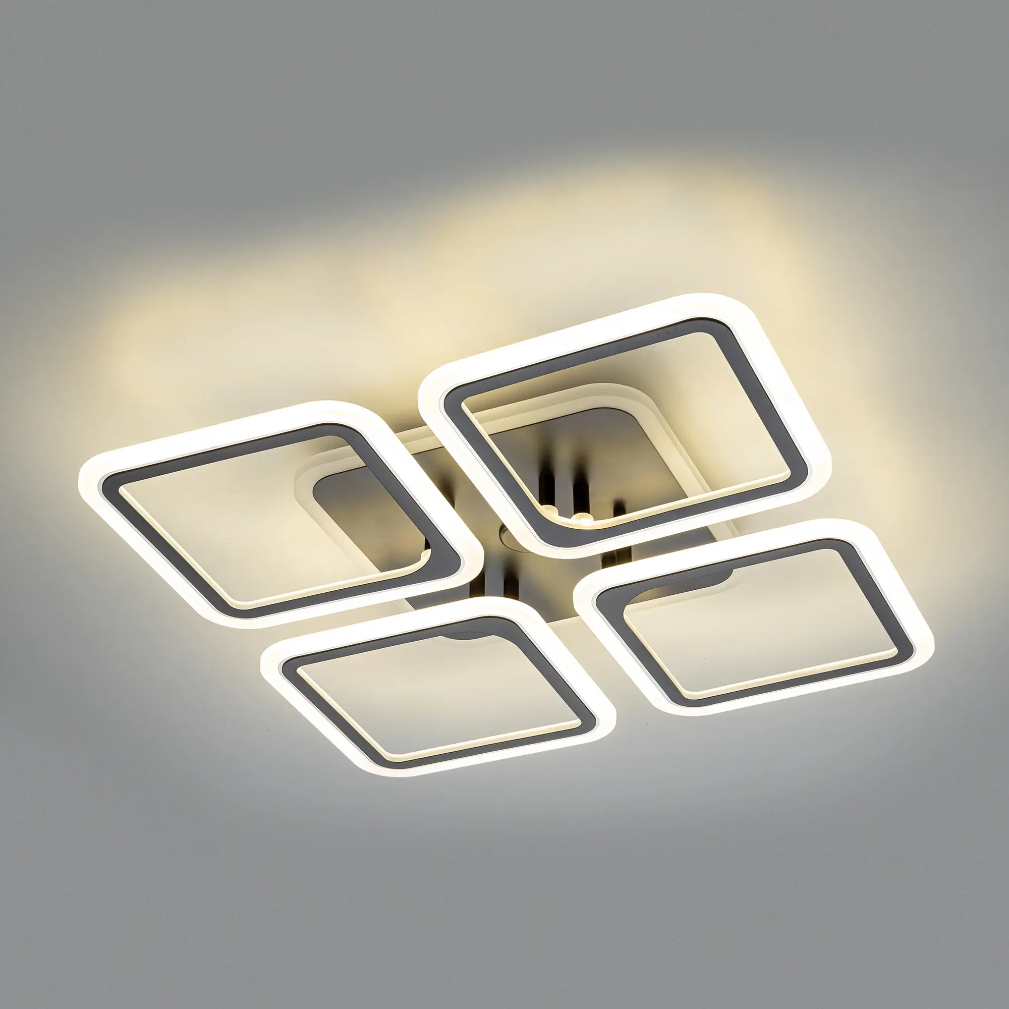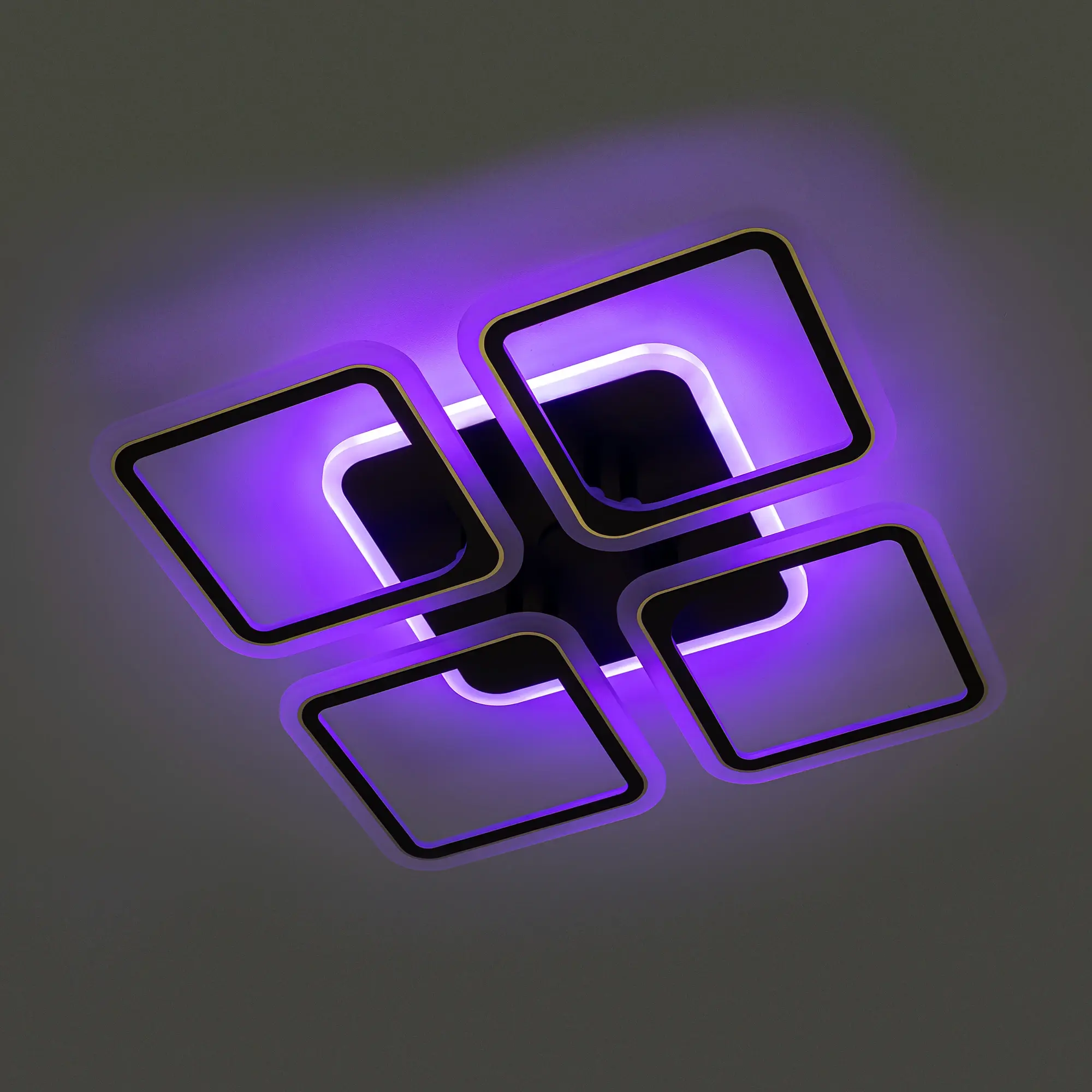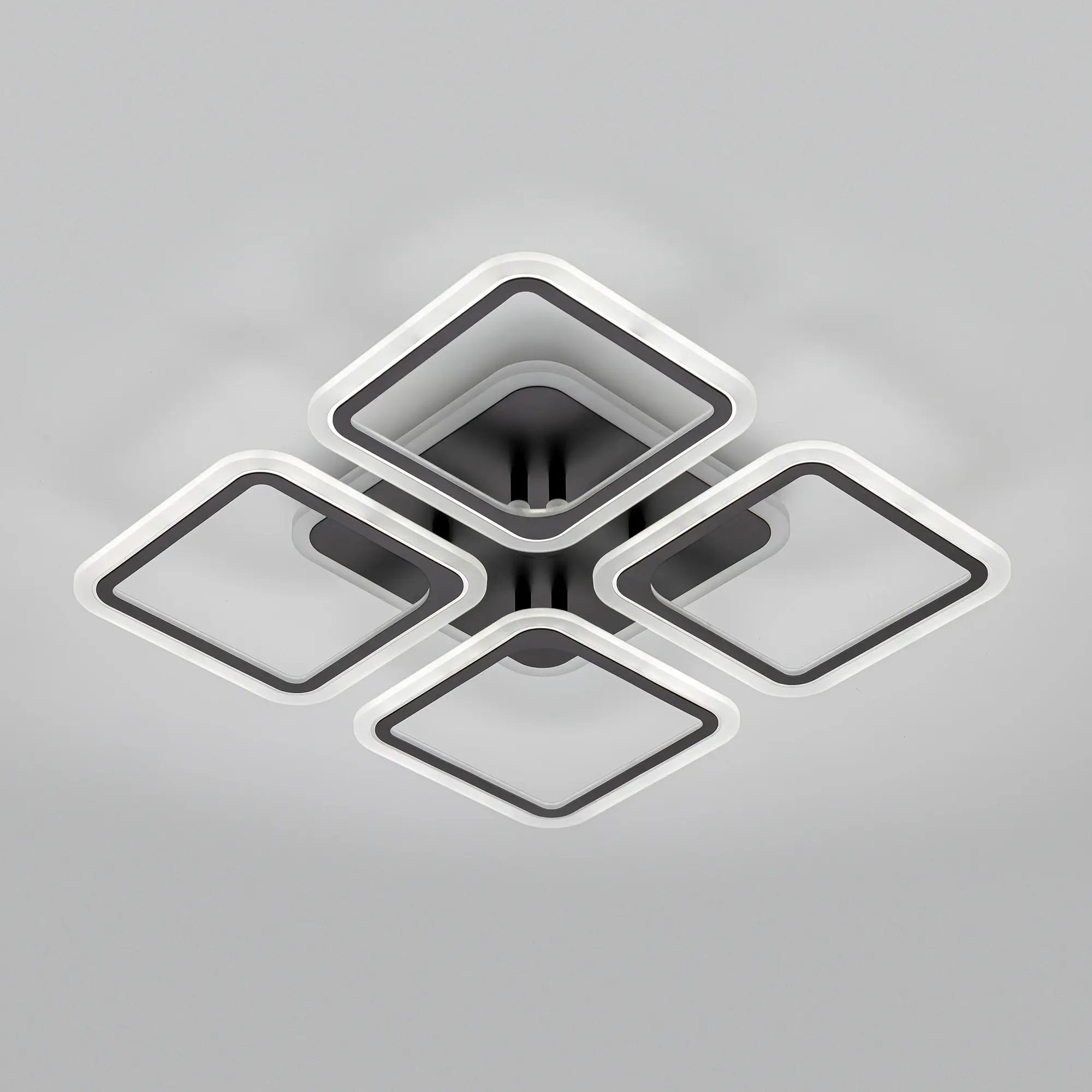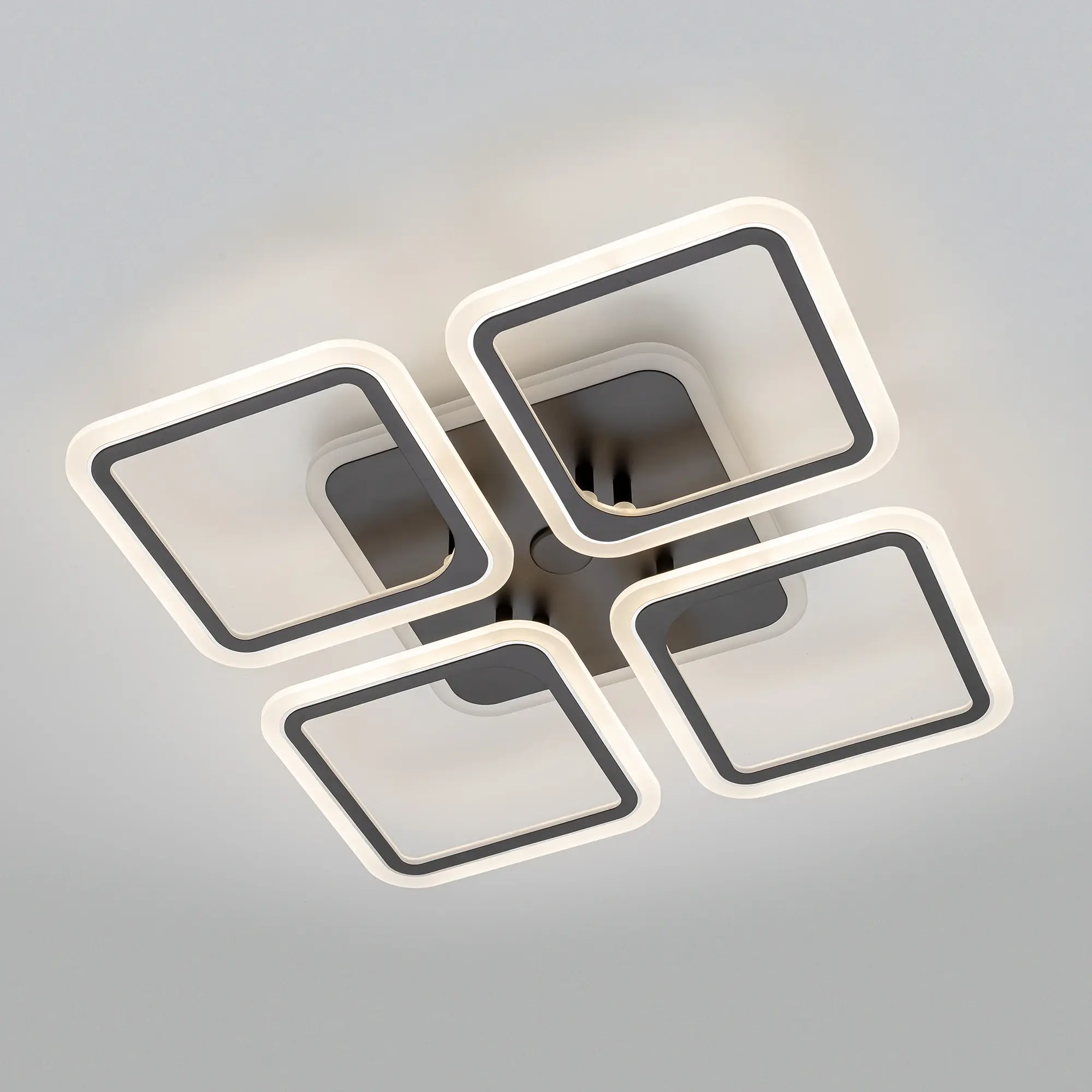 Светильник коричневого (кофейного) цвета, основание и четыре светодиодных модуля плафона, формирующих внешний вид люстры, квадратной формы. Корпус плафонов коричневого цвета изготовлен из металла, рассеиватель белый матовый из оптического полимера. Модель подходит для всех типов потолков, в том числе натяжных.