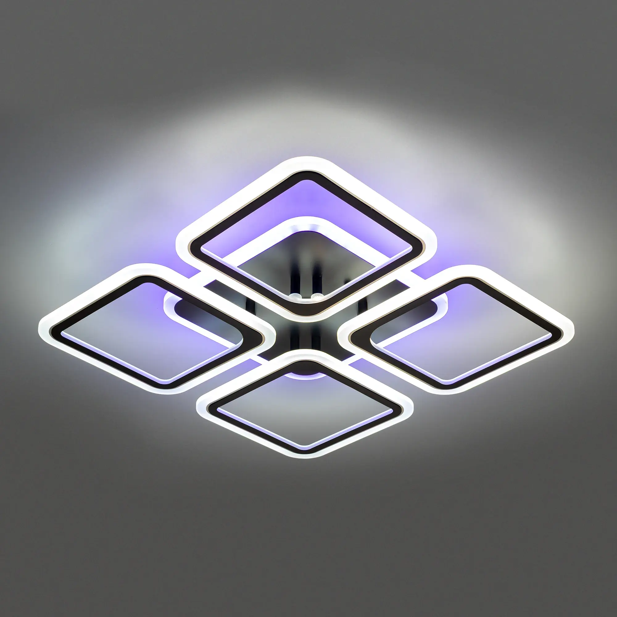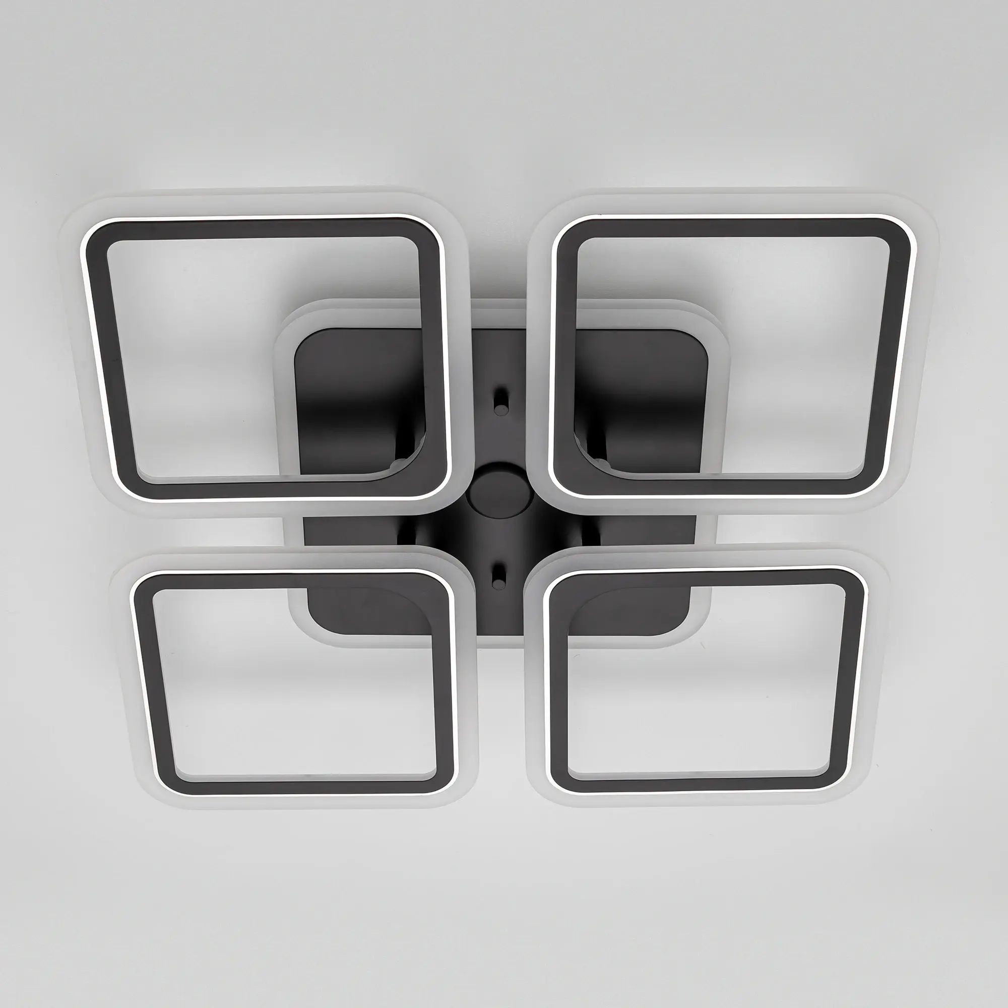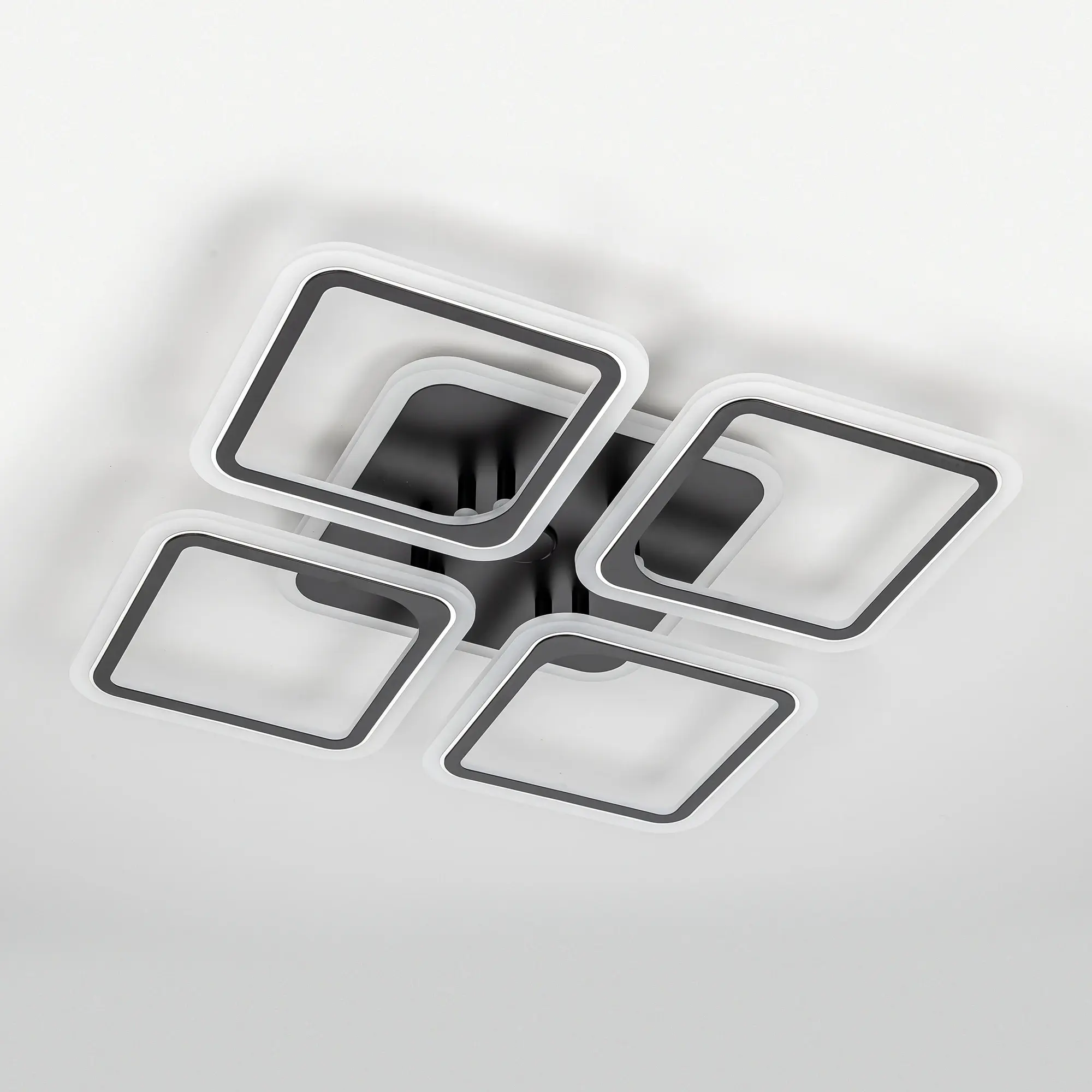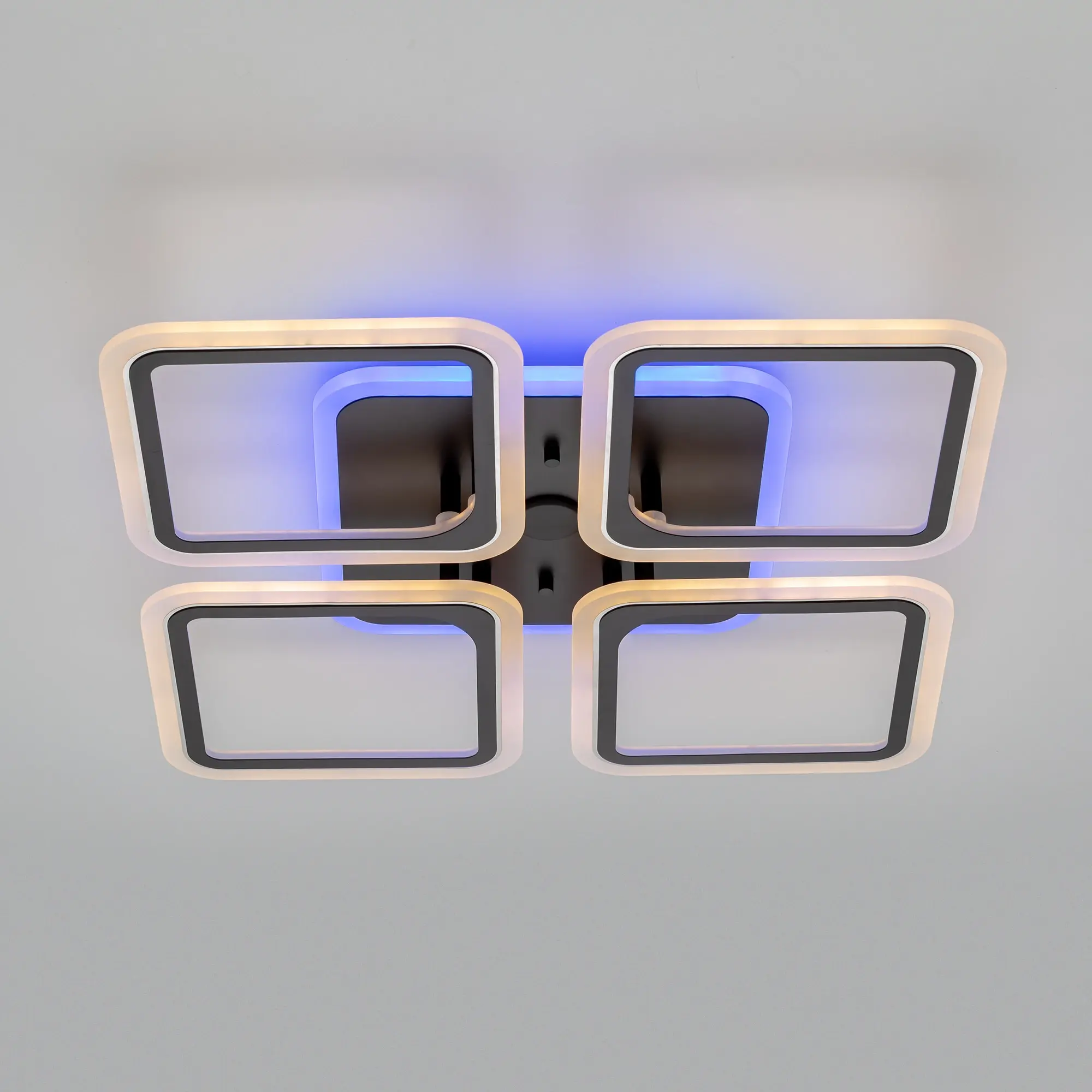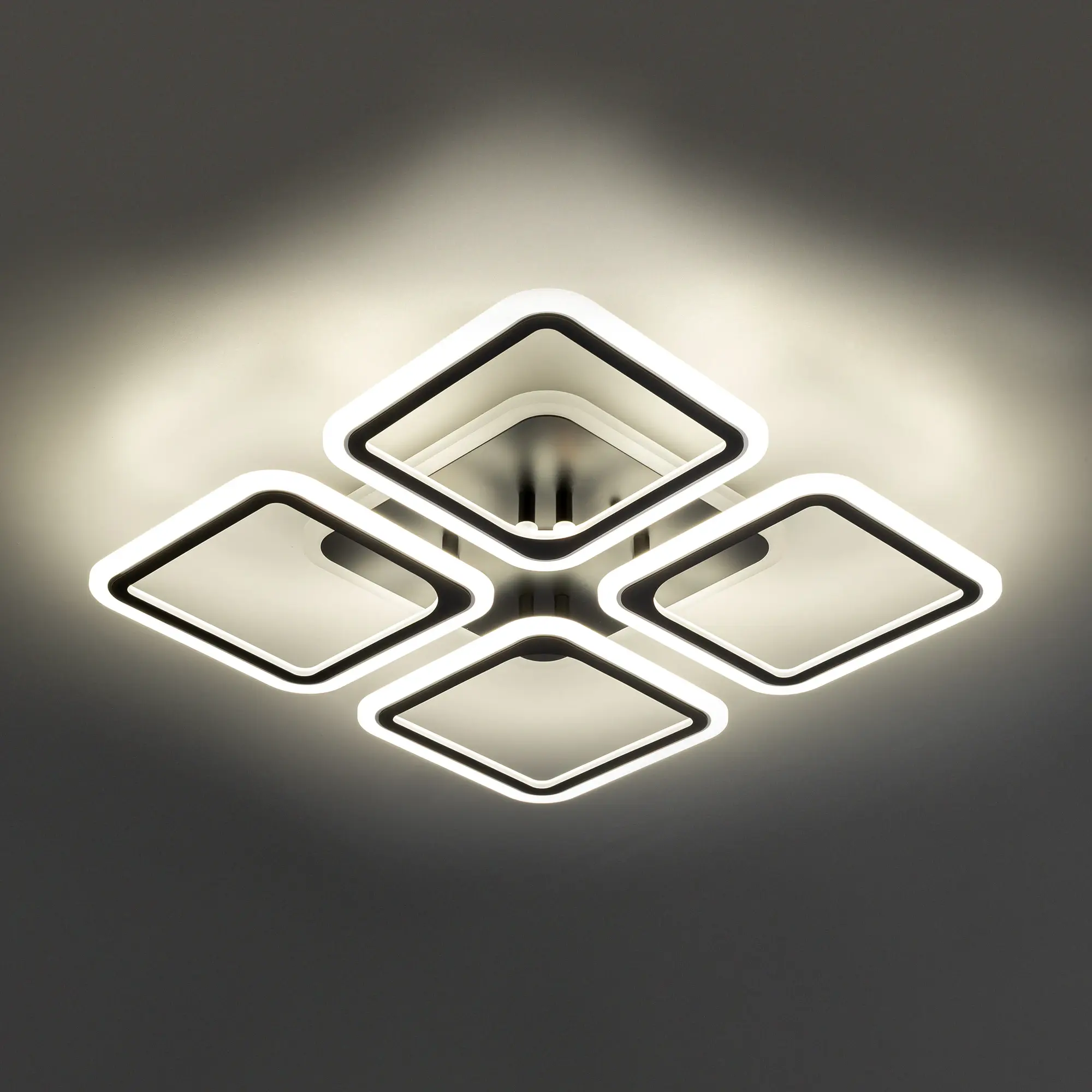 Светильник коричневого (кофейного) цвета, основание и четыре светодиодных модуля плафона, формирующих внешний вид люстры, квадратной формы. Корпус плафонов коричневого цвета изготовлен из металла, рассеиватель белый матовый из оптического полимера. Модель подходит для всех типов потолков, в том числе натяжных.