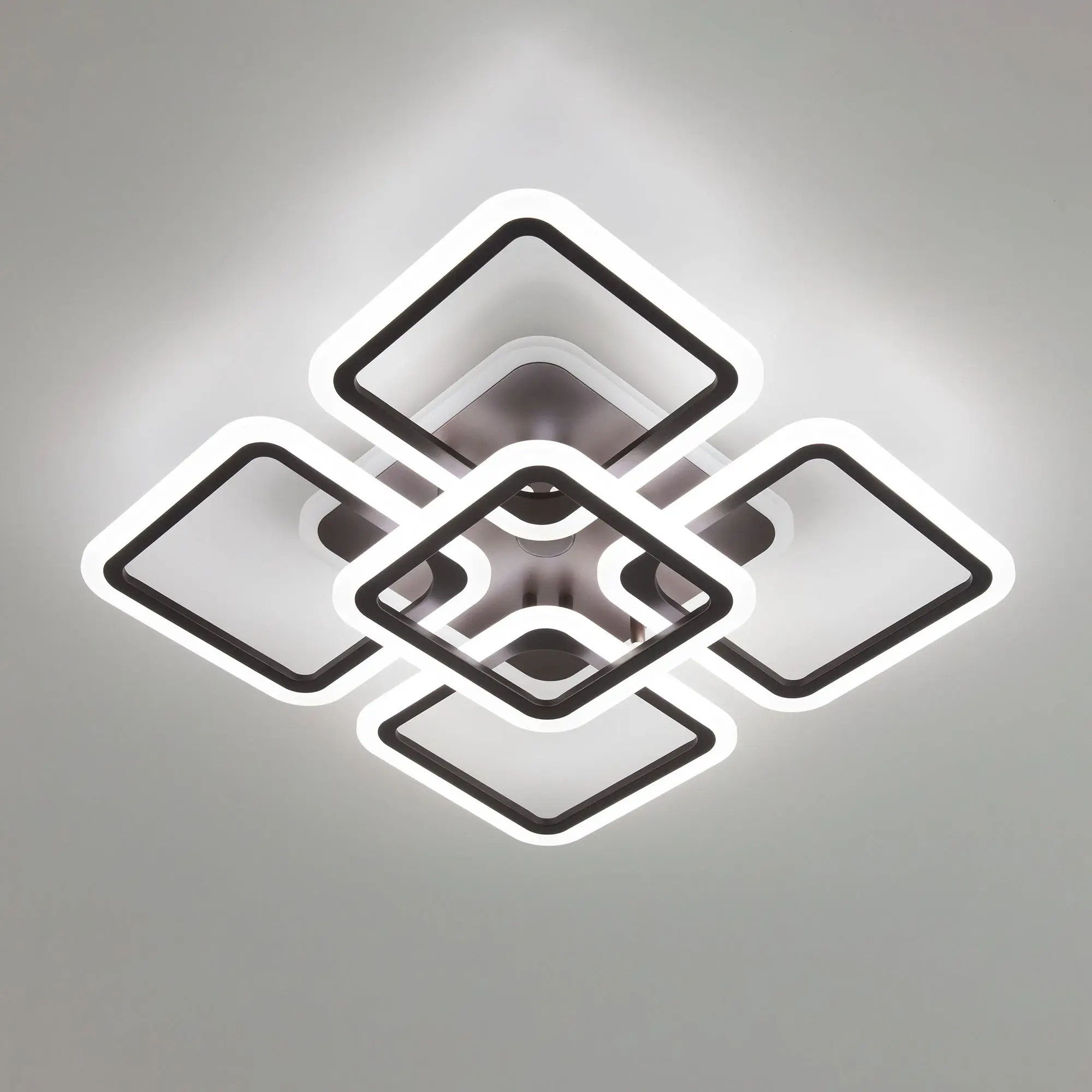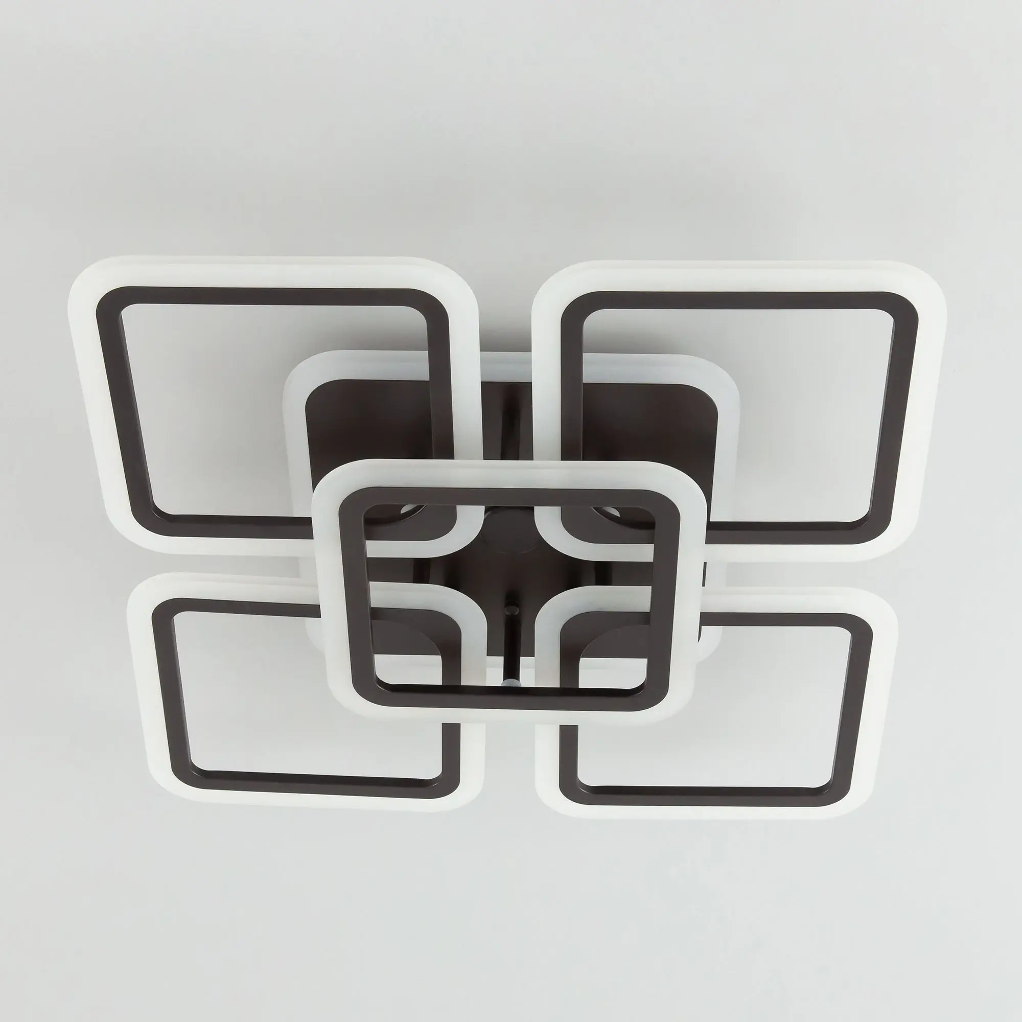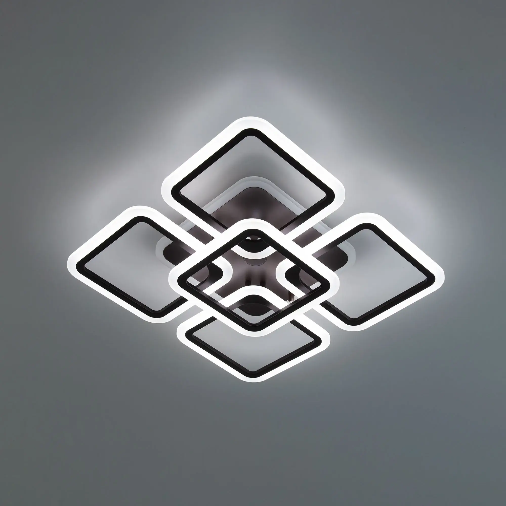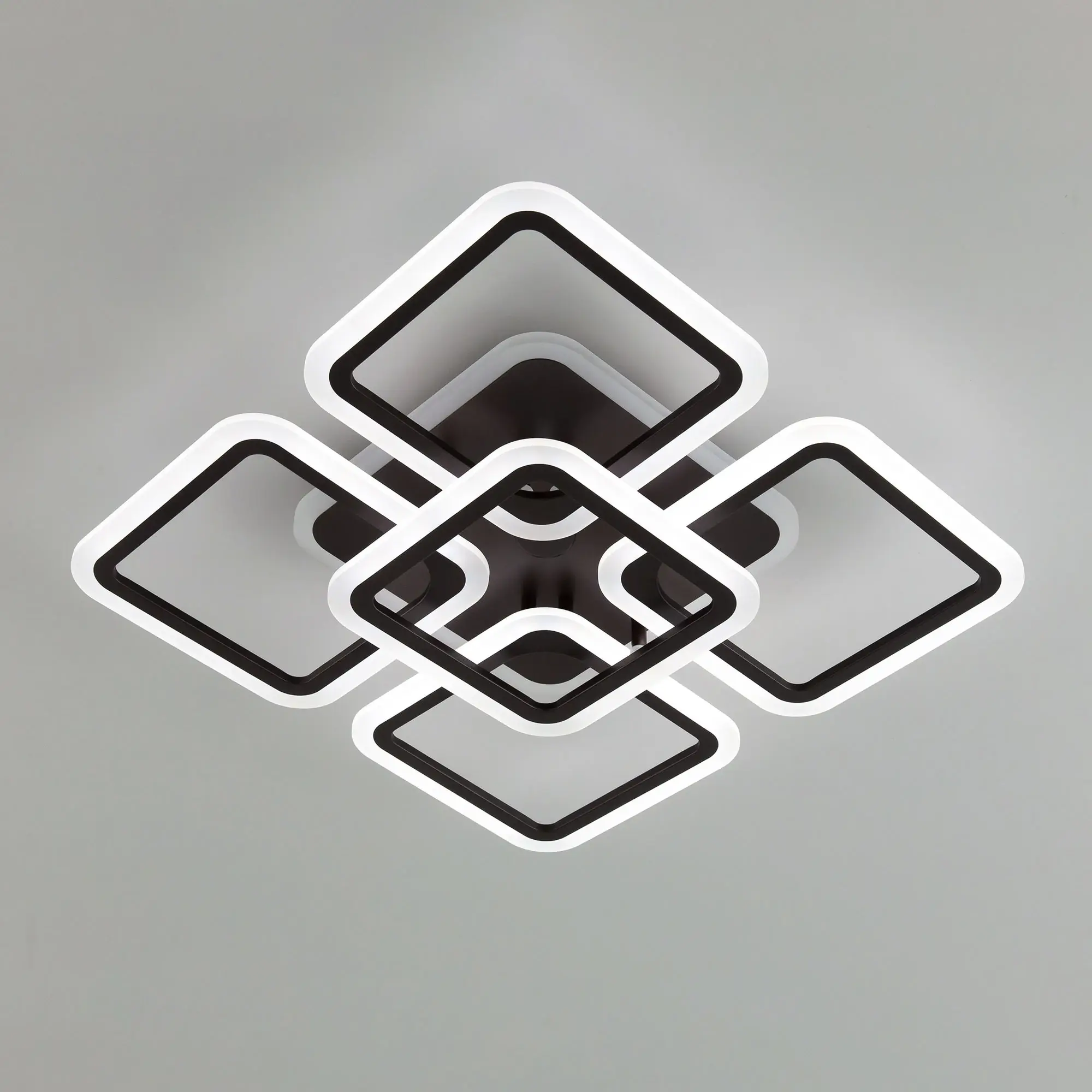 Светильник чёрного цвета, металлическое основание и пять светодиодных модулей плафонов квадратной формы. Корпус плафонов металлический, рассеиватель из оптического полимера. Модель подходит для всех типов потолков, в том числе натяжных.
