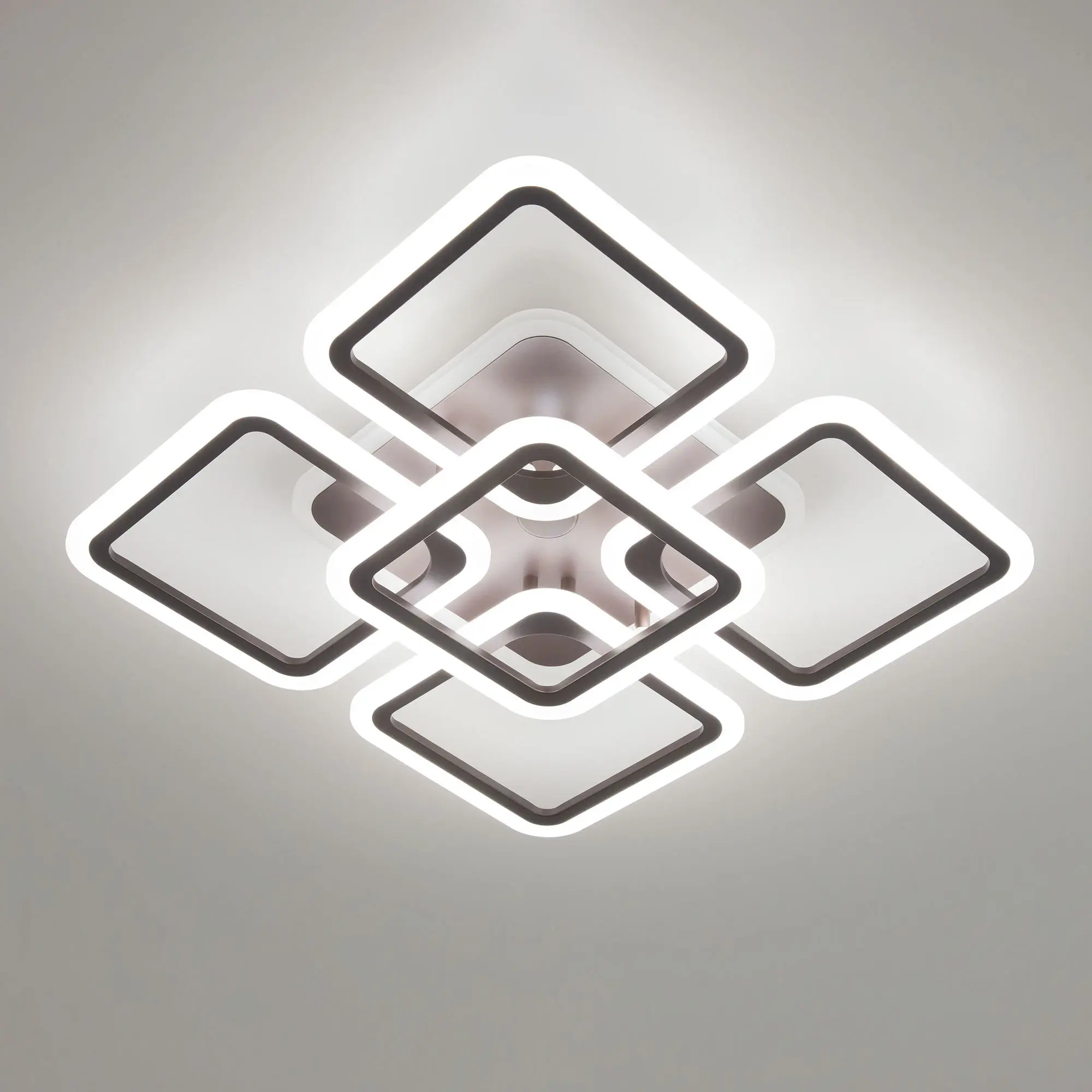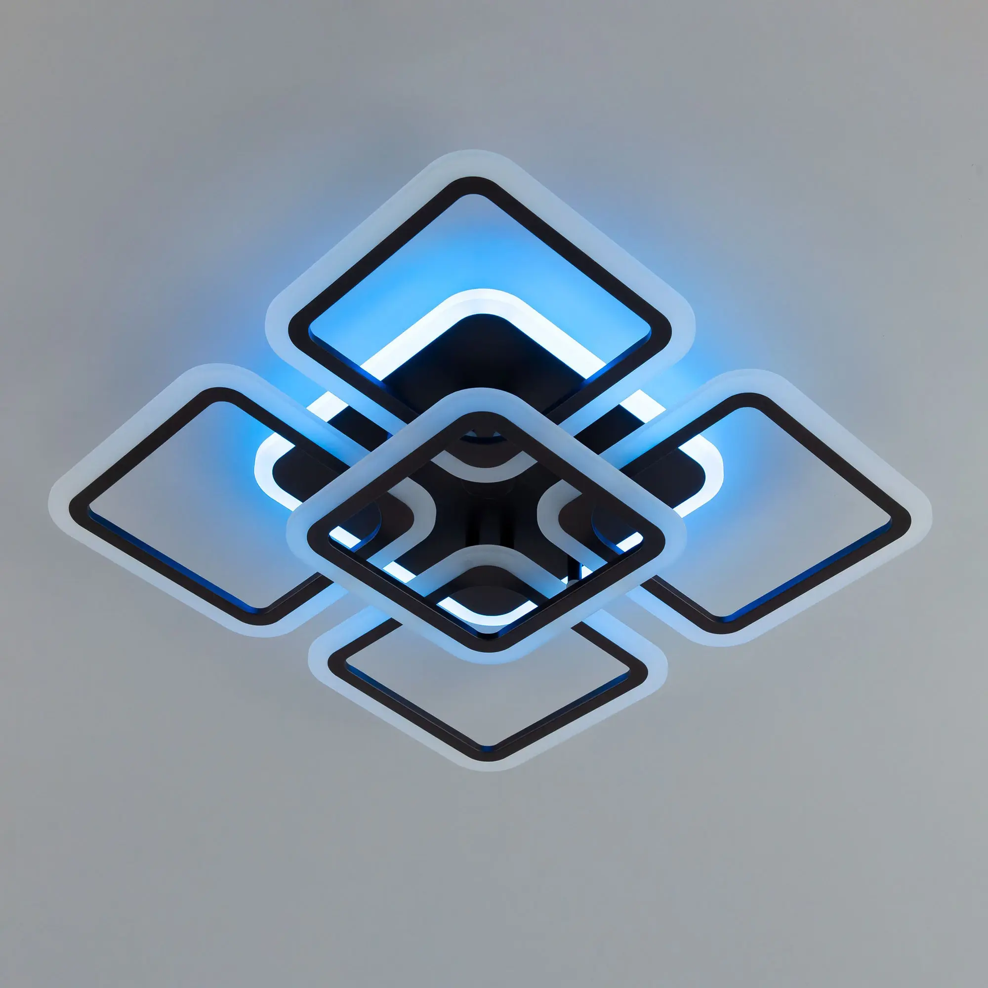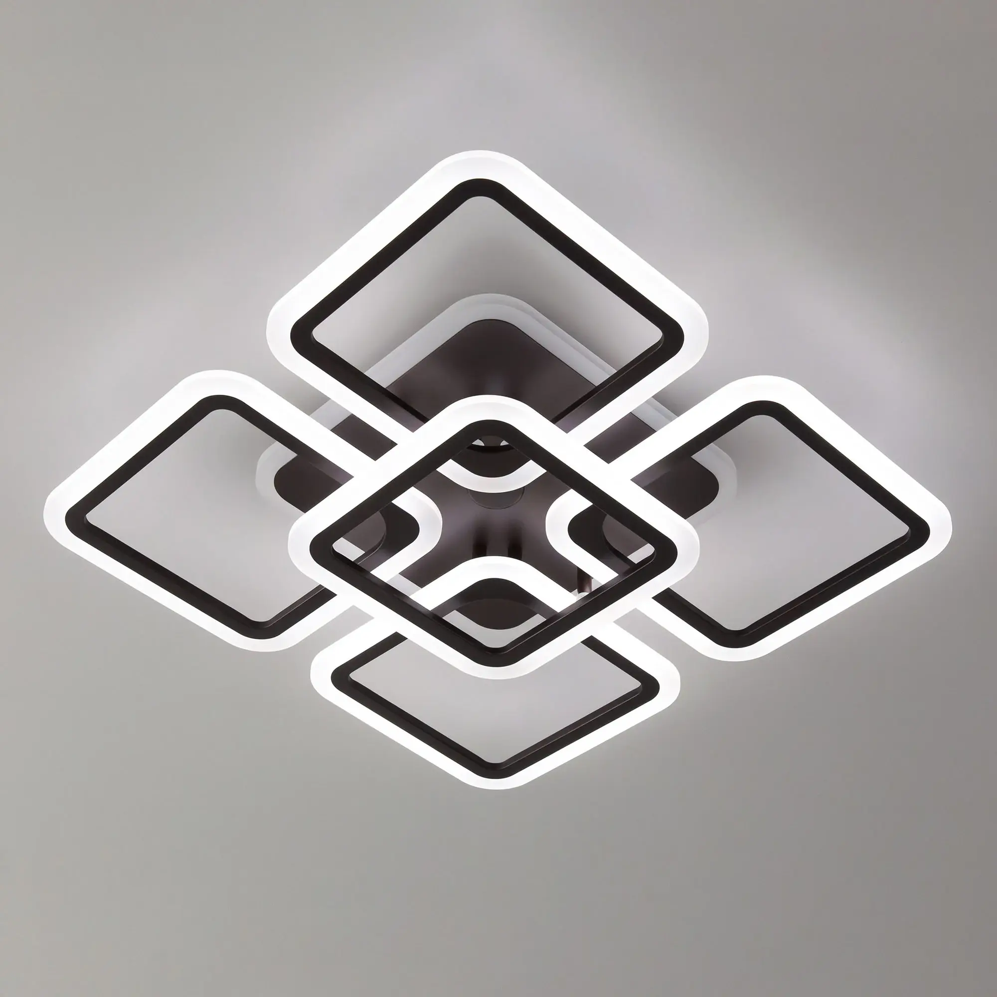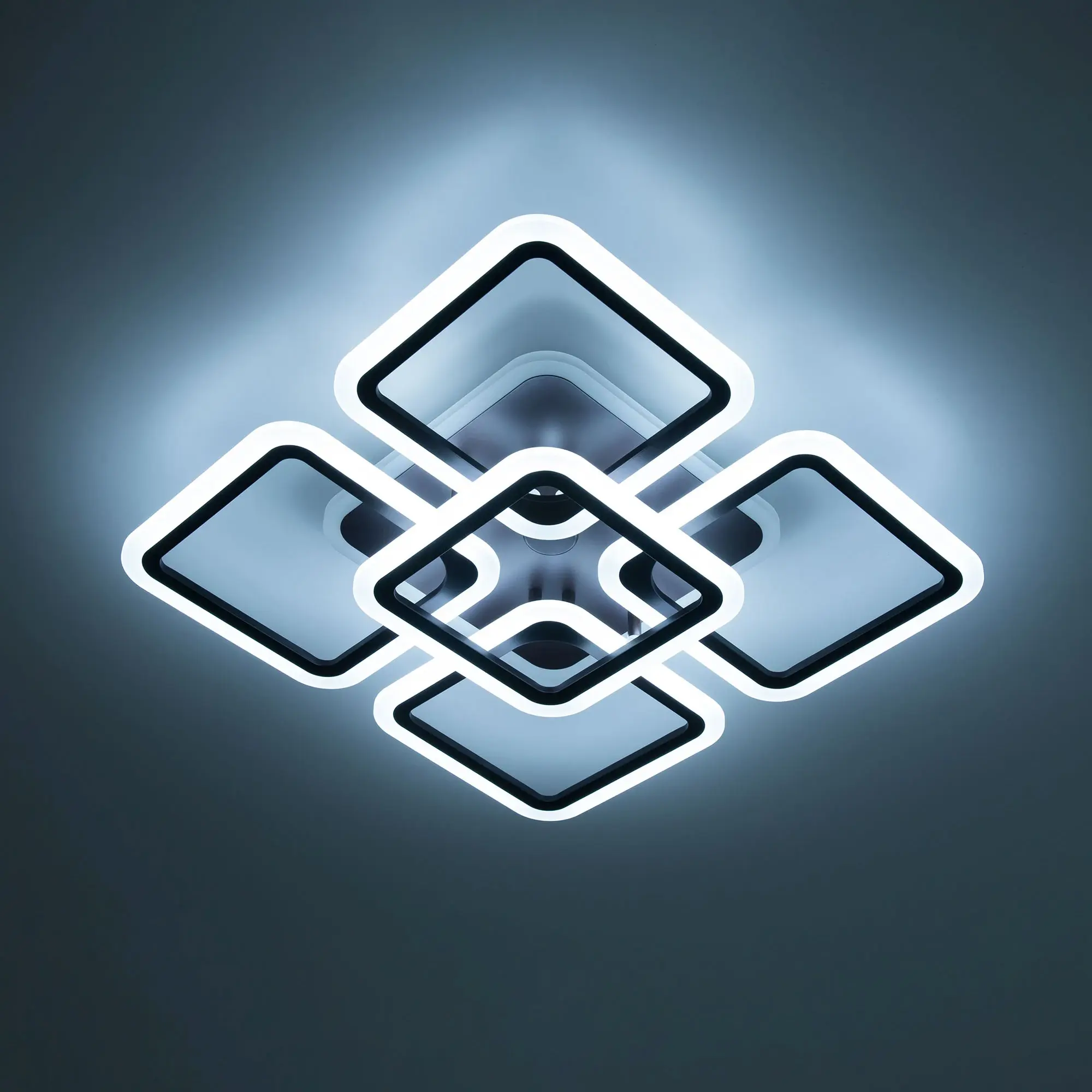 Светильник чёрного цвета, металлическое основание и пять светодиодных модулей плафонов квадратной формы. Корпус плафонов металлический, рассеиватель из оптического полимера. Модель подходит для всех типов потолков, в том числе натяжных.