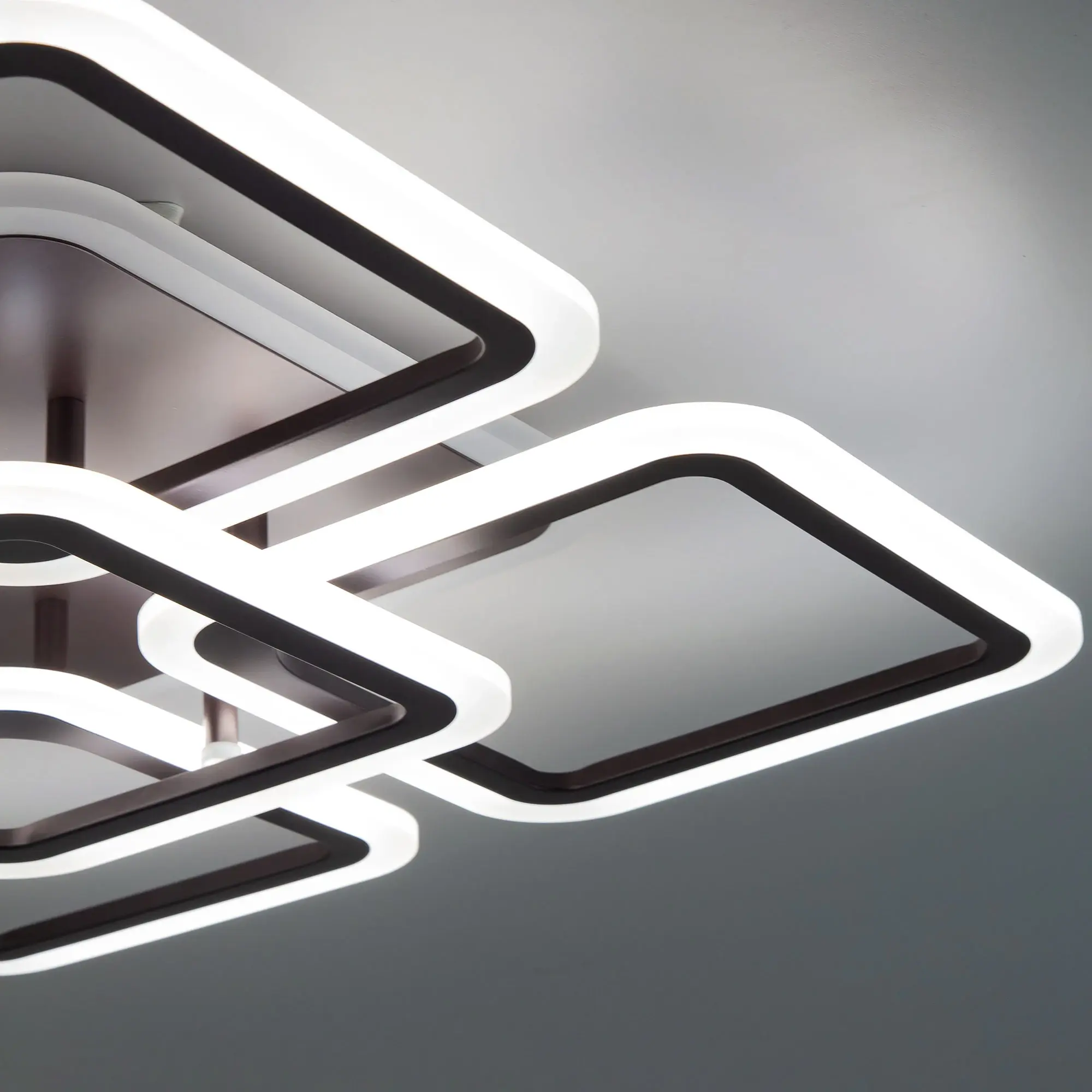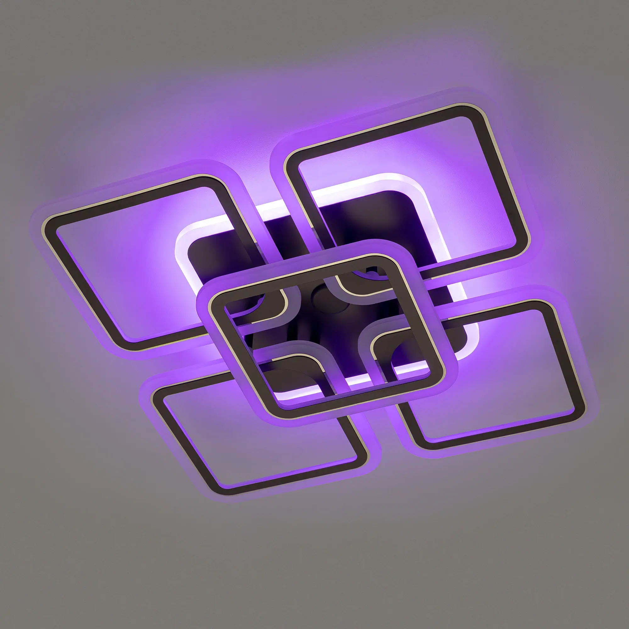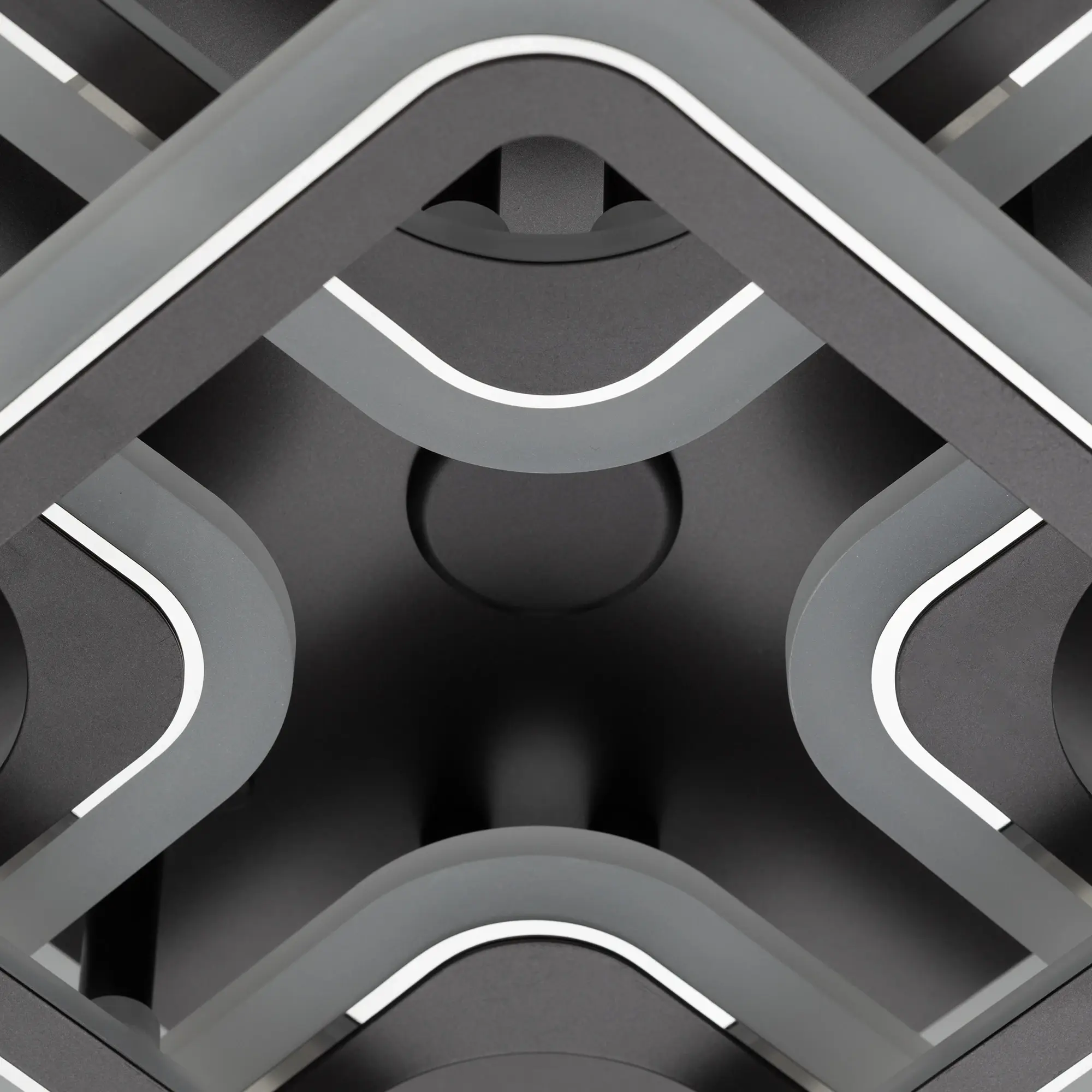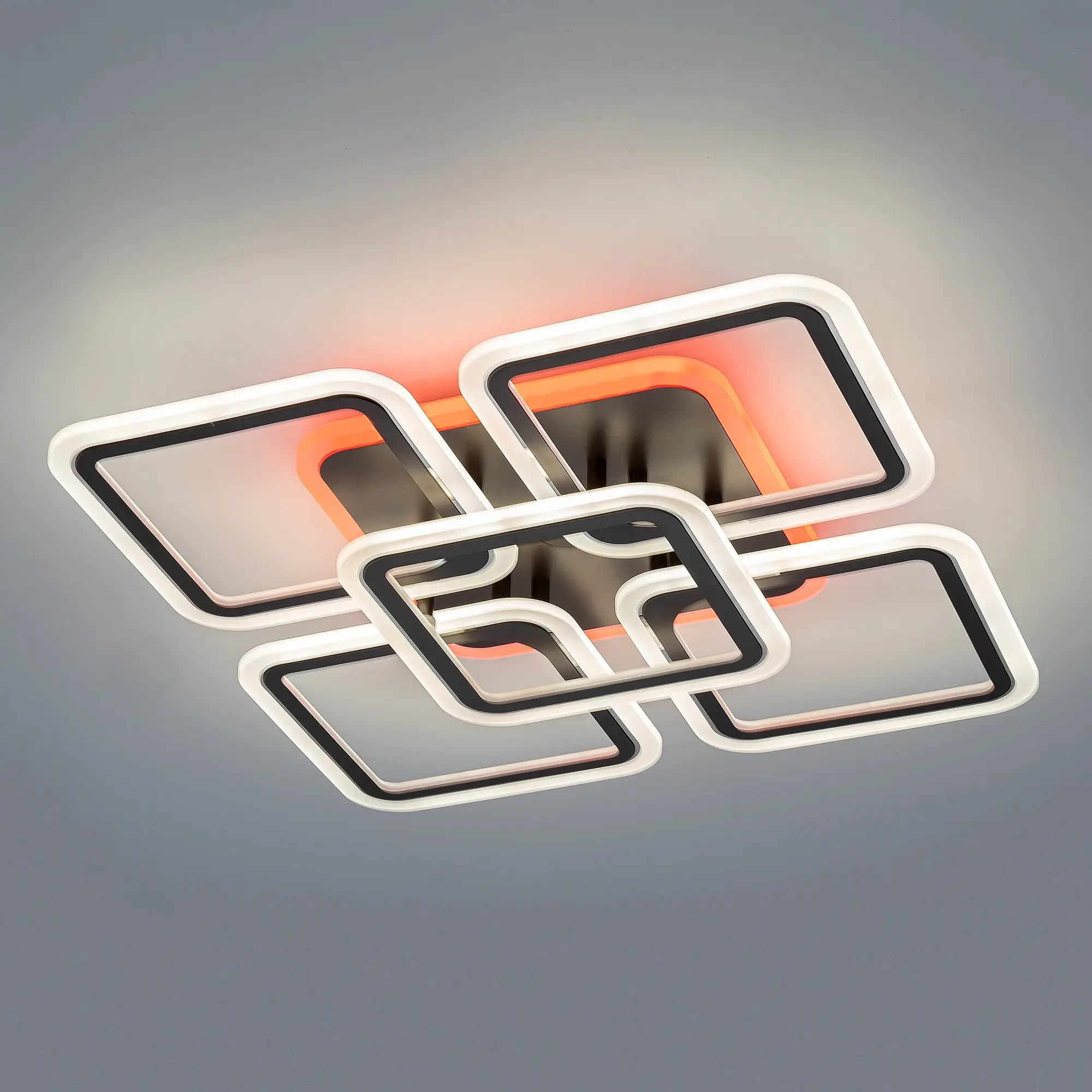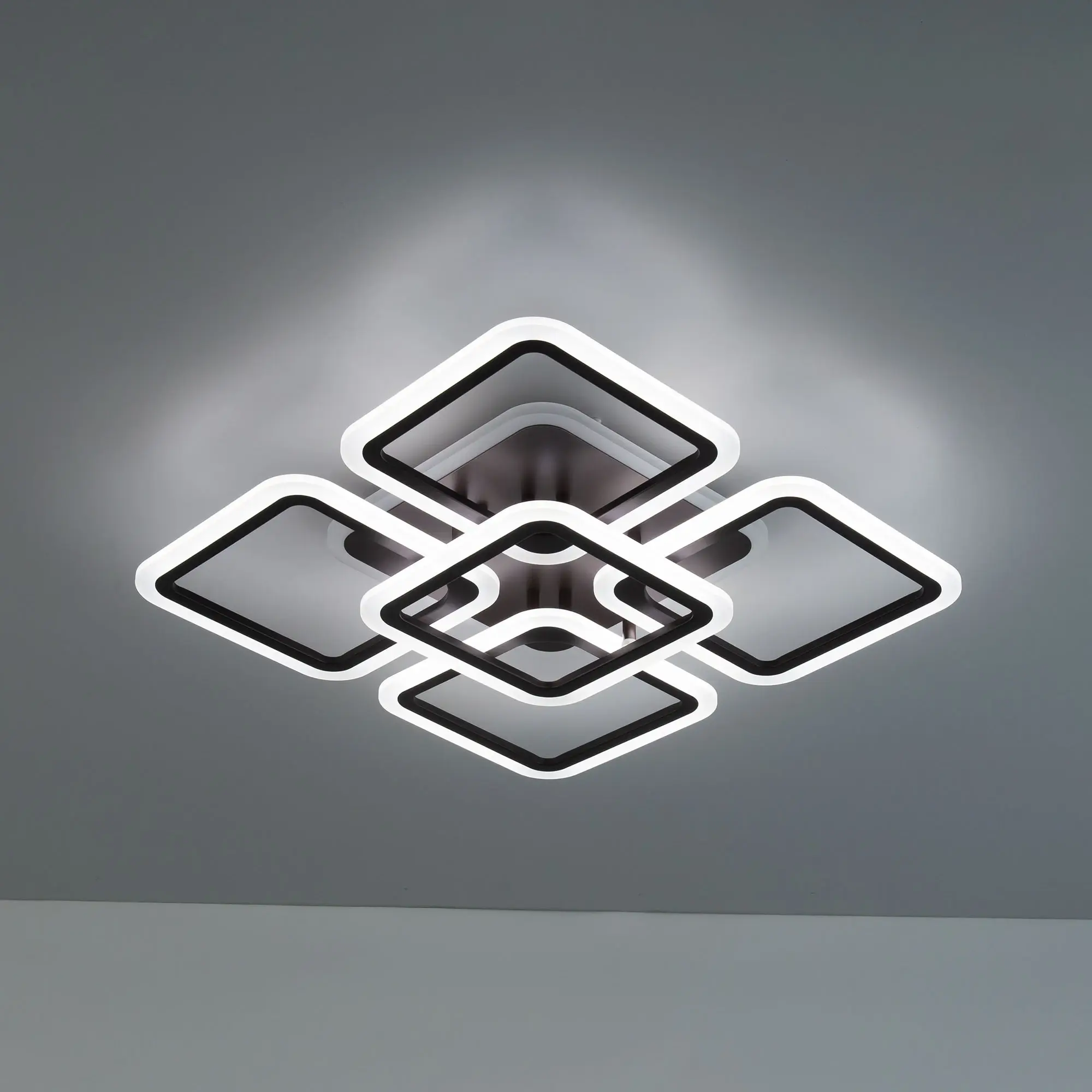 Светильник чёрного цвета, металлическое основание и пять светодиодных модулей плафонов квадратной формы. Корпус плафонов металлический, рассеиватель из оптического полимера. Модель подходит для всех типов потолков, в том числе натяжных.