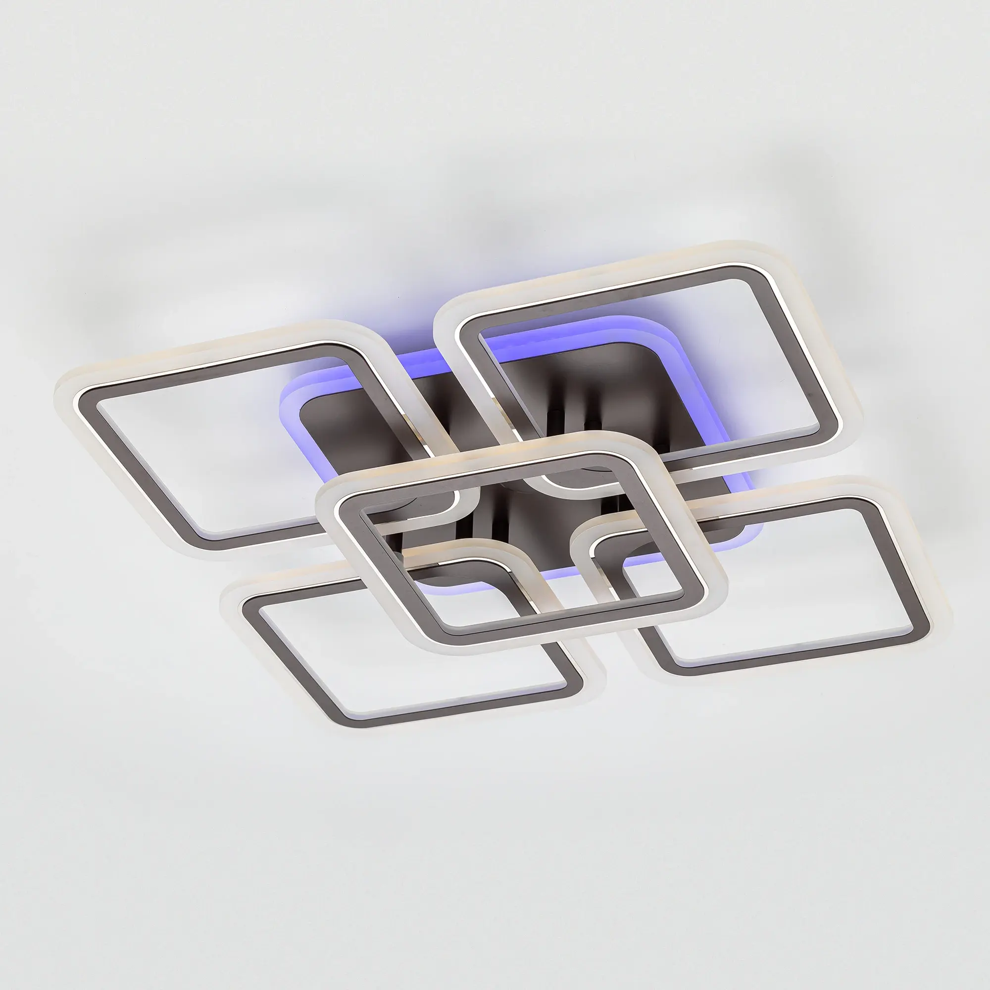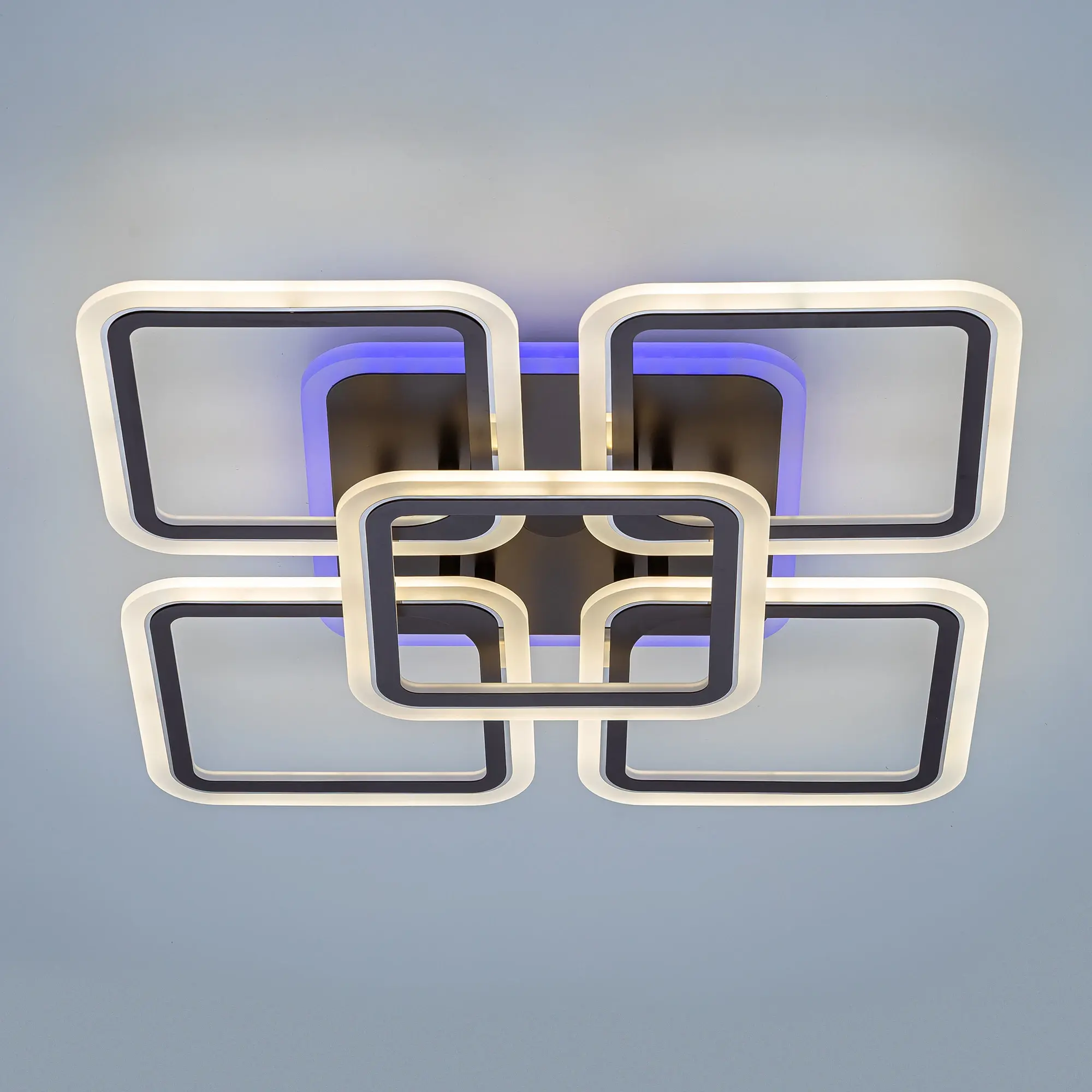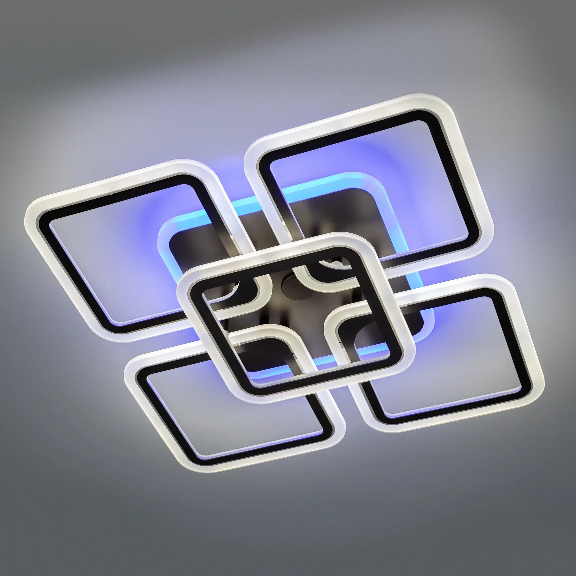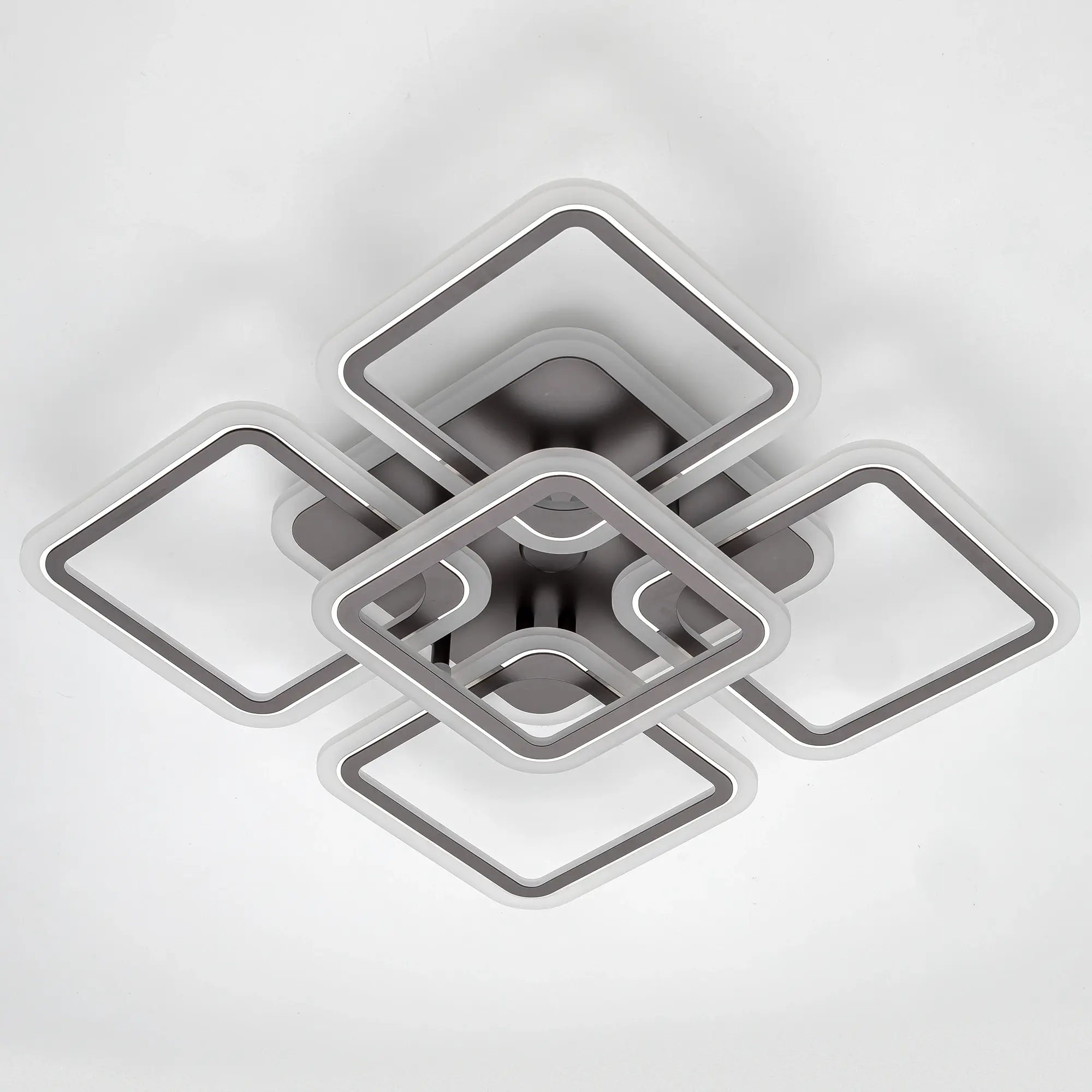Светильник чёрного цвета, металлическое основание и пять светодиодных модулей плафонов квадратной формы. Корпус плафонов металлический, рассеиватель из оптического полимера. Модель подходит для всех типов потолков, в том числе натяжных.