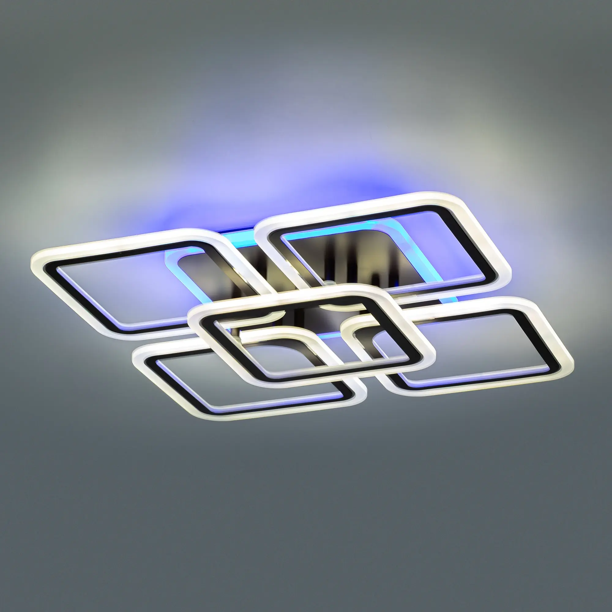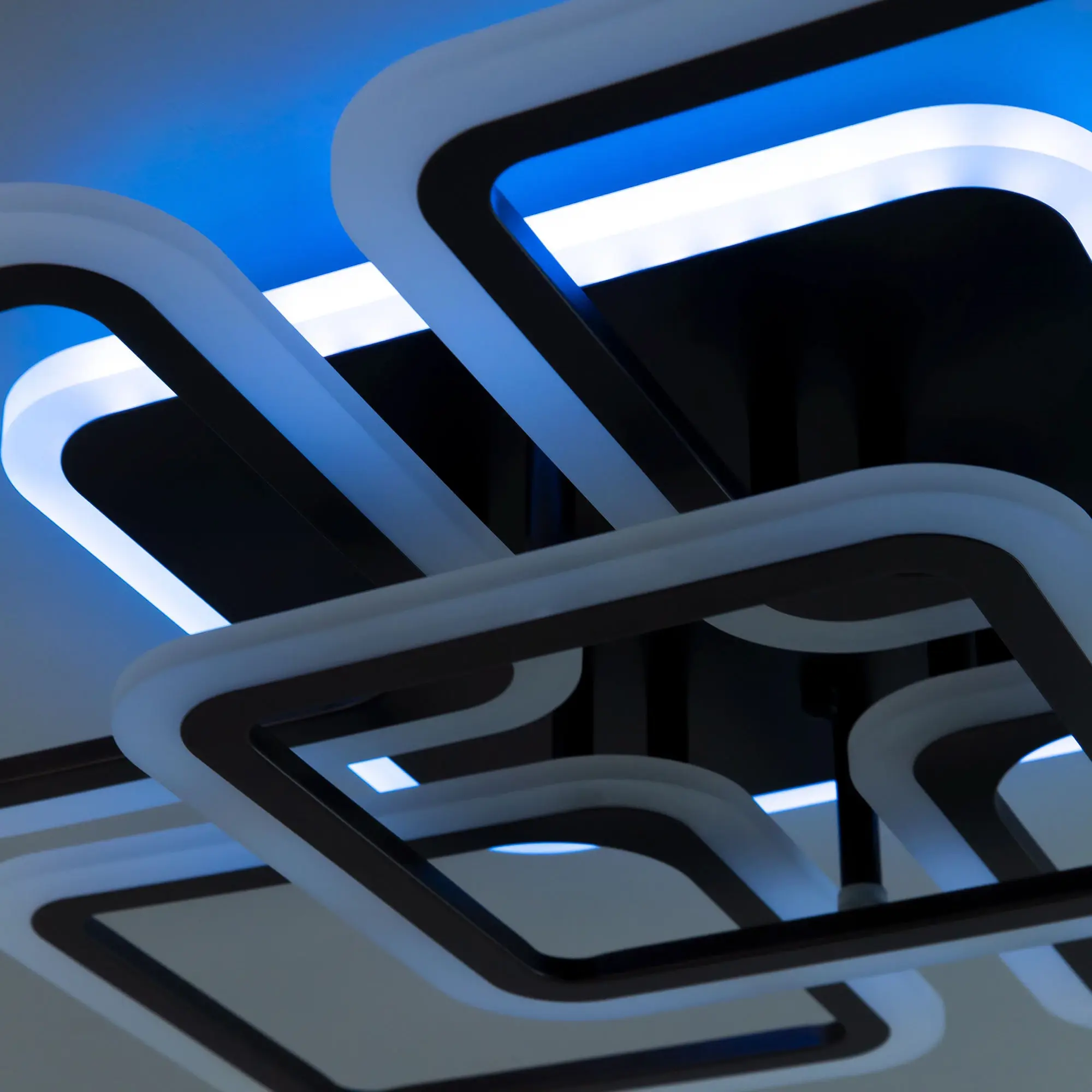 Модель оснащена мощными светодиодами, с возможностью плавной регулировки яркости от 10 до 100%. Цветовая температура регулируется в диапазоне от 3000К до 5500К, позволяя настроить любые оттенки теплого, нейтрального или холодного света. В основании светильника установлена независимая цветная RGB подсветка. Мощность люстры 75Вт, 6800Лм, площадь освещения при стандартной высоте потолков около 24 кв. метра. Пульт ДУ в комплекте, тип батареек ААА (батарейками не комплектуется).
