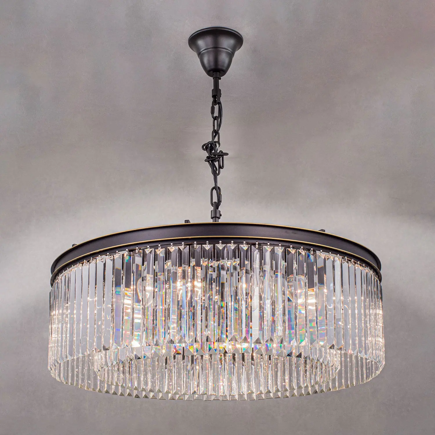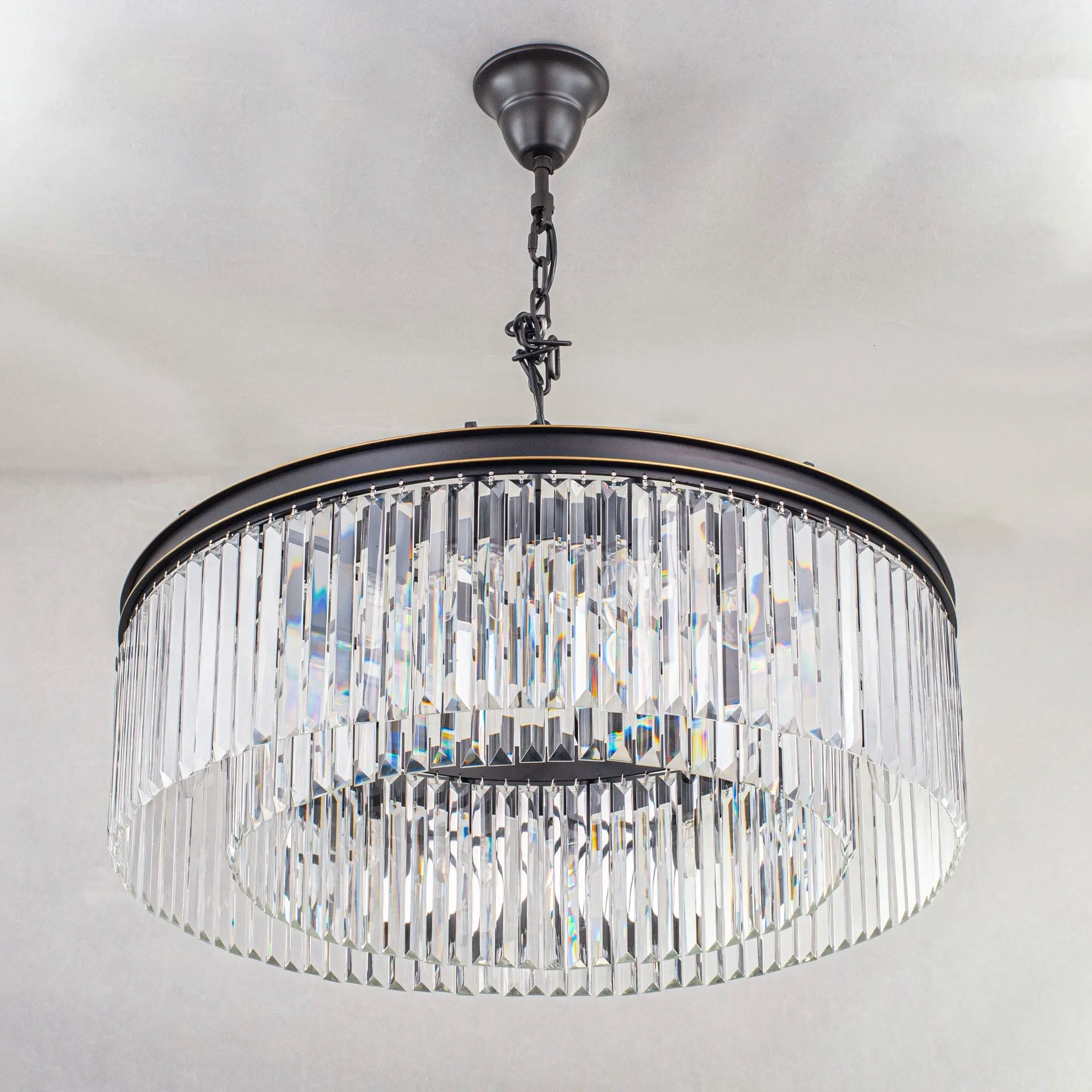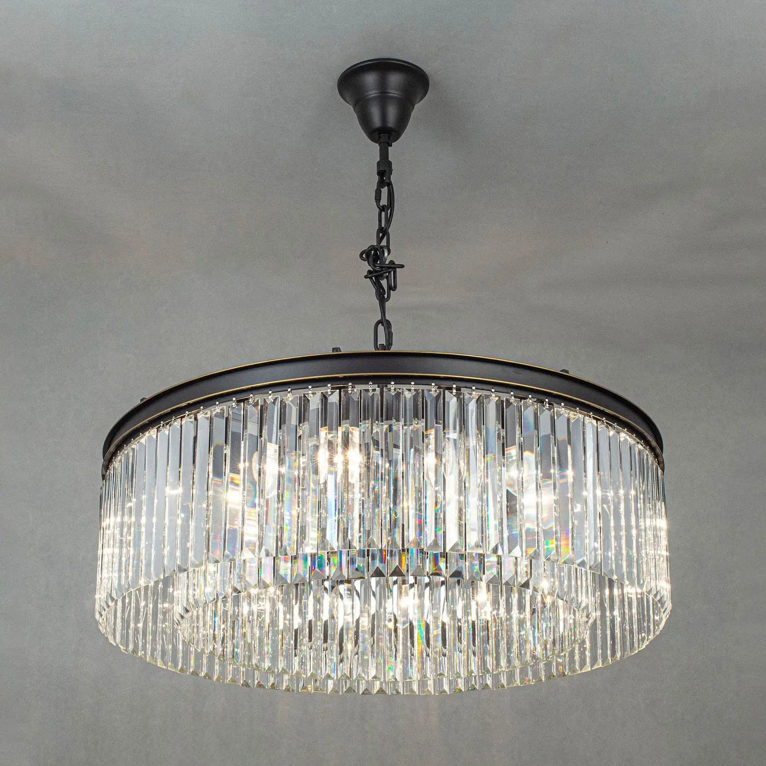 Многие наши покупатели называют люстры из коллекции Мартин брутальными, и с этим сложно не согласиться. При взгляде на массивную металлическую арматуру и огромное количество хрустальных камней вспоминается именно этот эпитет. Словосочетание «хрустальная люстра» априори веет признаком благополучия и достатка в доме. Современные модели хрустальных светильников коллекции Мартин принесут в жилище именно эти ощущения, а ослепительная игра света на хрустальных подвесках всегда будет радовать вас и ваших гостей. Новая модель Мартин создана из хрустальных элементов с минимальным количеством граней, такую огранку хрусталя принято называть – призма. Это решение позволят защитить глаза от свечения открытых ламп, но ни в коем случае не умаляет способностей преломления света хрустальными подвесками светильника. Отражённый свет в помещении заставит сверкать ваш светильник всеми возможными цветами, и удивит неповторимым узором на поверхностях вашего интерьера. Люстра диаметром 80 сантиметров на 16 рожков, с регулируемой высотой и возможностью потолочного крепления, осветит от 29-ти до 45-ти квадратных метров.