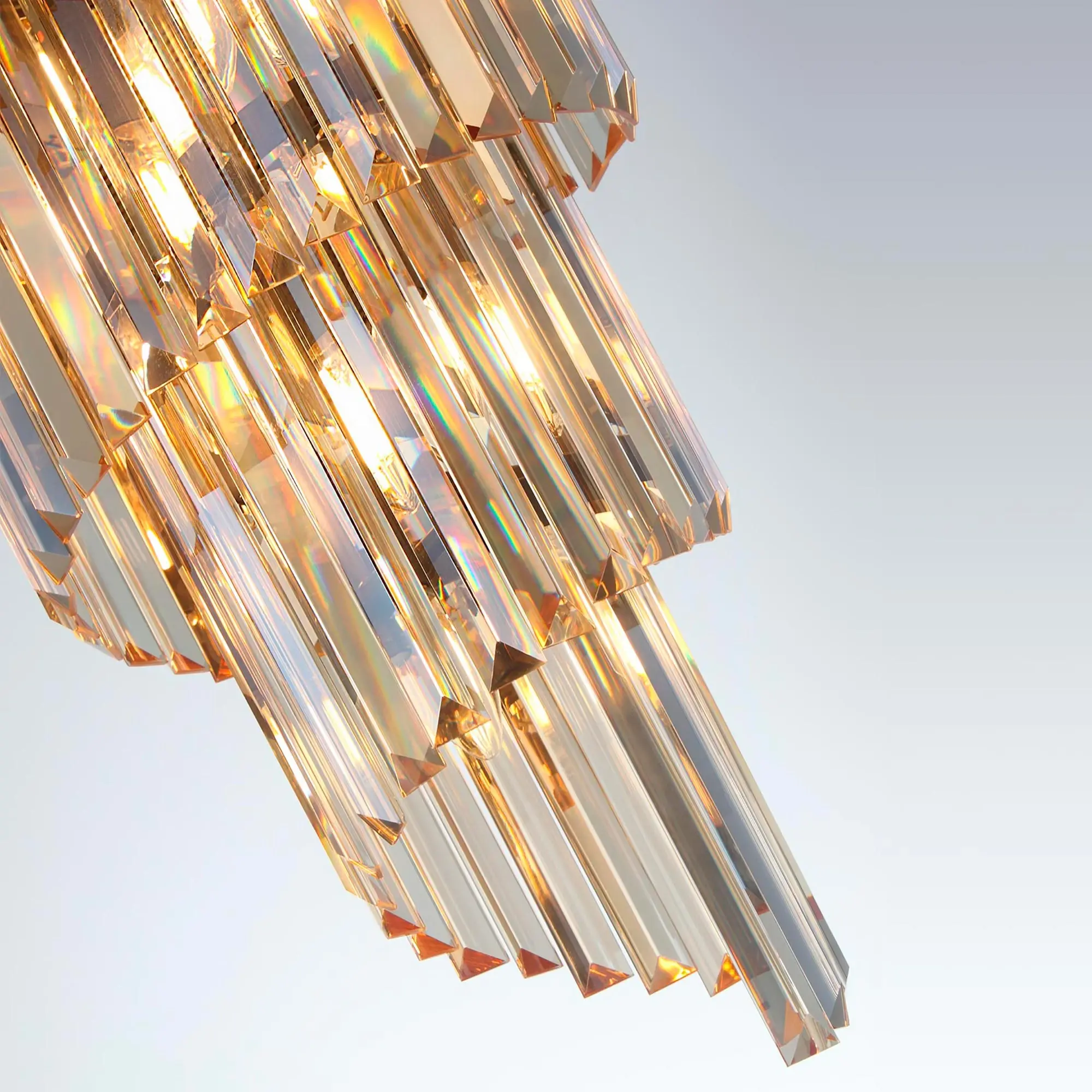 Стильная каскадная подвесная люстра Citilux Мартин CL332172 с хрустальными подвесками модного оттенка шампань, ниспадающими по спирали. Основание модели круглой формы выполнено из металла солидной толщины, окрашенного в темный коричневый цвет. Казалось бы, незначительная деталь - золотистая окантовка наружных колец, как последний штрих мастера, придает светильнику завершенный облик. Тип крепления – крючок. Высоту изделия можно отрегулировать в диапазоне от 2,5 метров до 1,06 метра. В люстре 21 ламп с цоколем Е14 и максимальной мощностью для ламп накаливания 60Вт. Суммарная мощность 1260 Вт, площадь освещения до 38 кв. метров. Светодиодные лампы можно использовать более яркие. Светильник отлично подойдет в большой зал или гостиную, оформленную в классическом или современном стиле, в том числе стиле лофт. Более того, это прекрасный вариант для освещения лестничных пролетов в загородном доме и помещений со вторым светом.,