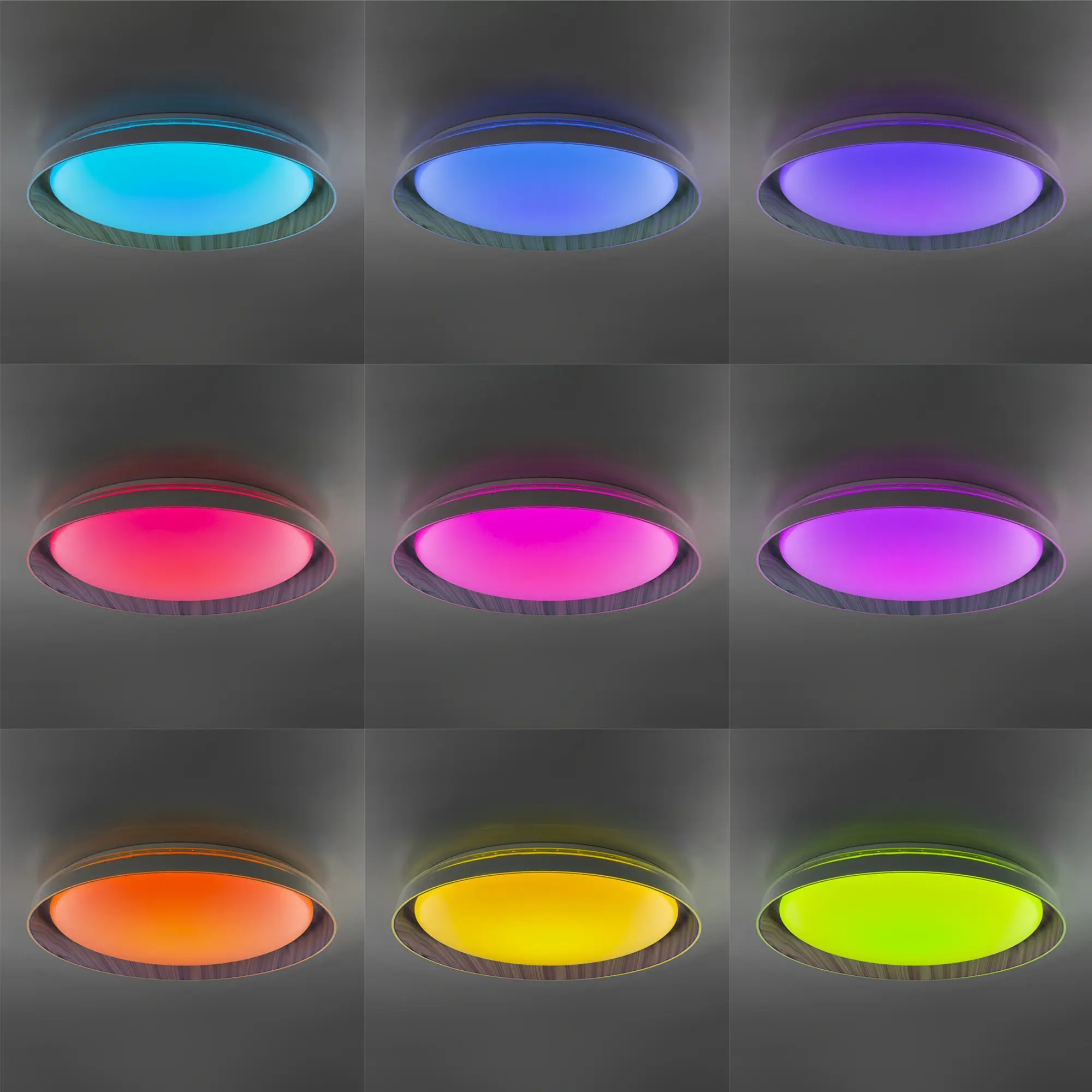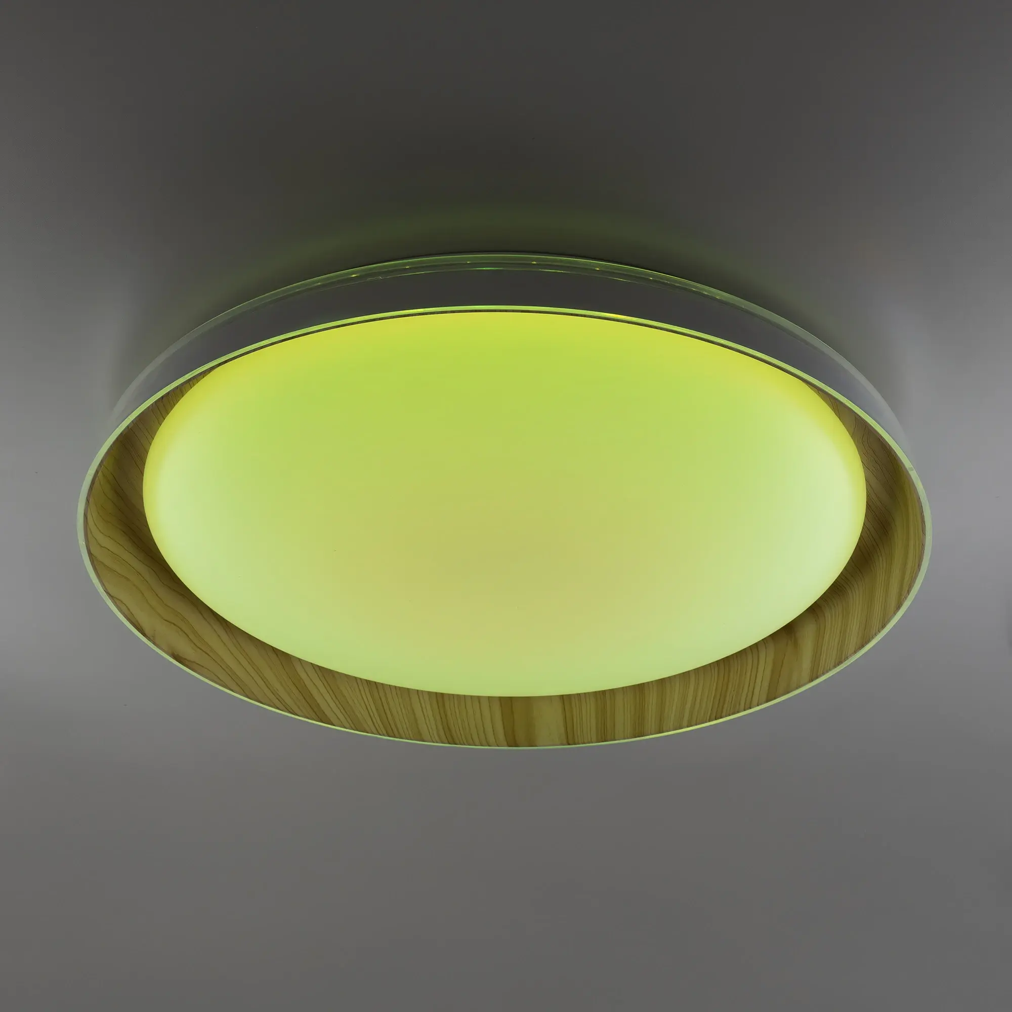 Светодиодный потолочный светильник Citilux MEGA CL752452G с яркой цветной RGB подсветкой всего плафона. Основание металлическое, круглый рассеиватель из белого оптического полимера с декоративной окантовкой под дерево. Благодаря оригинальной конструкции, светильник равномерно осветит помещение и дополнительно подсветит потолок, что придаст пространству дополнительный объём.