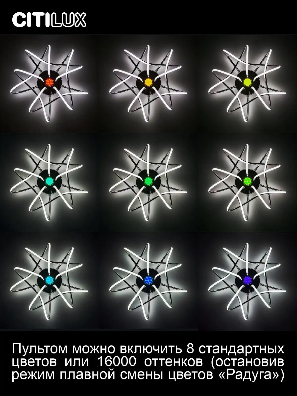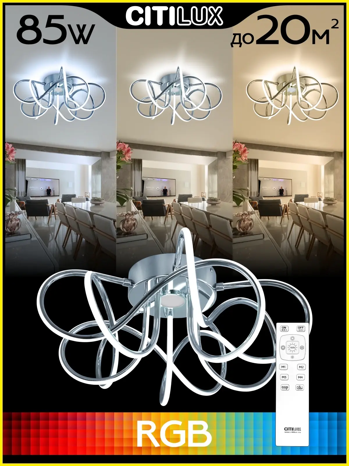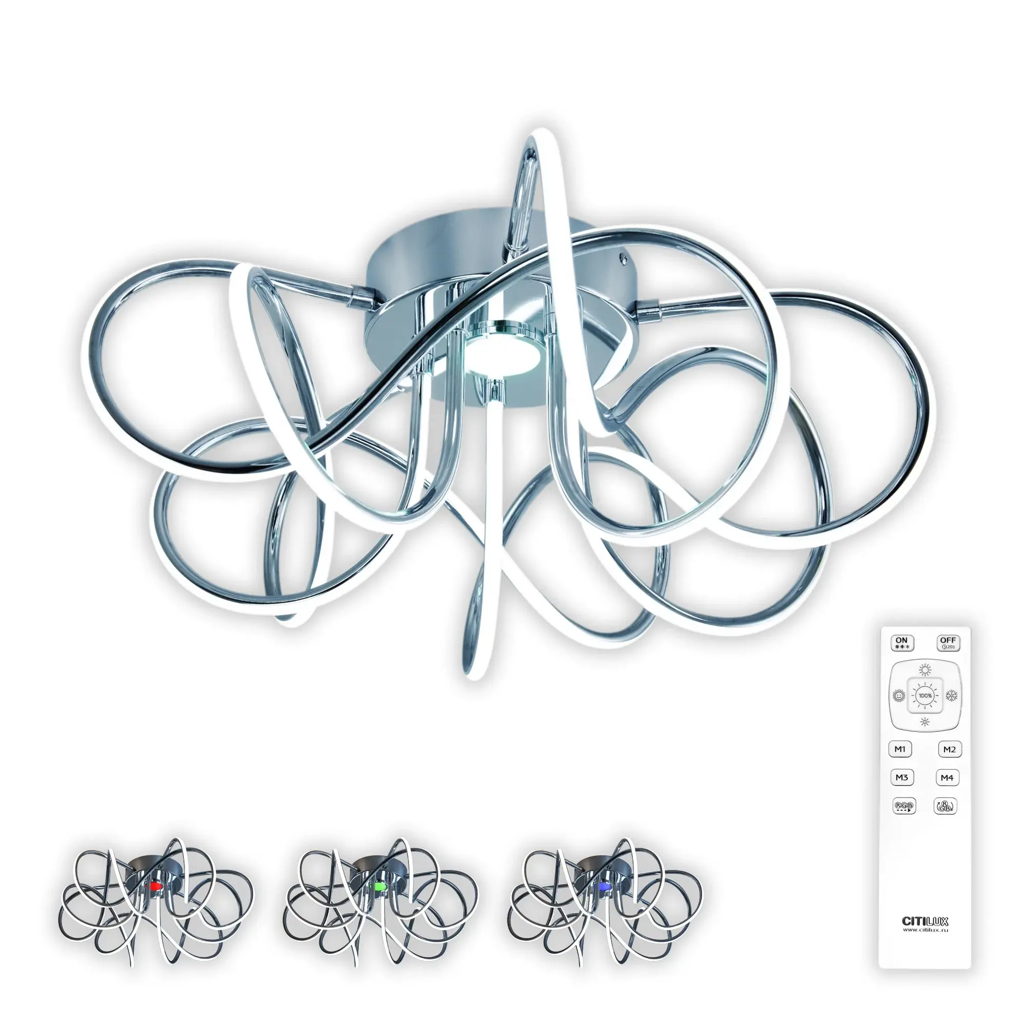 Светодиодная потолочная люстра Citilux Мишель CL229151 с RGB подсветкой, является ярким представителем современных управляемых светильников. Светильник с круглым основанием и изогнутыми рожками. Корпус изготовлен из металла, цвет хром. Рассеиватель белый матовый из оптического полимера. Модель подходит для всех типов потолков, в том числе натяжных, тип крепления – планка. Модель управляется с помощью пульта дистанционного управления или с настенного выключателя. Пульт ДУ в комплекте, тип батареек ААА (батарейками не комплектуется). С помощью пульта доступно: плавная регулировка яркости от 100% до 10%; управление цветовой температурой в диапазоне от 3000К до 5500К, с возможностью настроить любые оттенки теплого, нейтрального и холодного света. Свет без мерцаний и пульсаций. Есть четыре настраиваемых режима памяти, от М1 до М4, которыми также можно управлять с настенного выключателя. Мощность светильника 85Вт.,