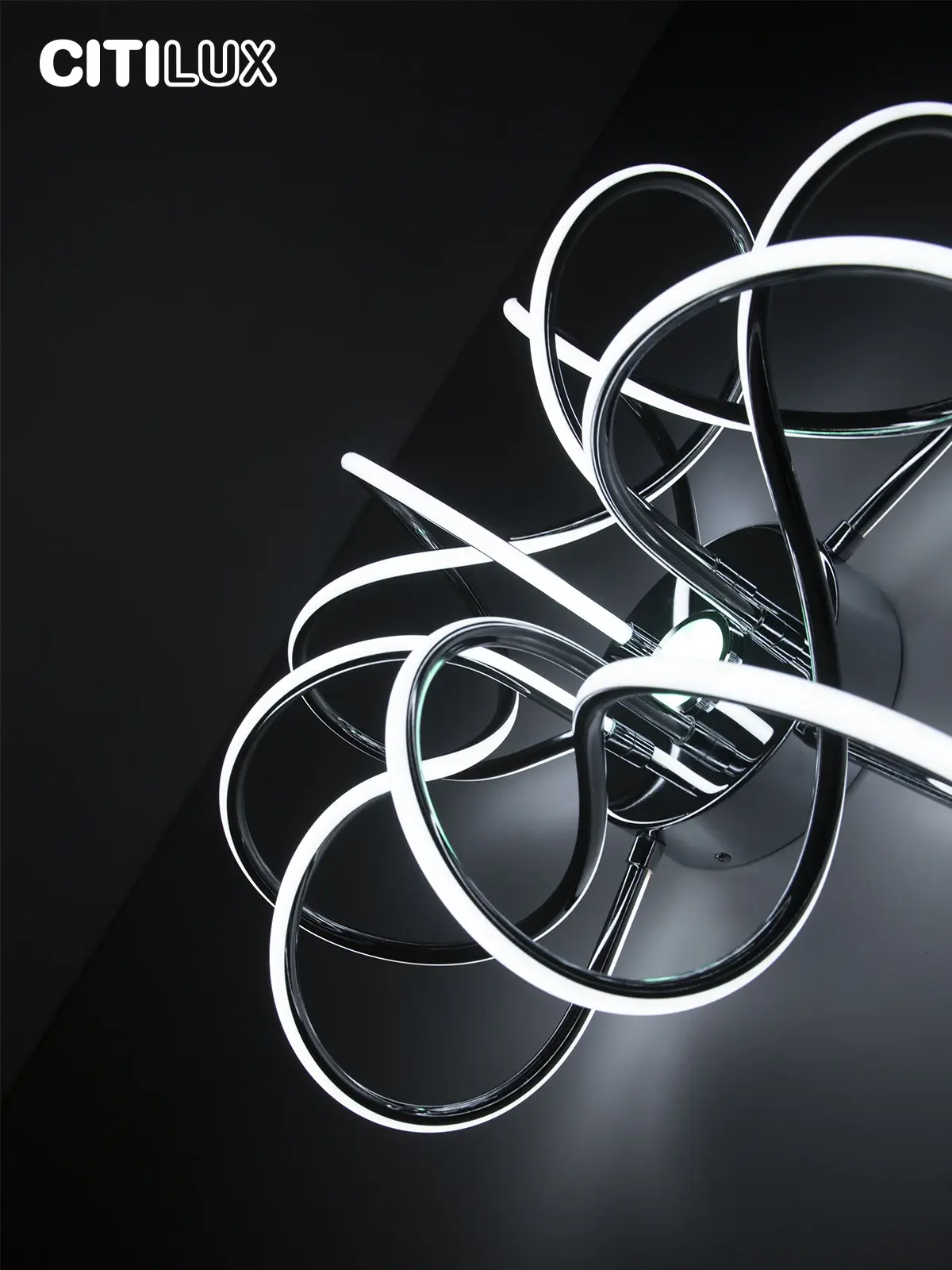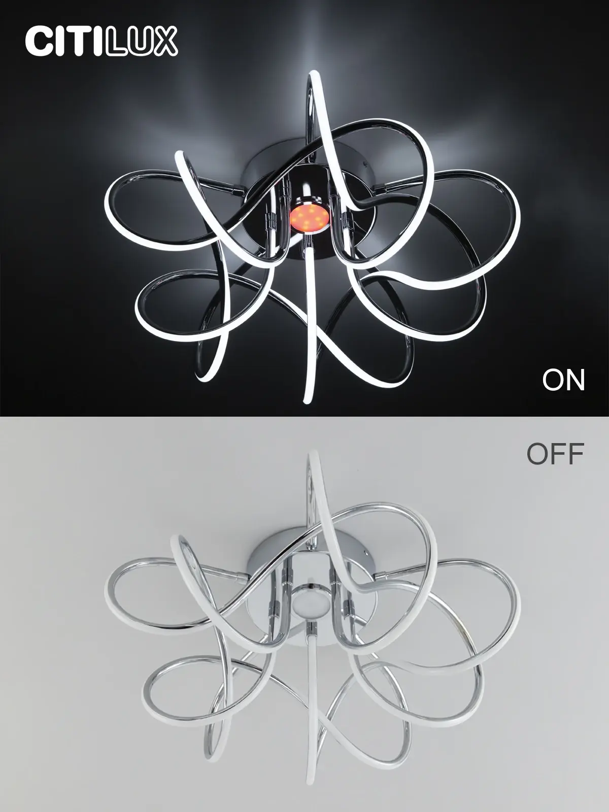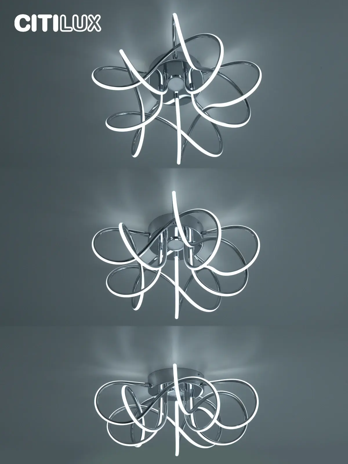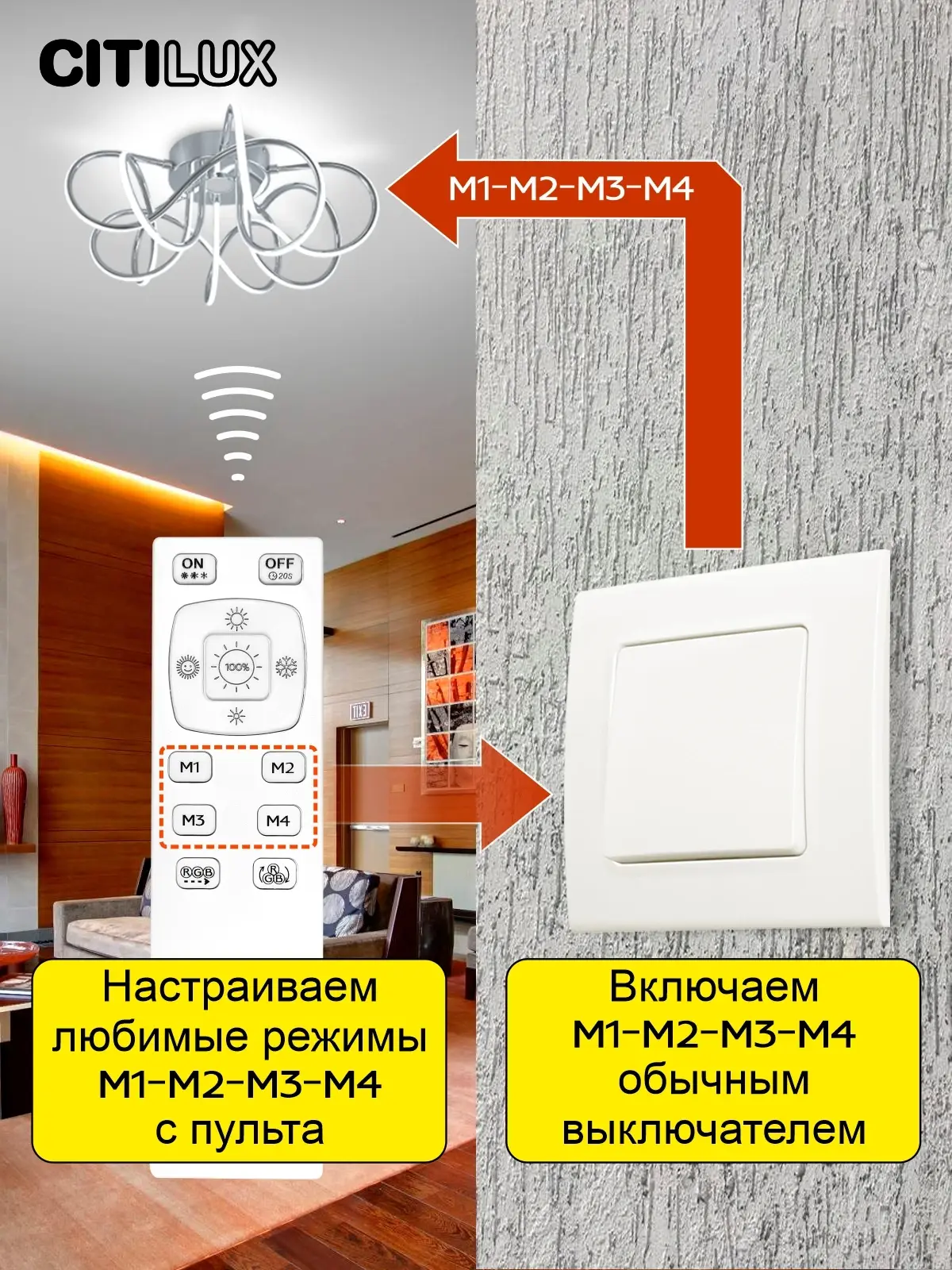 Светодиодная потолочная люстра Citilux Мишель CL229151 с RGB подсветкой, является ярким представителем современных управляемых светильников. Светильник с круглым основанием и изогнутыми рожками. Корпус изготовлен из металла, цвет хром. Рассеиватель белый матовый из оптического полимера. Модель подходит для всех типов потолков, в том числе натяжных, тип крепления – планка. Модель управляется с помощью пульта дистанционного управления или с настенного выключателя. Пульт ДУ в комплекте, тип батареек ААА (батарейками не комплектуется). С помощью пульта доступно: плавная регулировка яркости от 100% до 10%; управление цветовой температурой в диапазоне от 3000К до 5500К, с возможностью настроить любые оттенки теплого, нейтрального и холодного света. Свет без мерцаний и пульсаций. Есть четыре настраиваемых режима памяти, от М1 до М4, которыми также можно управлять с настенного выключателя. Мощность светильника 85Вт.,