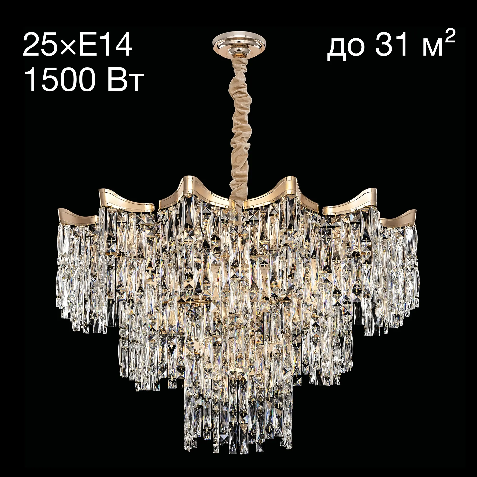 Хрустальная люстра Citilux Моника CL308292 восхищает своей красотой. Шикарные подвески изготовлены из кристально прозрачного хрусталя с модной огранкой. Корпус металлический, благородного золотого цвета. В изделии используется 25 ламп с цоколем Е14 максимальной мощностью для ламп накаливания 60Вт (в комплект не входит, приобретается отдельно). Диаметр светильника 99см, высота регулируется от 70см до 1,66м. Подходит для всех типов потолков, в том числе натяжных, тип крепления – планка. Великолепная хрустальная люстра Citilux Моника CL308292 потрясающе выглядит в классических и современных интерьерах, и бесспорно станет украшением гостиной, столовой, зала или кабинета.