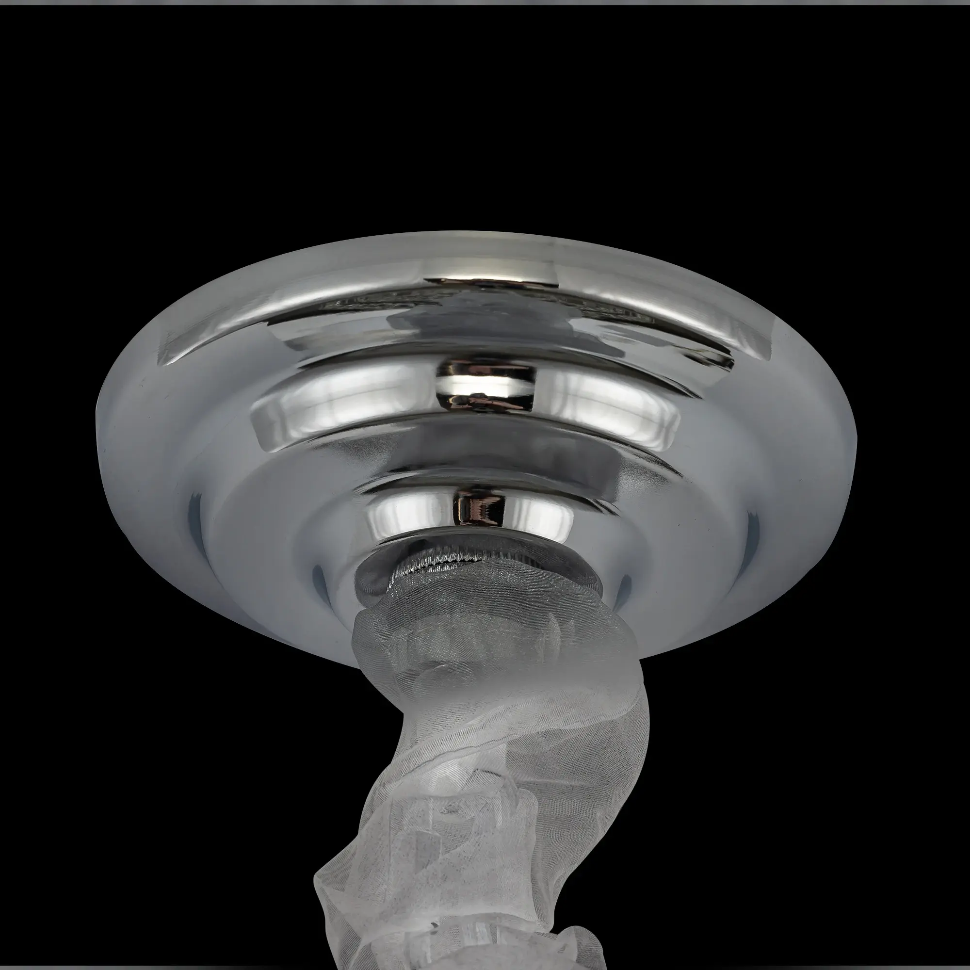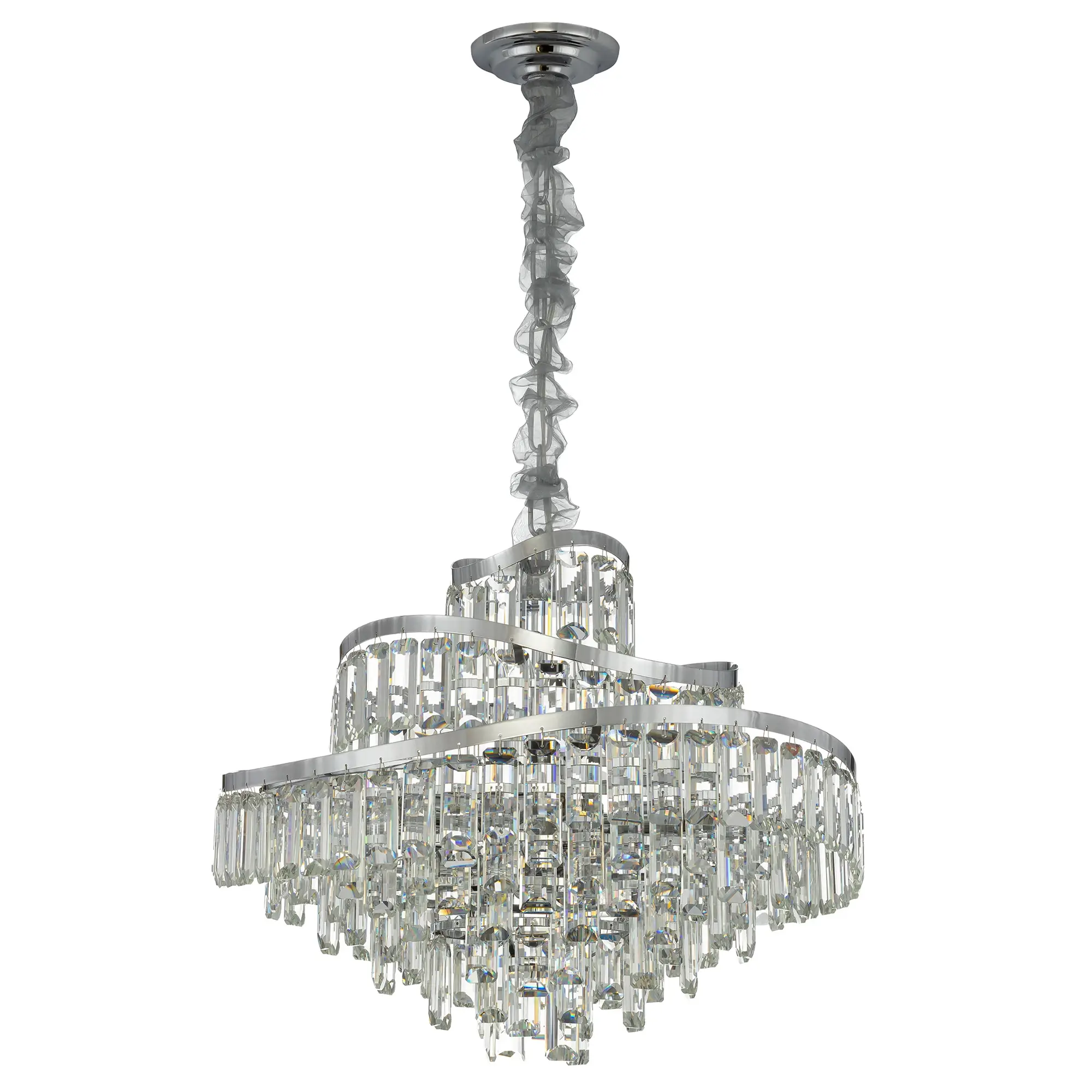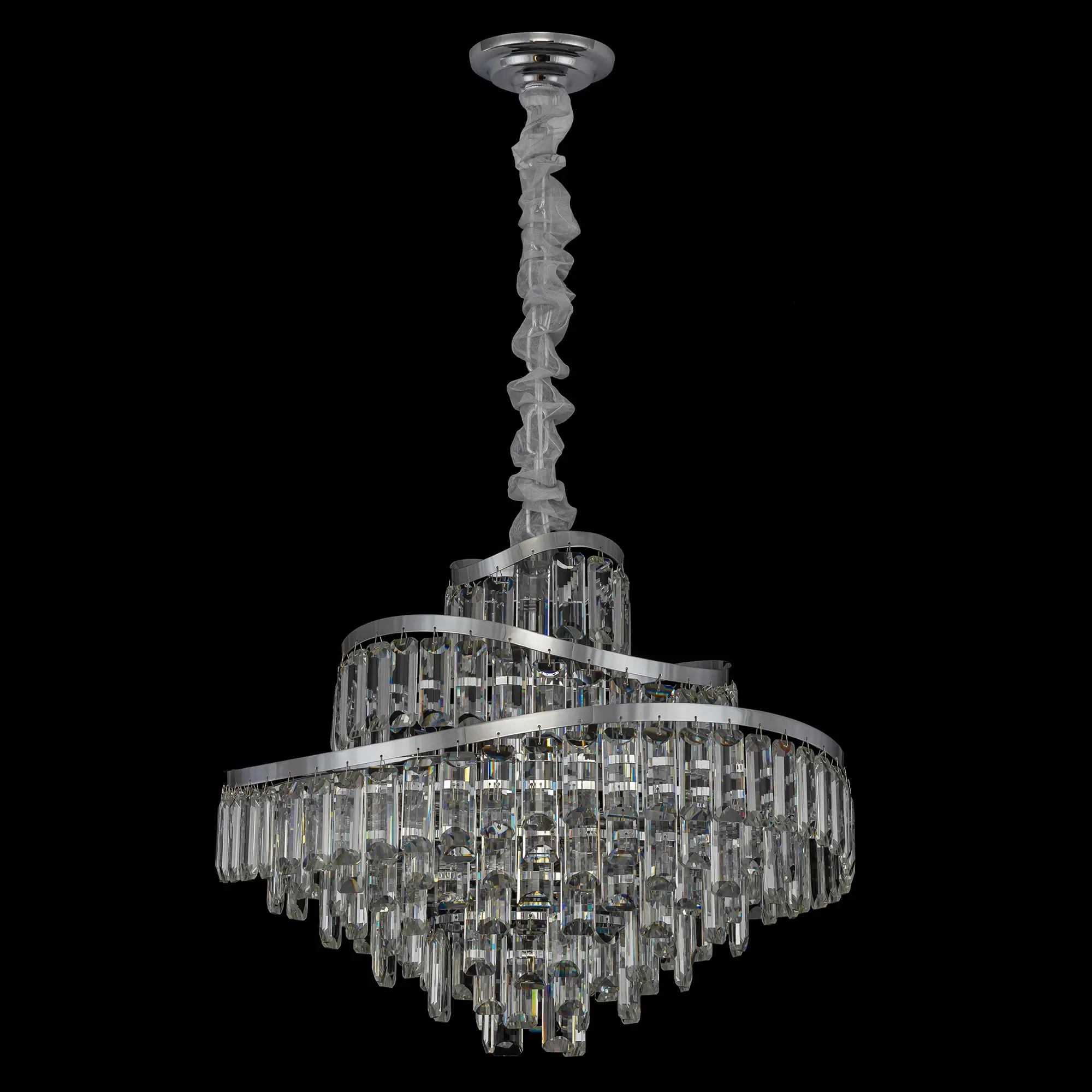 Металлический каркас с глянцевым хромированным покрытием притягивает взгляд своим холодным блеском. Изогнутые, словно морские волны, кольца переливаются на свету, создавая динамичный и изменчивый образ в зависимости от ракурса. Роскошный облик формируют прямоугольные хрустальные подвески с современной огранкой — их кристальная чистота и геометрическая точность подчёркивают изысканность формы. Каждая грань хрусталя ловит свет, превращая его в тысячи искрящихся бликов, которые наполняют пространство торжественным сиянием.