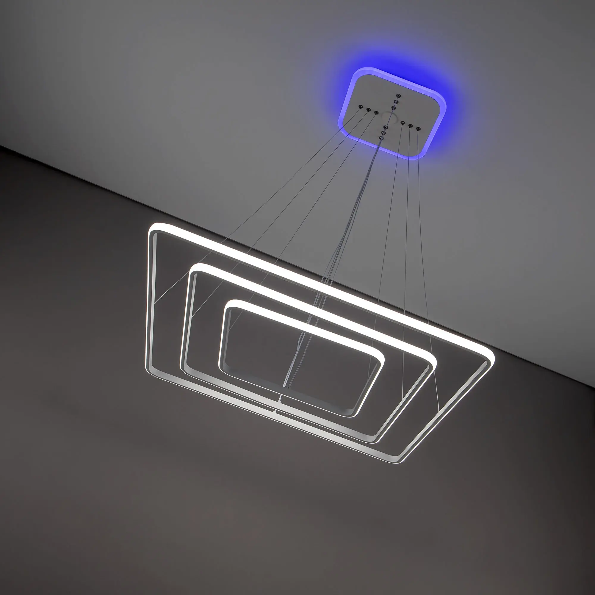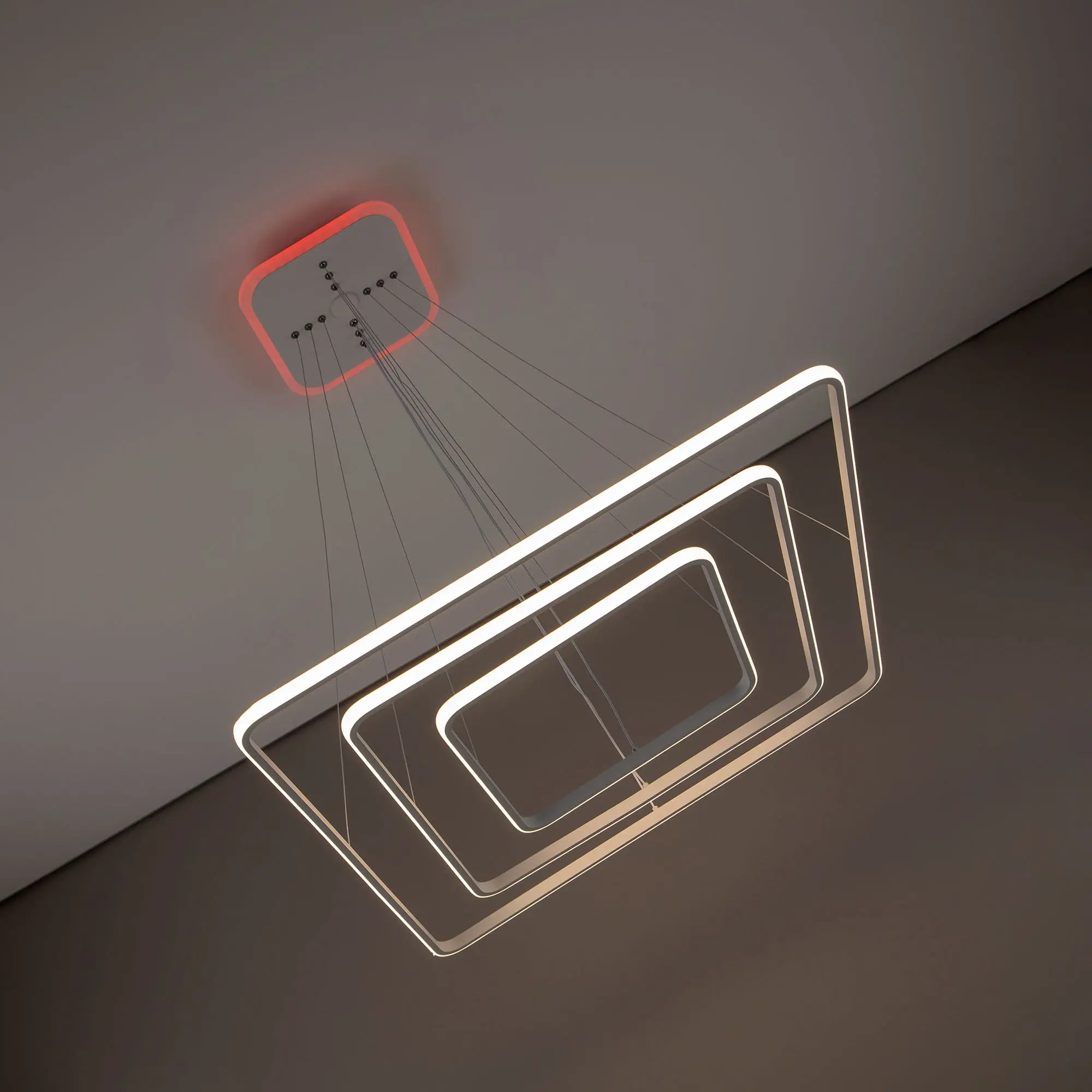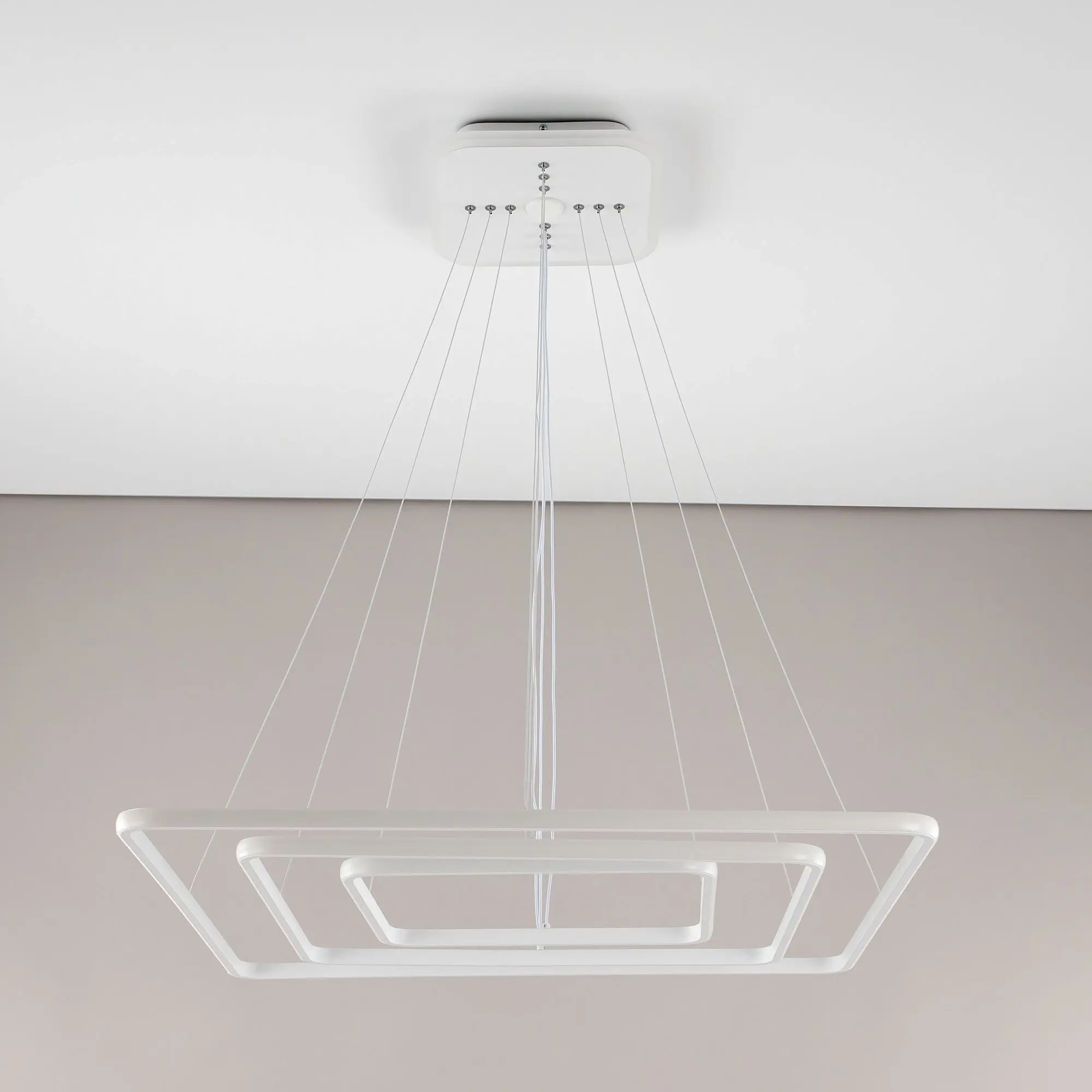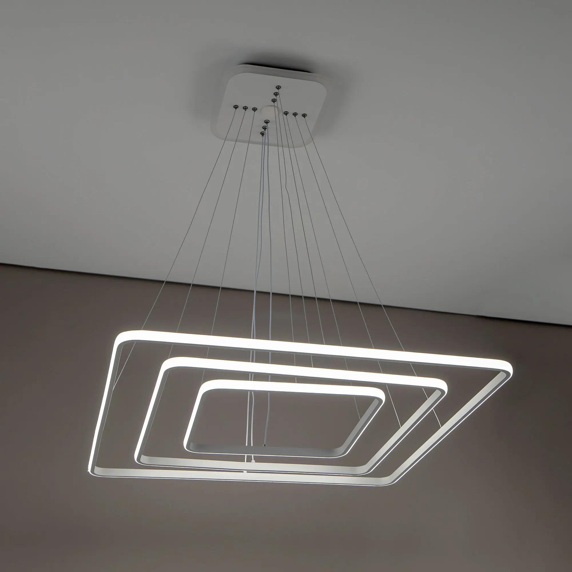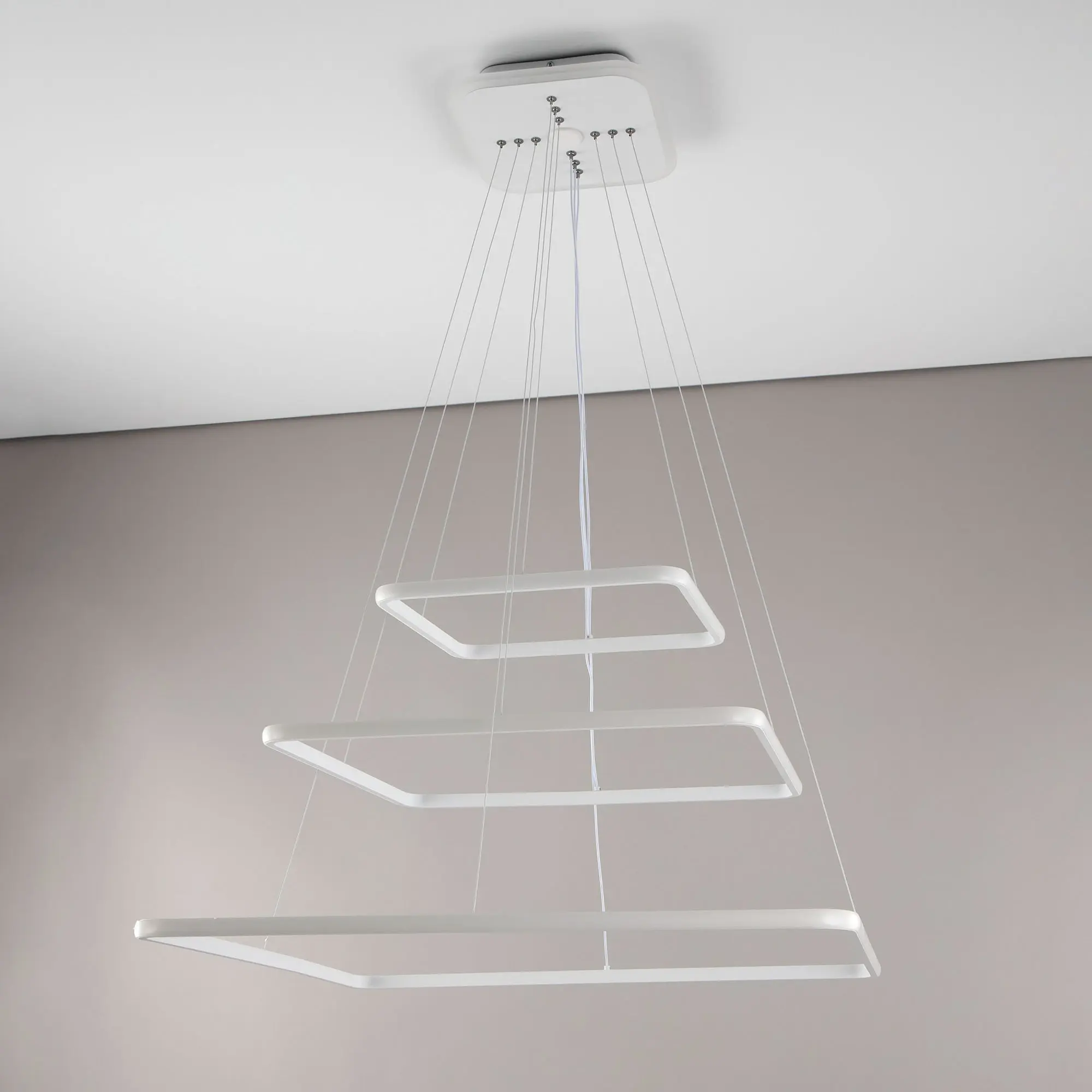 Люстра на тросах, в форме каскада из трех подвесных квадратных колец, высоту и угол наклона каждого из которых можно изменить. Корпус изготовлен из алюминиевого сплава, рассеиватель оптический полимер, цвет белый матовый. Крепление люстры подходит для всех типов потолков, в том числе натяжных. Тип крепления – планка.