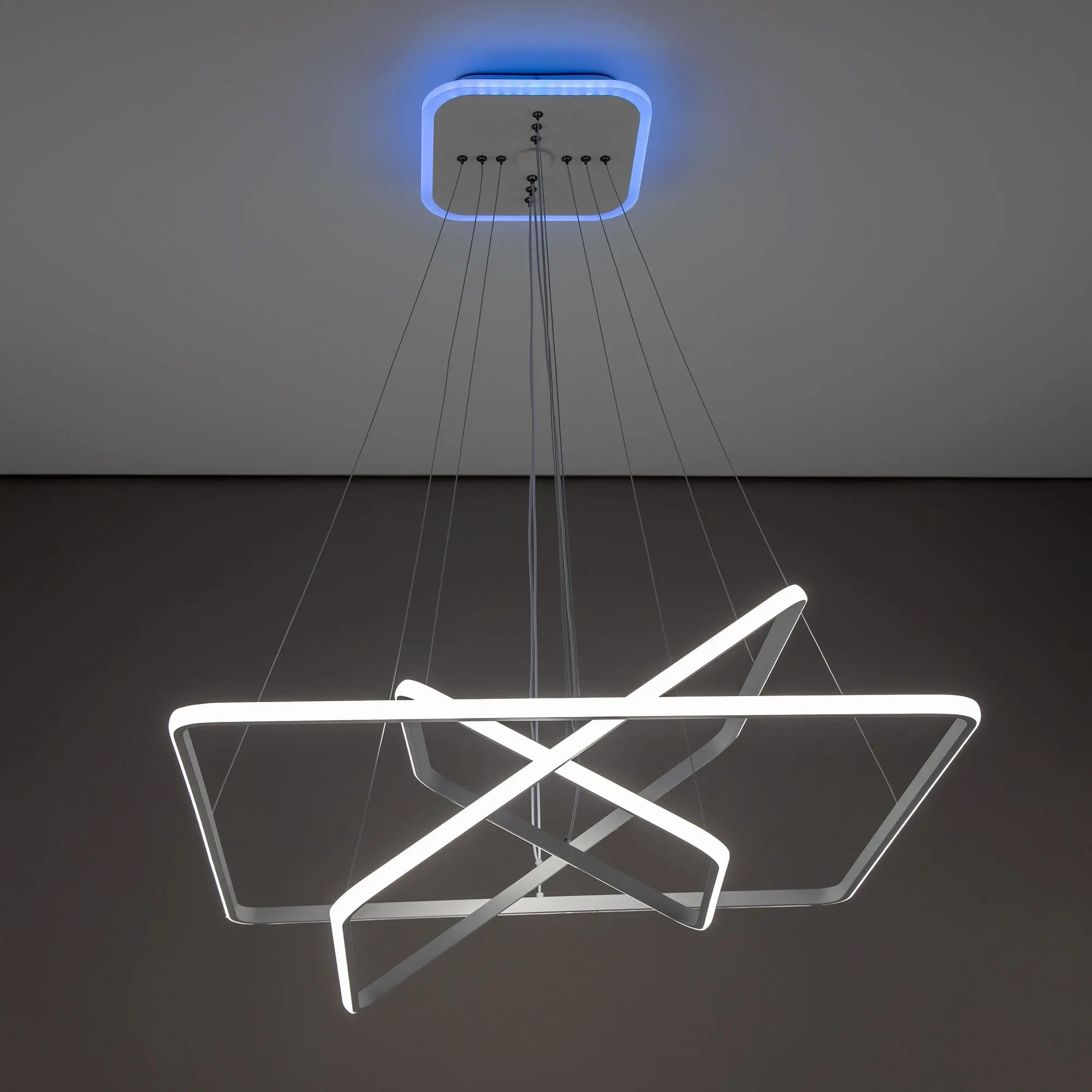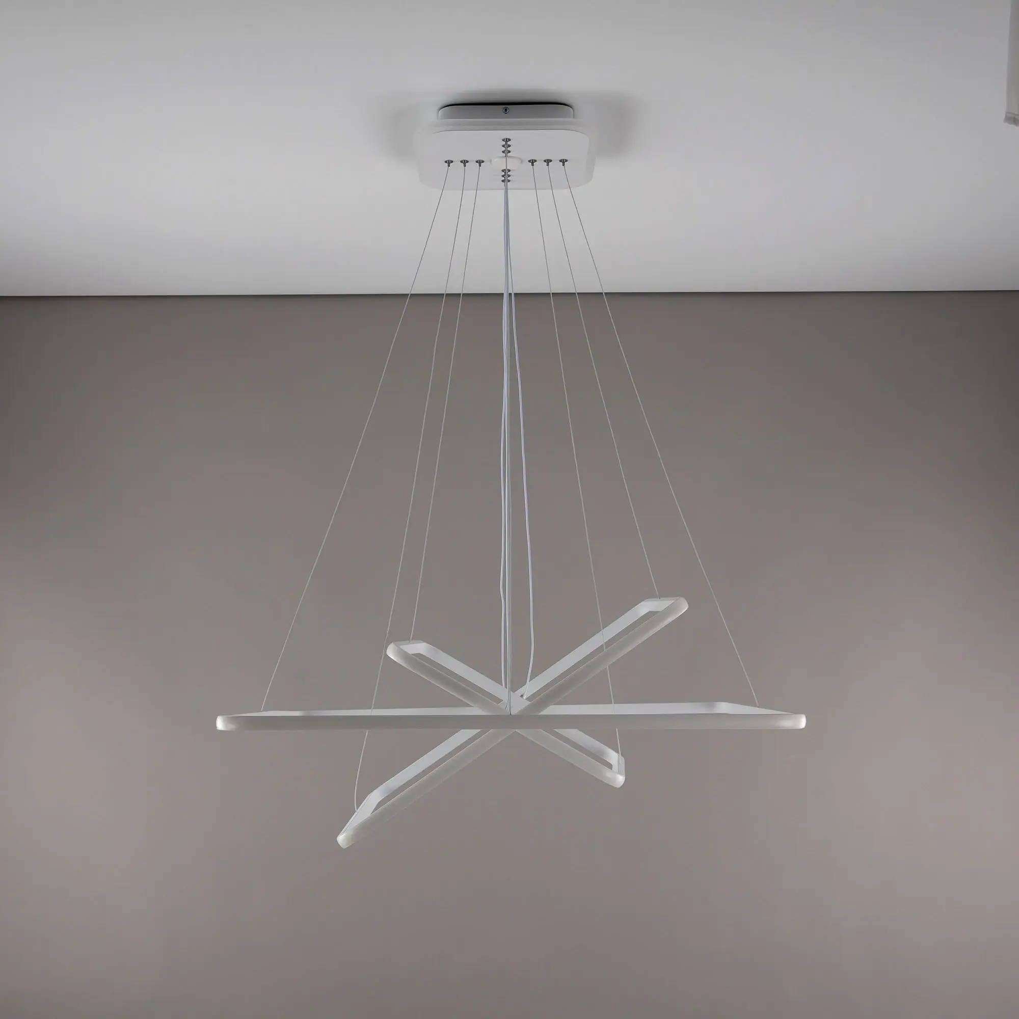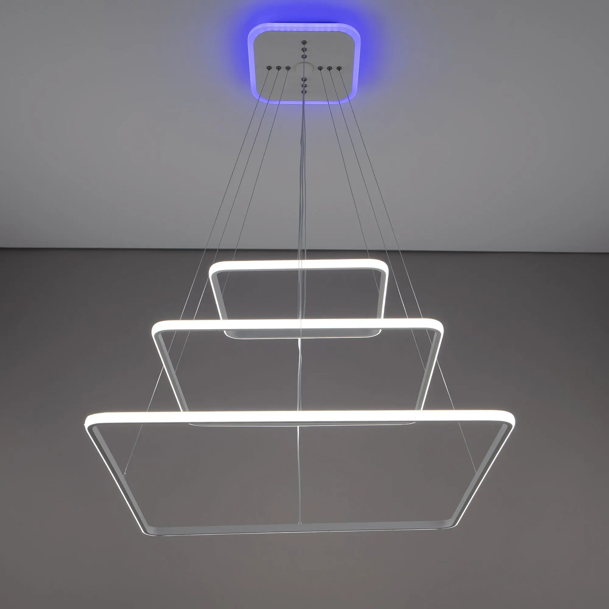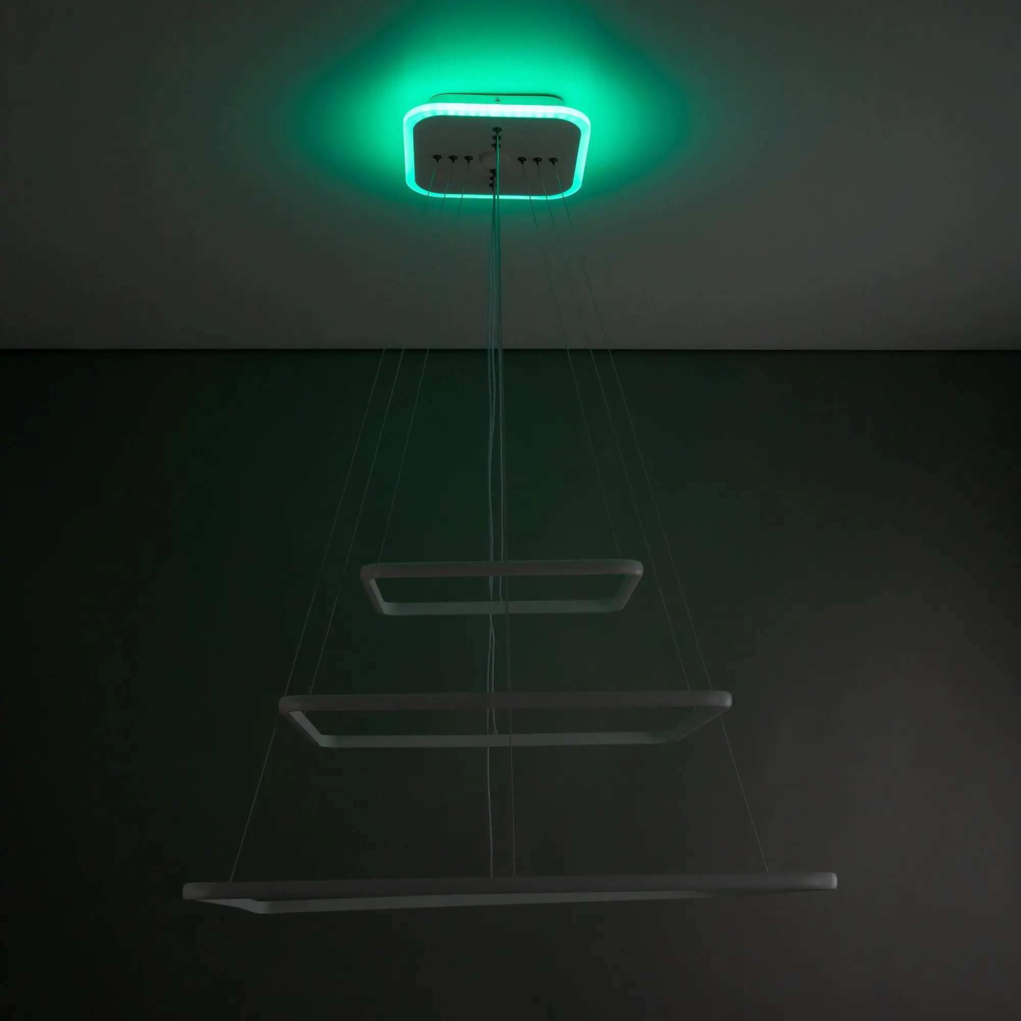 Люстра на тросах, в форме каскада из трех подвесных квадратных колец, высоту и угол наклона каждого из которых можно изменить. Корпус изготовлен из алюминиевого сплава, рассеиватель оптический полимер, цвет белый матовый. Крепление люстры подходит для всех типов потолков, в том числе натяжных. Тип крепления – планка.