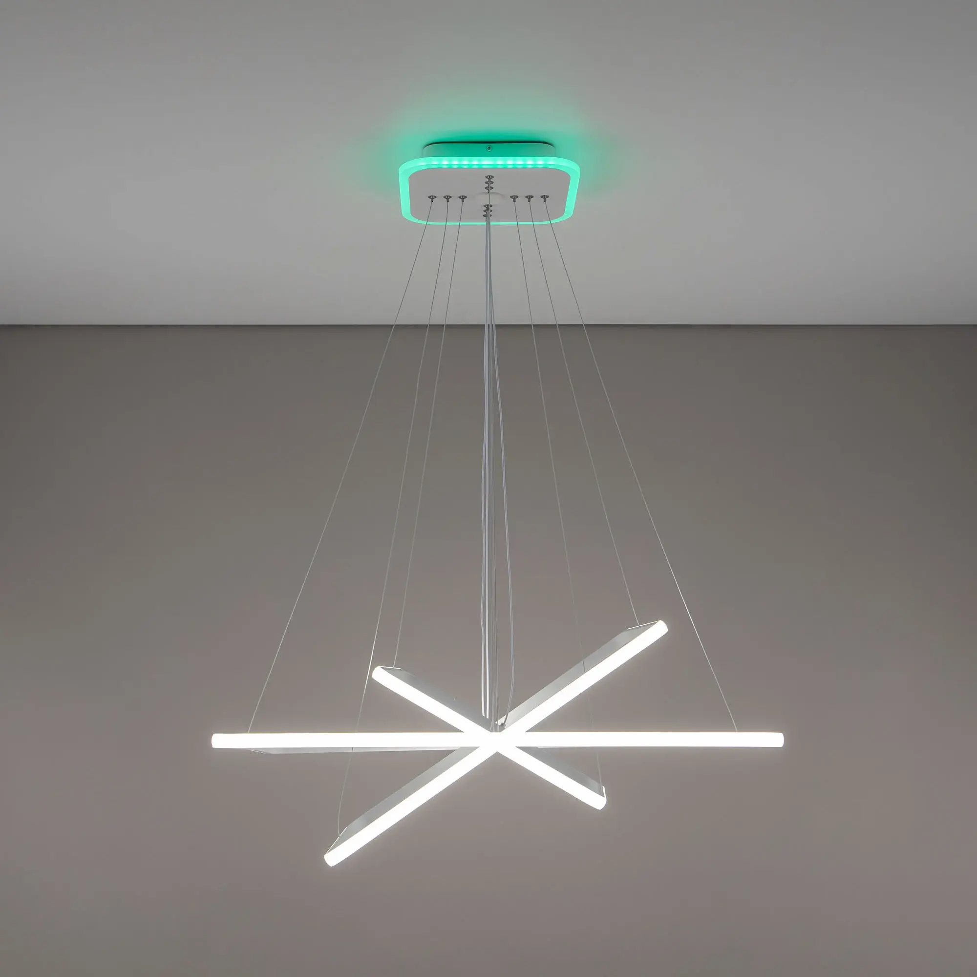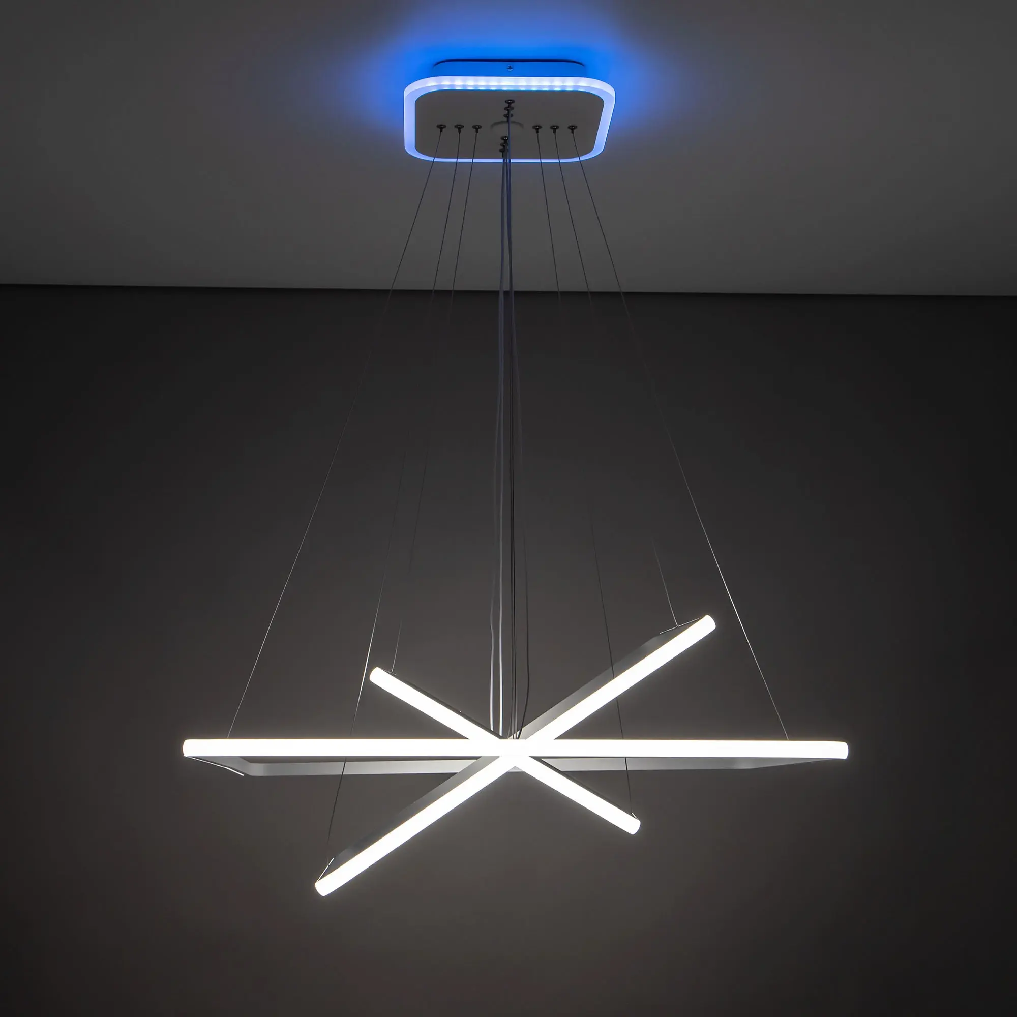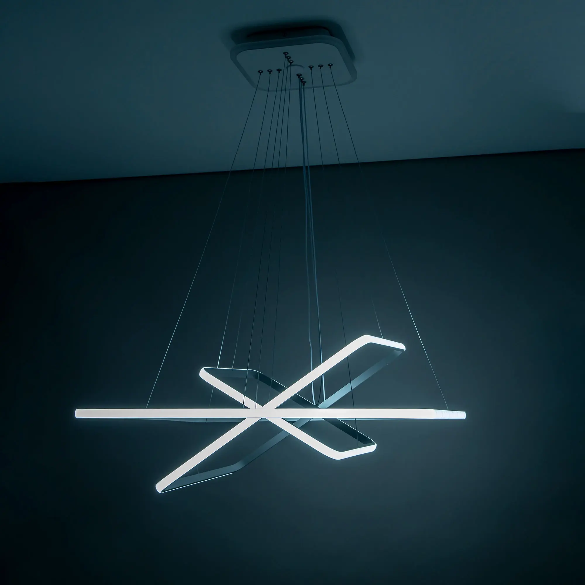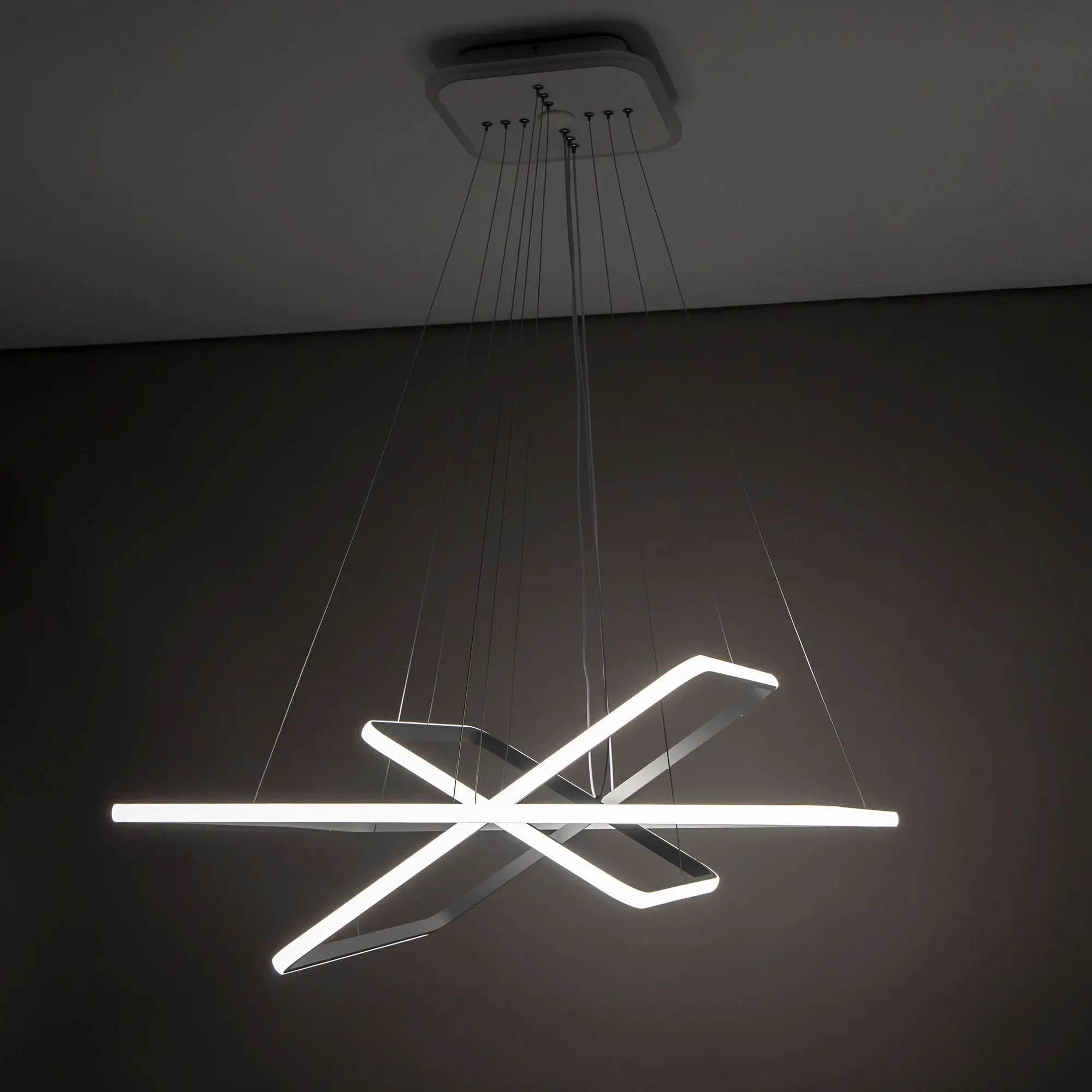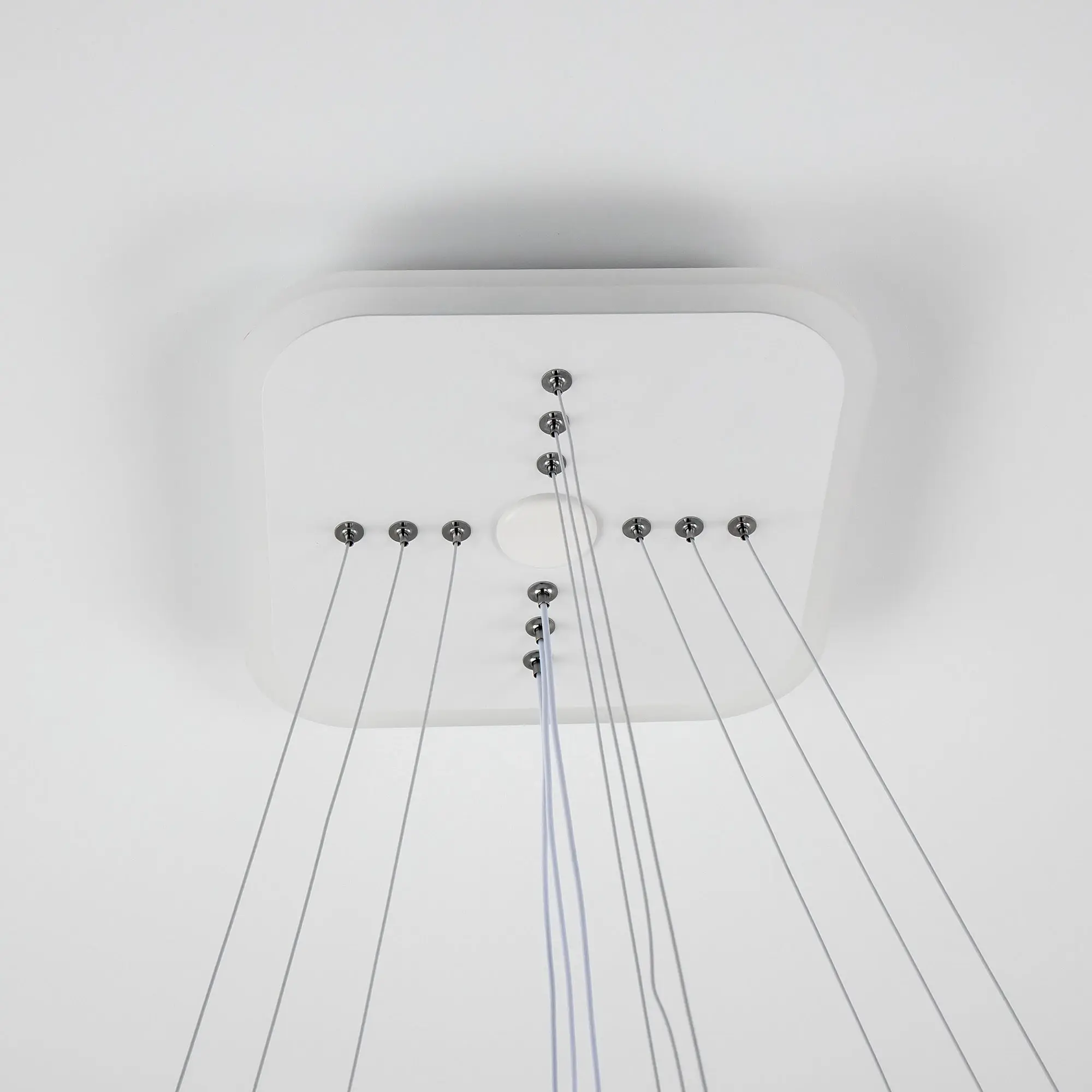 Люстра на тросах, в форме каскада из трех подвесных квадратных колец, высоту и угол наклона каждого из которых можно изменить. Корпус изготовлен из алюминиевого сплава, рассеиватель оптический полимер, цвет белый матовый. Крепление люстры подходит для всех типов потолков, в том числе натяжных. Тип крепления – планка.