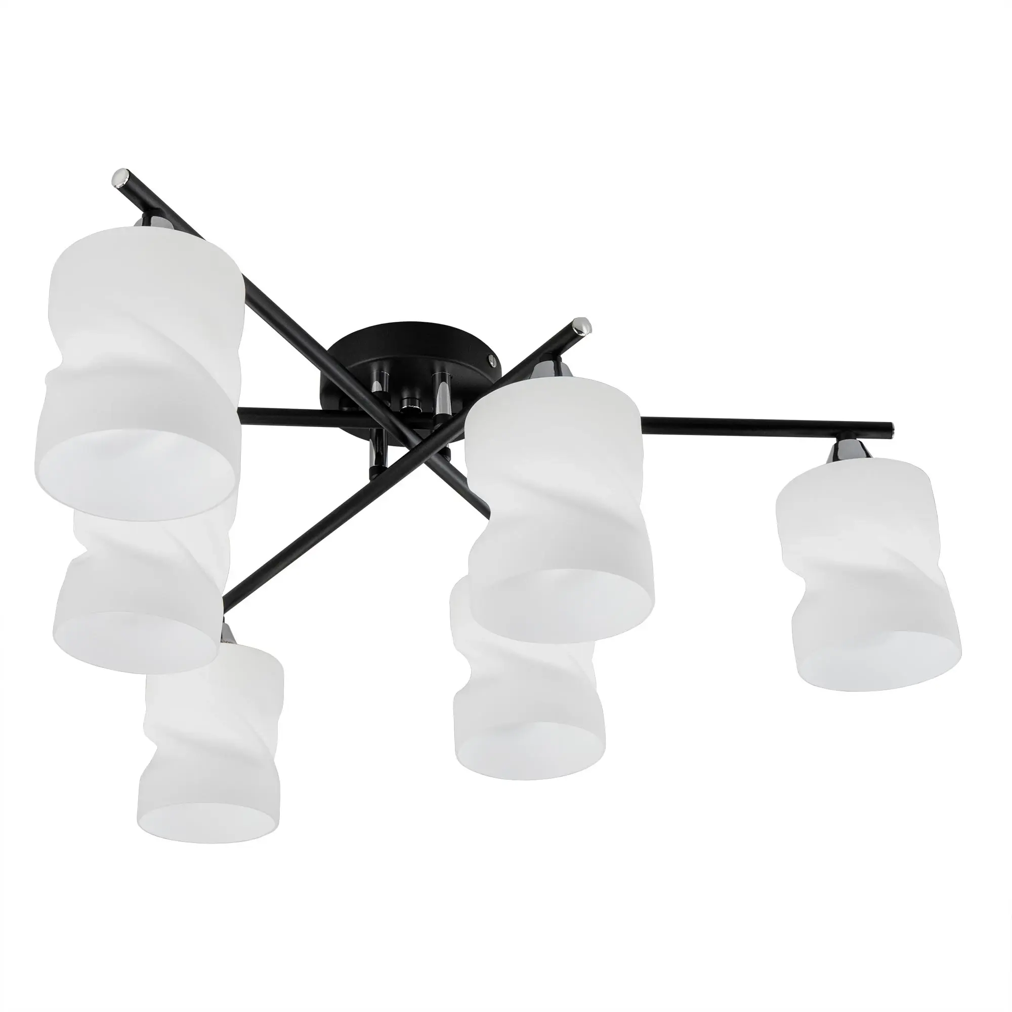 Стильная потолочная люстра Citilux Нильс CL132165 для современных интерьеров. Корпус светильника металлический, с рожками штангами, цвет чёрный с декоративными хромированными элементами. Плафоны стеклянные, белые матовые, оригинальной формы. Люстру можно скоммутировать для работы как с одноклавишным, так и с двухклавишным выключателем. В изделии используются лампы с цоколем Е27, максимальной мощностью для ламп накаливания 60Вт. Рекомендуем применять светодиодные лампы. Подходит для всех типов потолков, в том числе натяжных, тип крепления-планка. Размеры: диаметр 64см, высота 21см. Прекрасный вариант для яркого освещения помещений с низкими потолками, площадью около 16м².
