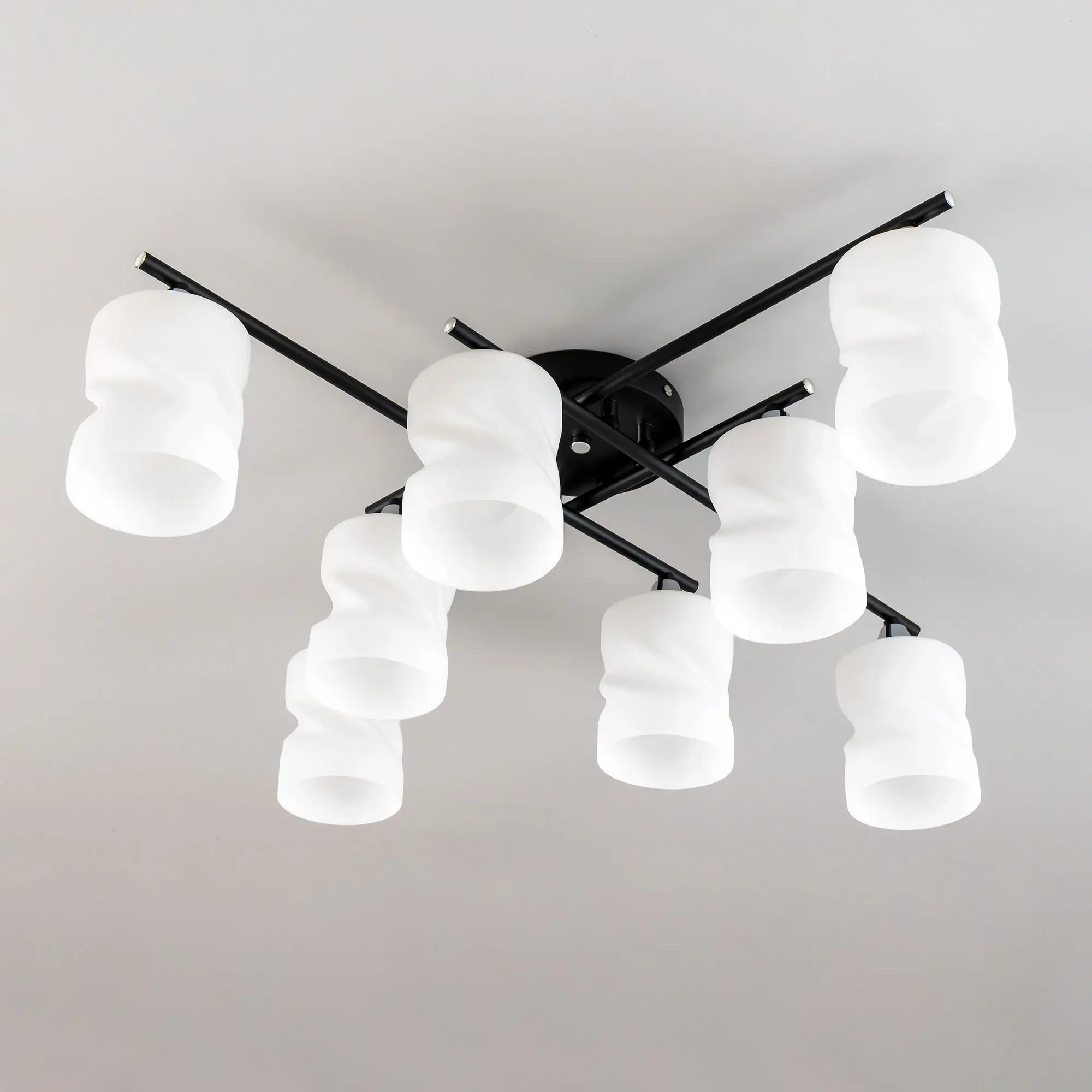 Стильная потолочная люстра Citilux Нильс CL132185 для современных интерьеров. Корпус светильника металлический, с рожками штангами, цвет чёрный с декоративными хромированными элементами. Плафоны стеклянные, белые матовые, оригинальной формы. Люстру можно скоммутировать для работы как с одноклавишным, так и с двухклавишным выключателем. В изделии используются лампы с цоколем Е27, максимальной мощностью для ламп накаливания 60Вт. Рекомендуем применять светодиодные лампы. Подходит для всех типов потолков, в том числе натяжных, тип крепления-планка. Размеры: 74х74см, высота 21см. Прекрасный вариант для яркого освещения помещений с низкими потолками, площадью около 20м²,
