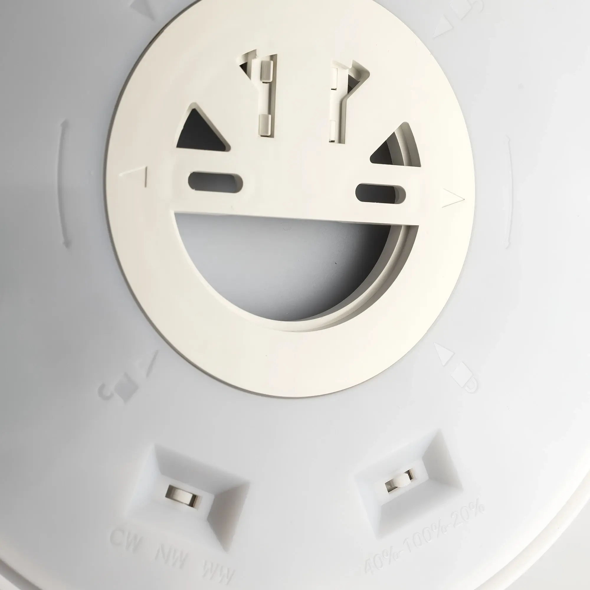 Модель оснащена двумя светодиодными модулями – основного света и потолочной подсветки. Есть возможность выбора цветовой температуры основного света - 3000К-4000К-5500К и уровня яркости потолочной подсветки – 100-40-20%, для этого перед монтажом, на тыльной стороне светильника, переключателем устанавливается нужный вариант. Цветовая температура потолочной подсветки фиксированная – 3000К.