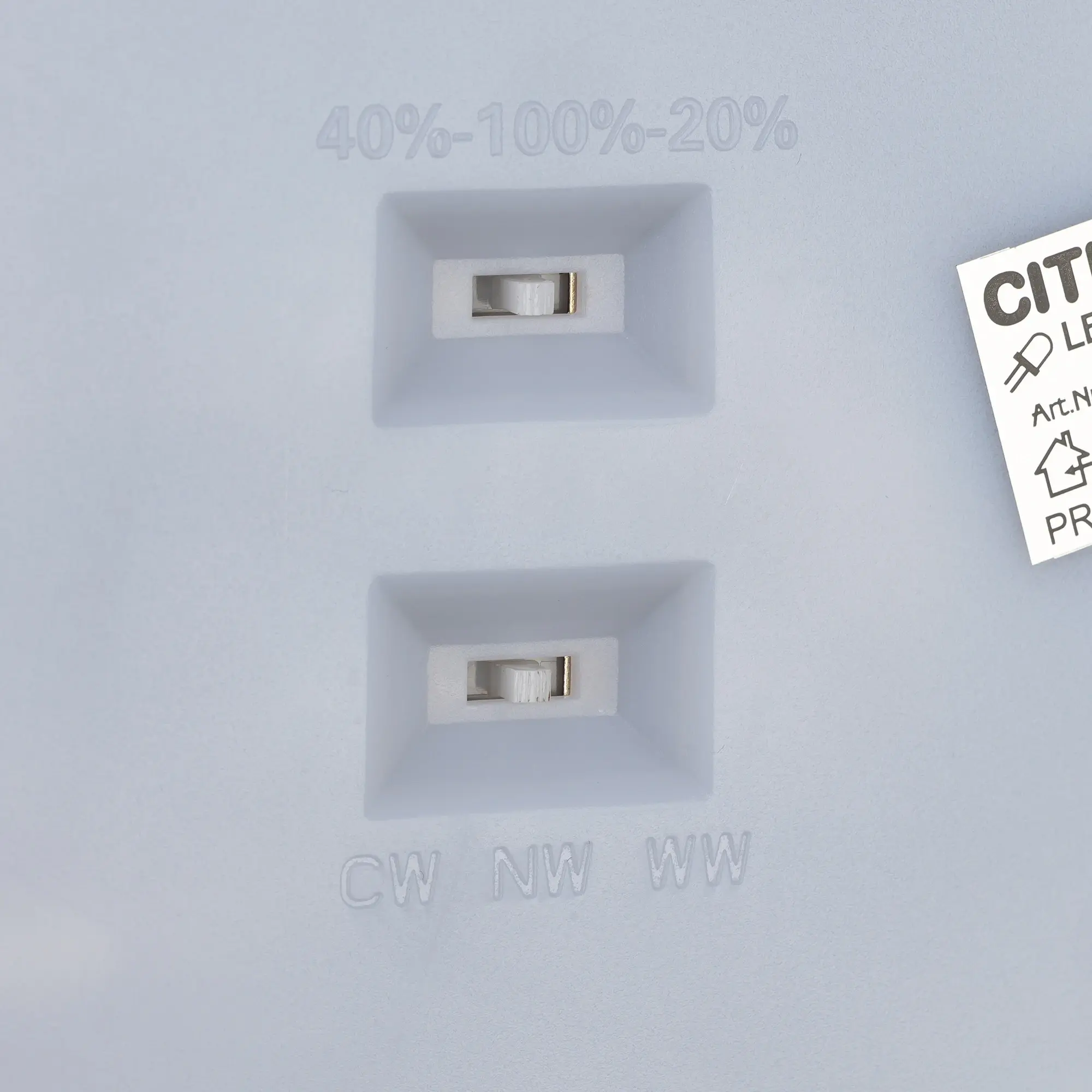 Модель оснащена двумя светодиодными модулями – основного света и потолочной подсветки. Есть возможность выбора цветовой температуры основного света - 3000К-4000К-5500К и уровня яркости потолочной подсветки – 100-40-20%. Для этого перед монтажом, на тыльной стороне светильника, переключателем устанавливается нужный вариант. Цветовая температура потолочной подсветки фиксированная – 3000К.