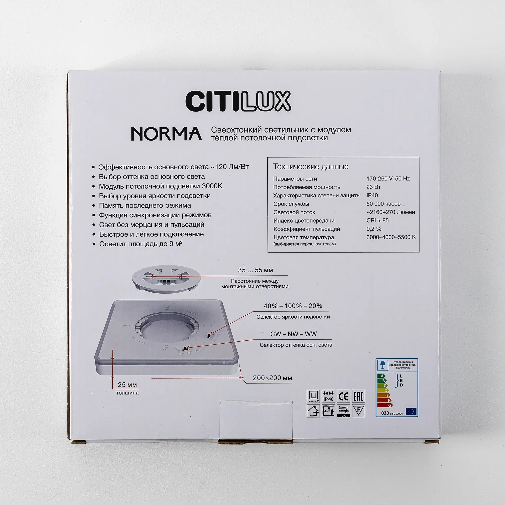 Изделие обладает высокой энергоэффективностью основного света – 120Лм/Вт, осветит до 9м². Мощность: основной свет - 18Вт, потолочная подсветка – 4,5Вт. Размер 20х20см, высота 2,5см. Свет безопасный для глаз, без мерцания и пульсаций. Тип крепления – удобная монтажная платформа.