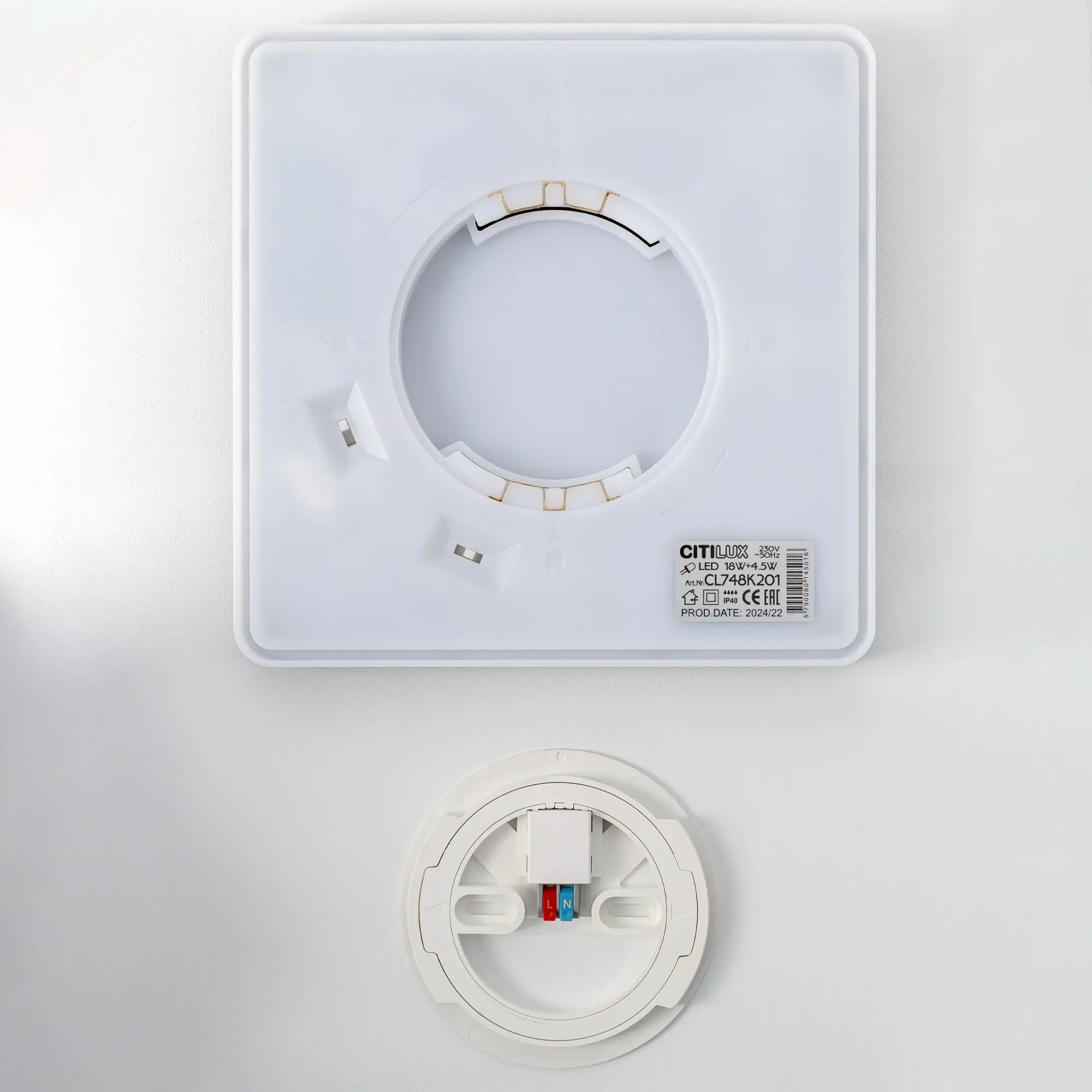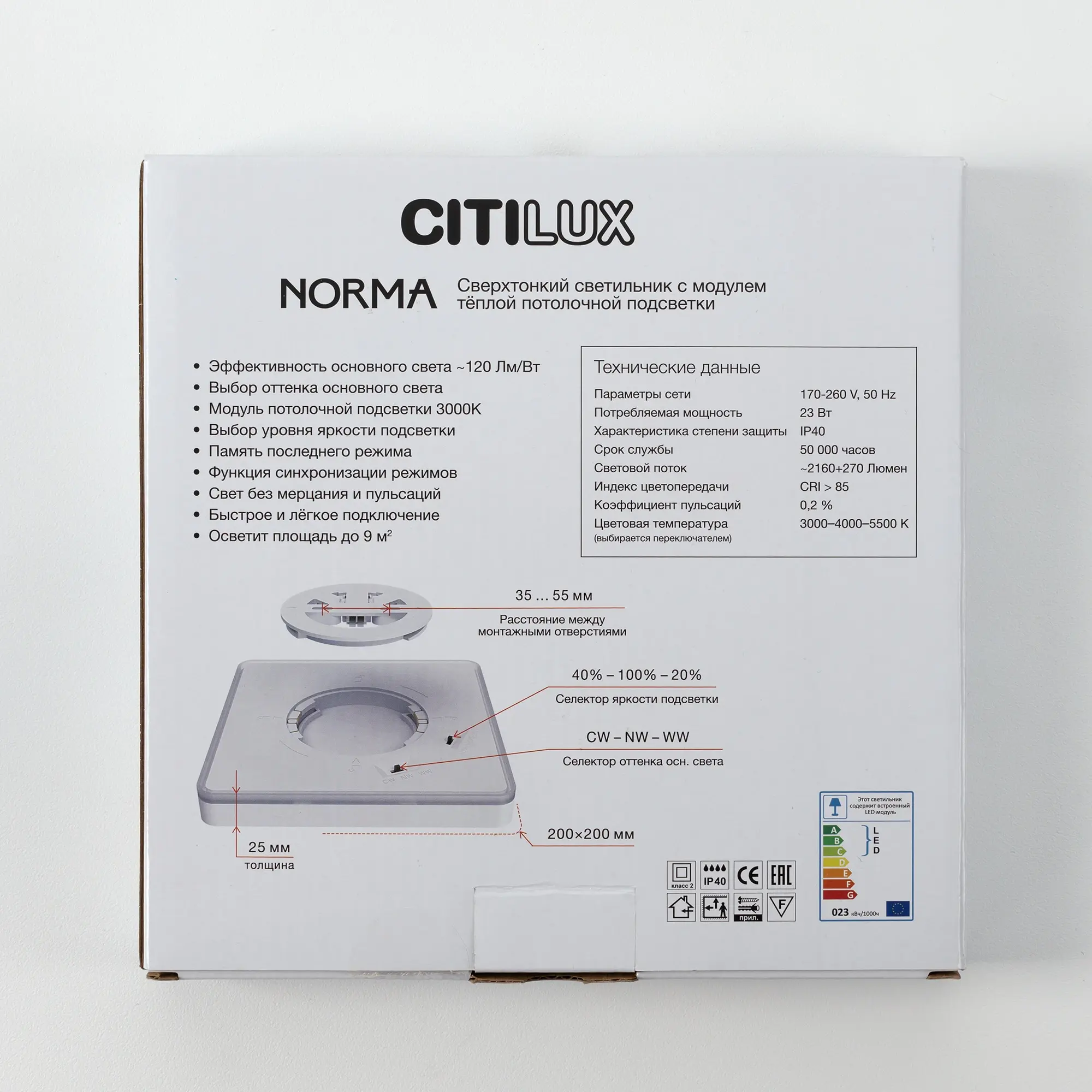 Изделие обладает высокой энергоэффективностью основного света – 120Лм/Вт, осветит до 9м². Мощность: основной свет - 18Вт, потолочная подсветка – 4,5Вт. Размер 20х20см, высота 2,5см. Свет безопасный для глаз, без мерцания и пульсаций. Тип крепления – удобная монтажная платформа.