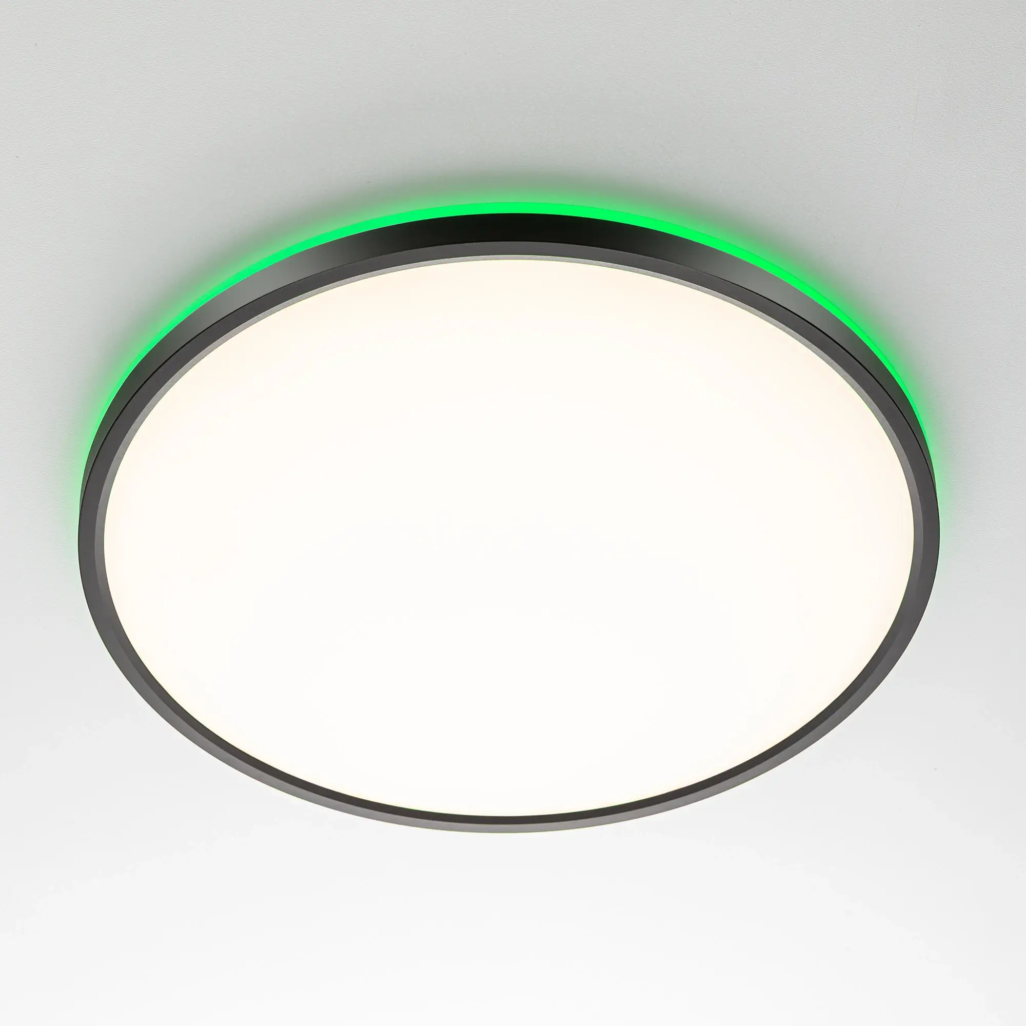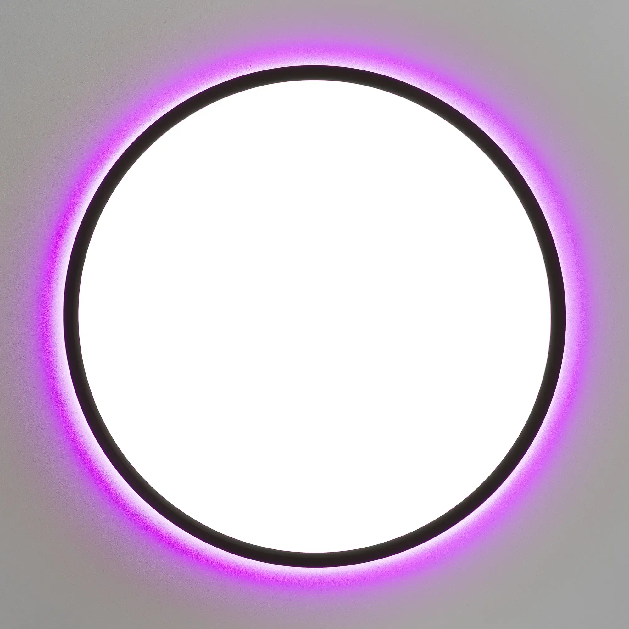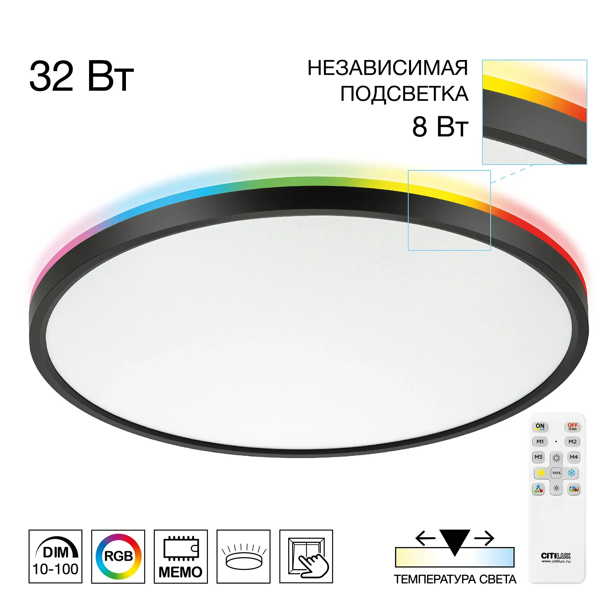 Изделие обладает высокой энергоэффективностью основного света – 120Лм/Вт. Площадь освещения до 17м². Мощность: основной свет - 32Вт, потолочная подсветка – 8Вт. Диаметр 40см, высота 2,5см. Свет безопасный для глаз, без мерцания и пульсаций. Тип крепления – удобная монтажная платформа.