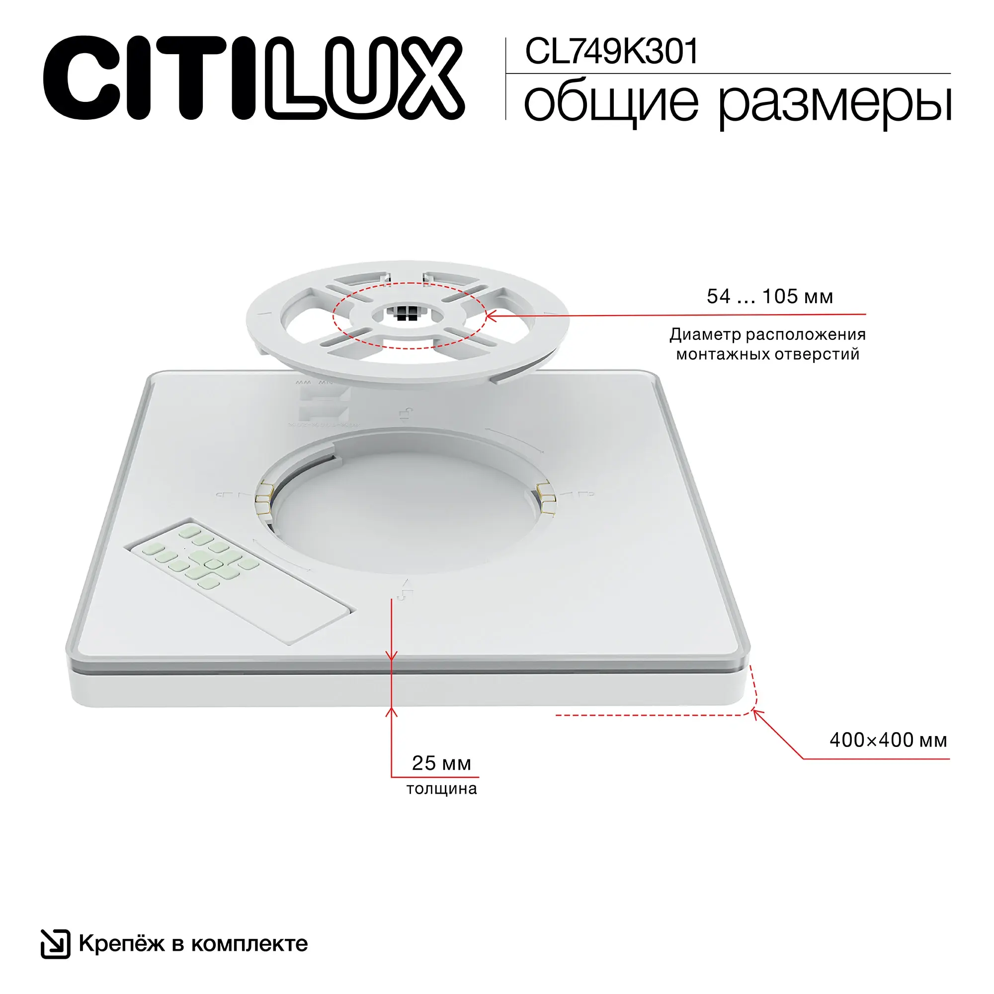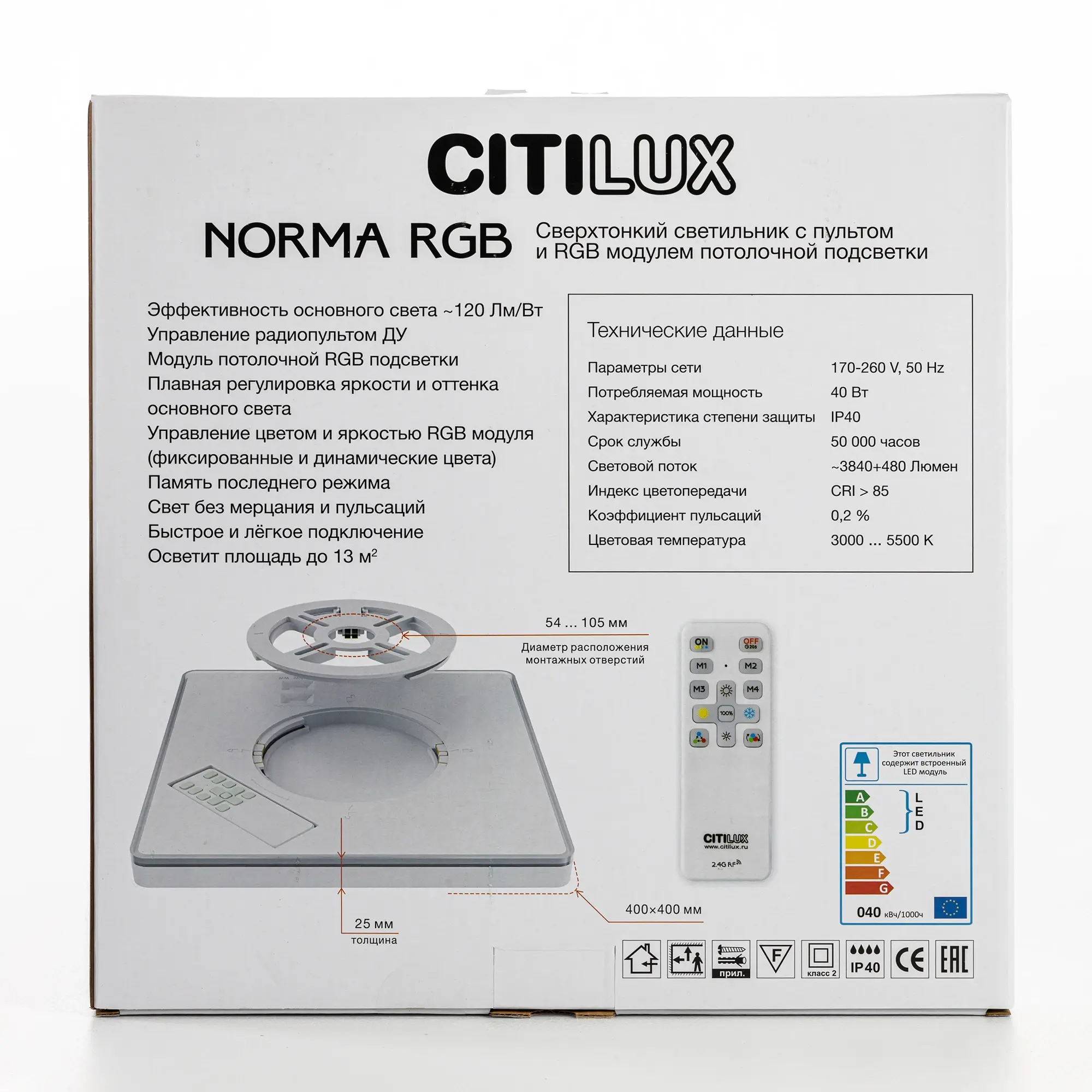 Изделие обладает высокой энергоэффективностью основного света – 120Лм/Вт, осветит до 13м². Мощность: основной свет - 32Вт, потолочная подсветка – 8Вт. Размер 30х30см, высота 2,5см. Свет безопасный для глаз, без мерцания и пульсаций. Тип крепления – удобная монтажная платформа.