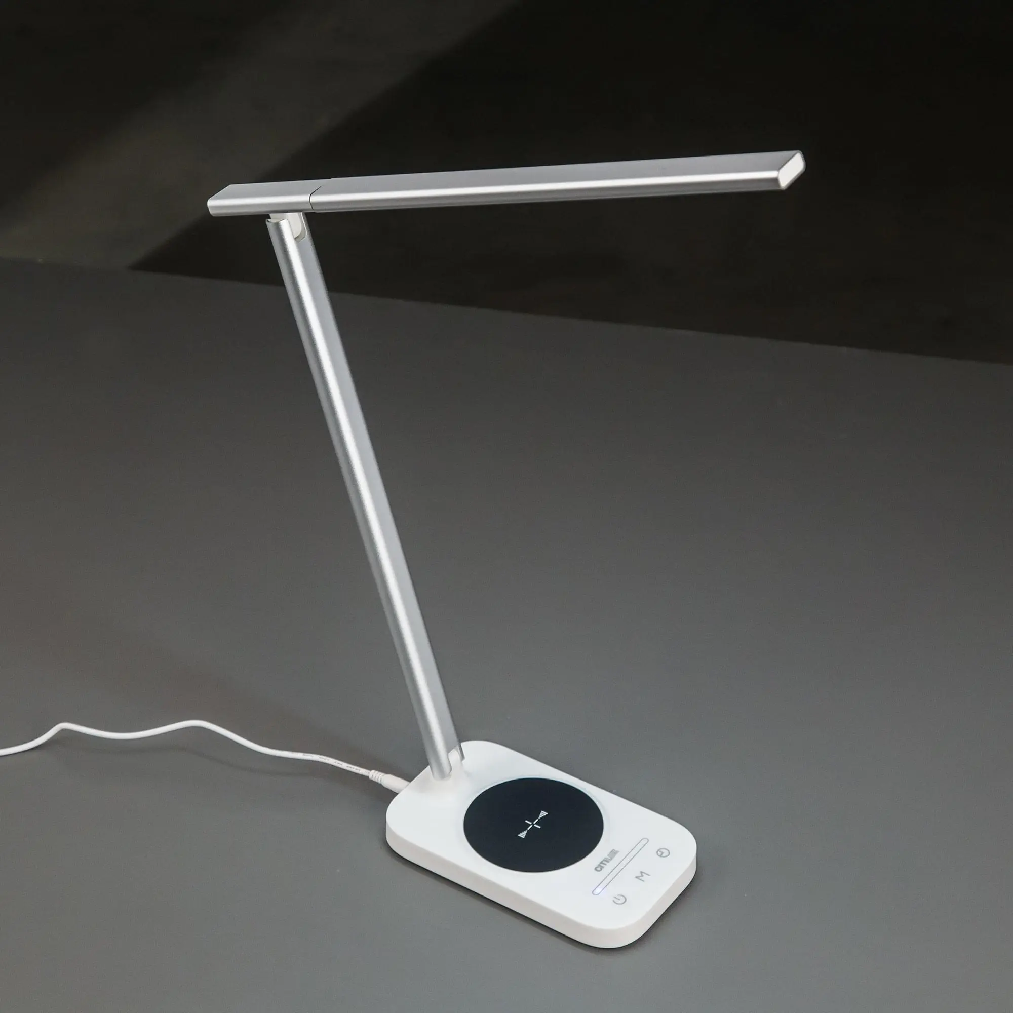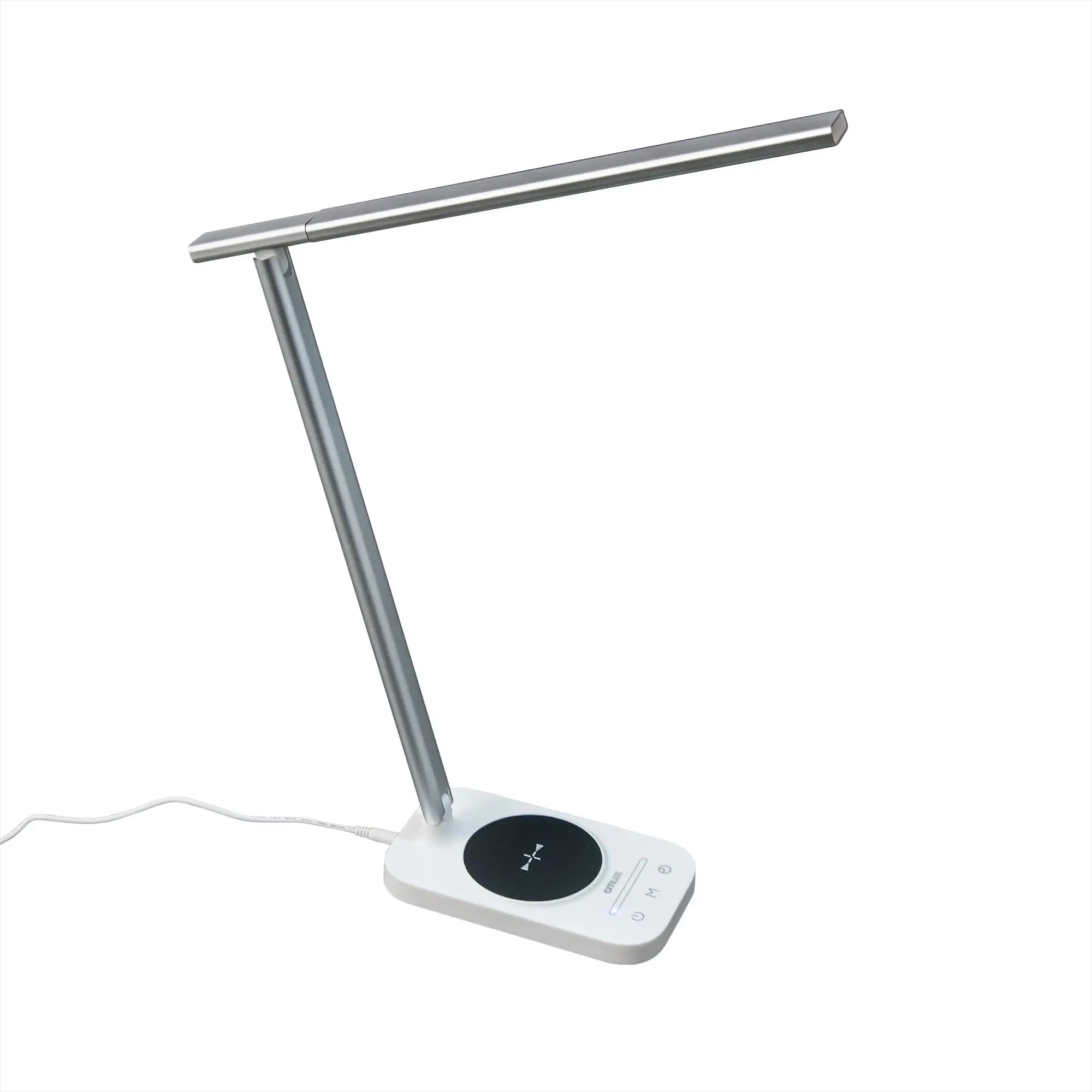 Светодиодная настольная лампа Citilux Ньютон CL803051 с беспроводной зарядкой мощностью 10Вт и USB выходом 5В/1А. Основание светильника прямоугольной формы из ударопрочного полимера, стойка и корпус светодиодного модуля - алюминиевый профиль, цвет сочетание белого и серебристого. Сенсорное управление: выключатель с подсветкой, управление цветовой температурой – 3000-4000-5500К (тёплый, нейтральный, холодный свет), пять уровней яркости от 10% до 100%, таймер выключения 45мин. Мощность светильника 9Вт. Длина сетевого провода 150см. Настольная лампа Citilux Ньютон CL803051 подойдет для рабочего стола руководителей, офисных работников, студентов и школьников.,