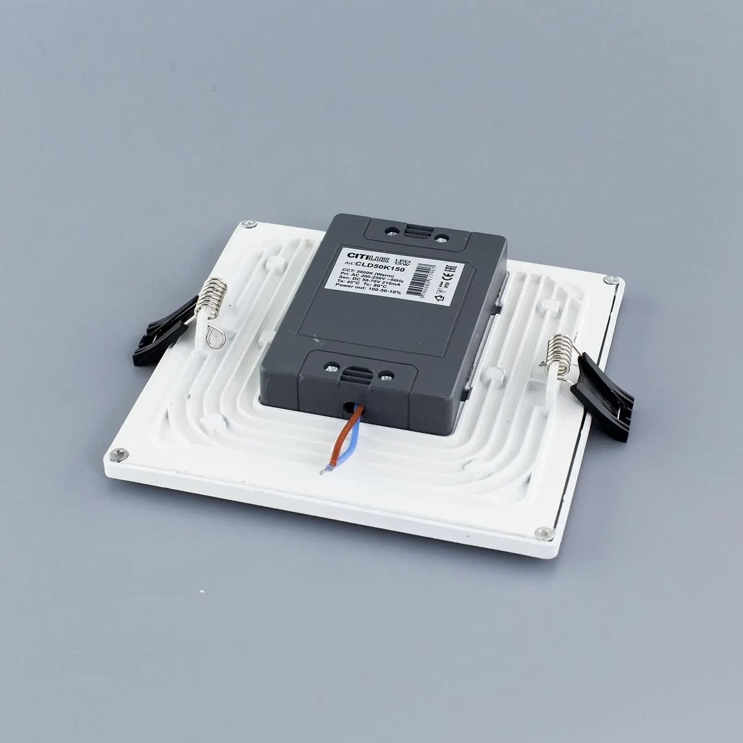 Изделие мощностью 15Вт, световой поток 1200Лм, цветовая температура – 4000К – нейтральный белый свет, класс защиты IP20, осветит до 6м². Внешний размер светильника 14,5х14,5, глубина врезки 2см.
