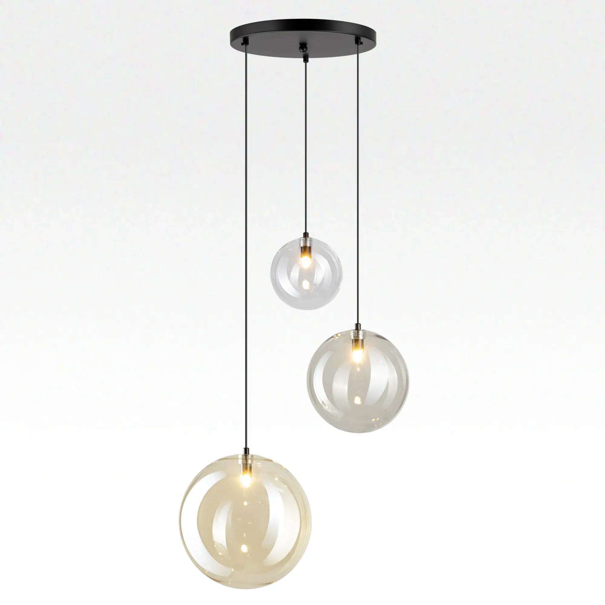 Каскадная люстра Citilux ORTON CL202133 представляет собой гармоничное сочетание строгих линий и воздушной лёгкости. Металлическое основание в форме идеального круга с чёрным матовым покрытием служит надёжной основой для подвесных стеклянных шаров. Прозрачные, с золотистым оттенком шампань и дымчатые плафоны (размером 15, 20 и 25см) превращают люстру в художественный элемент даже при выключенном свете.