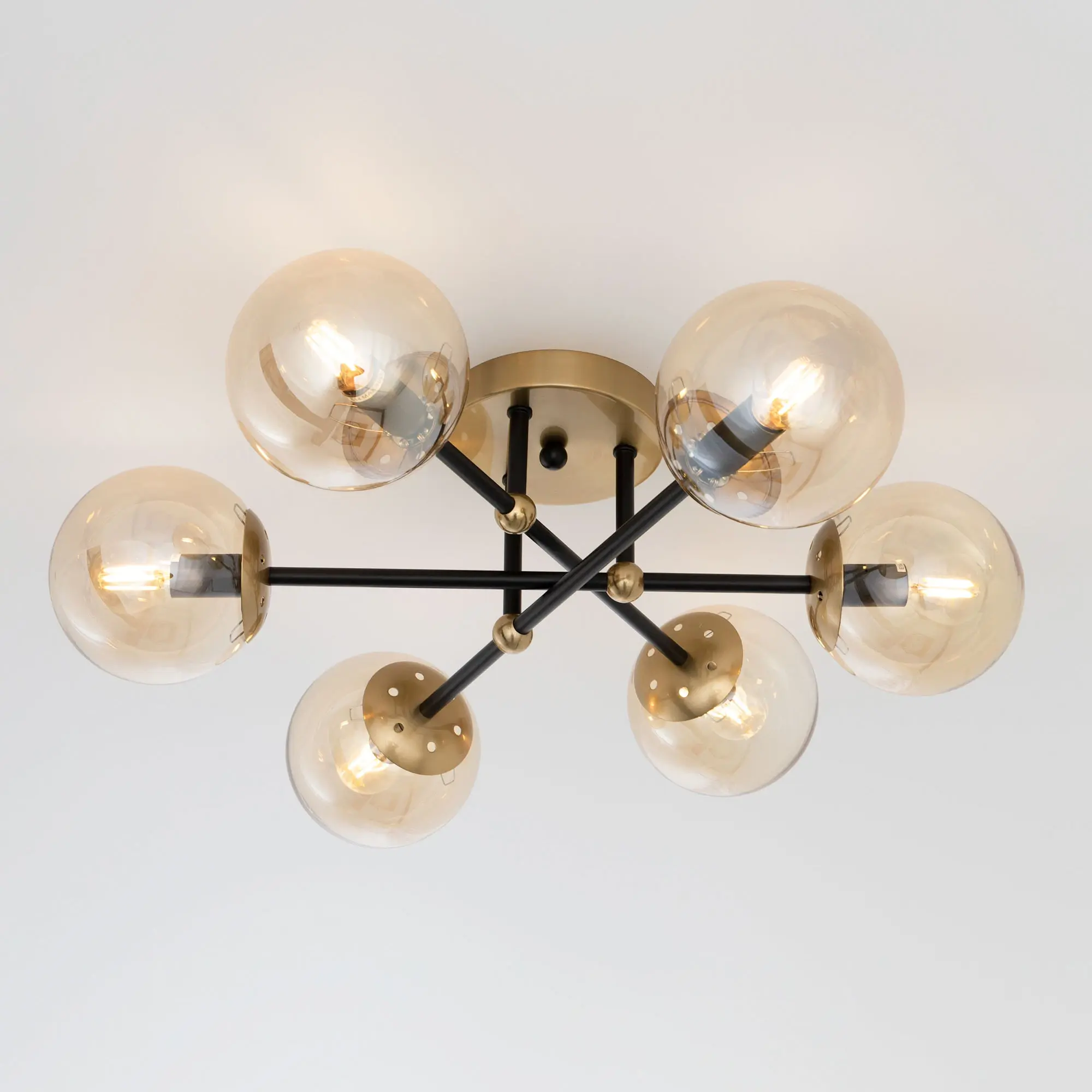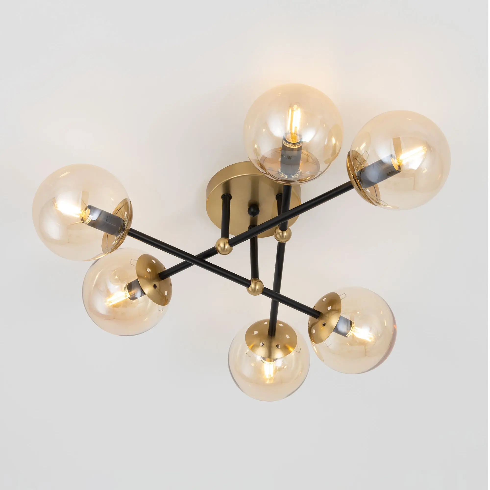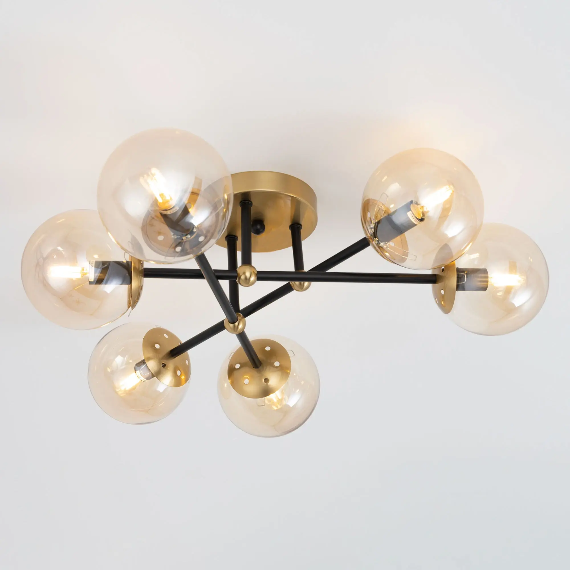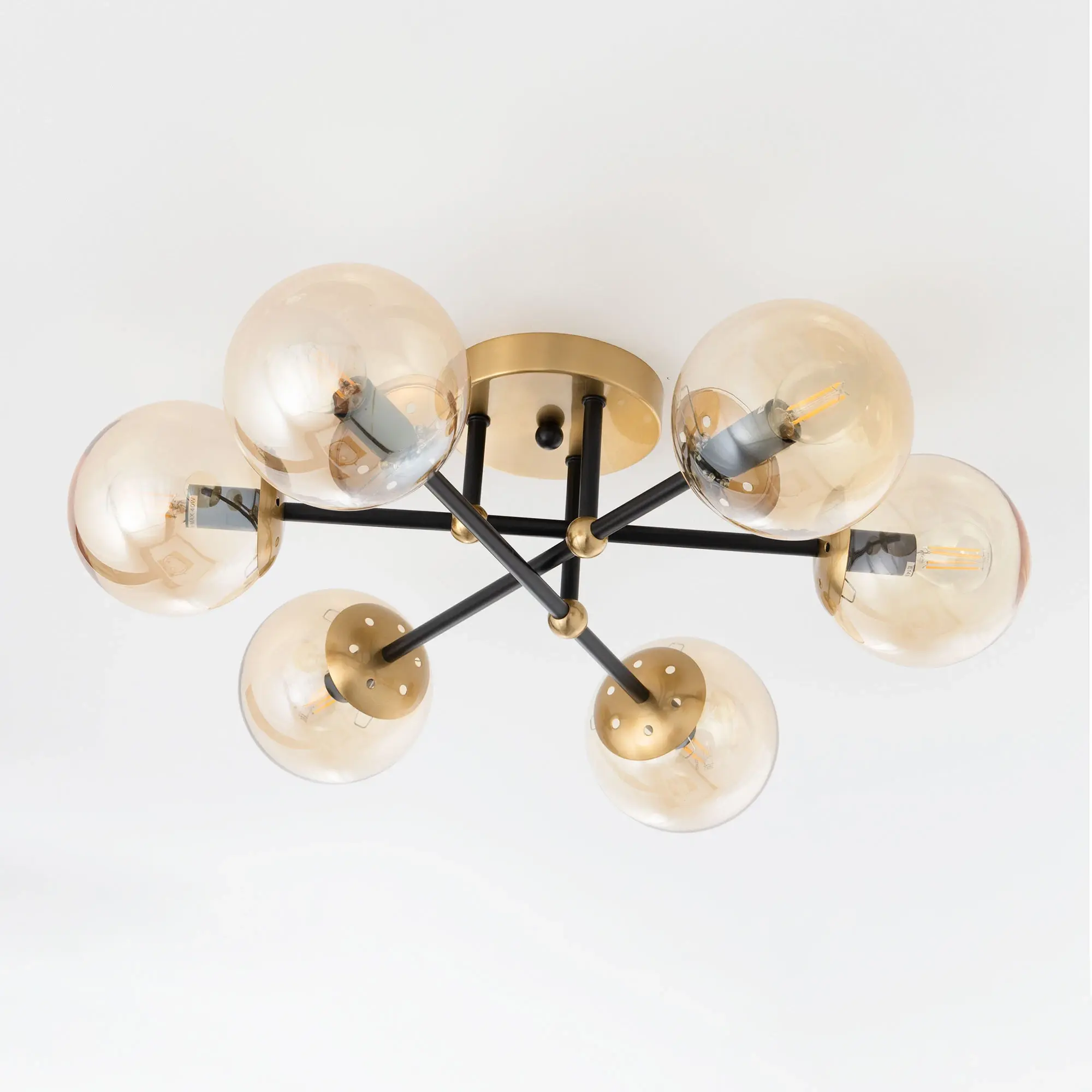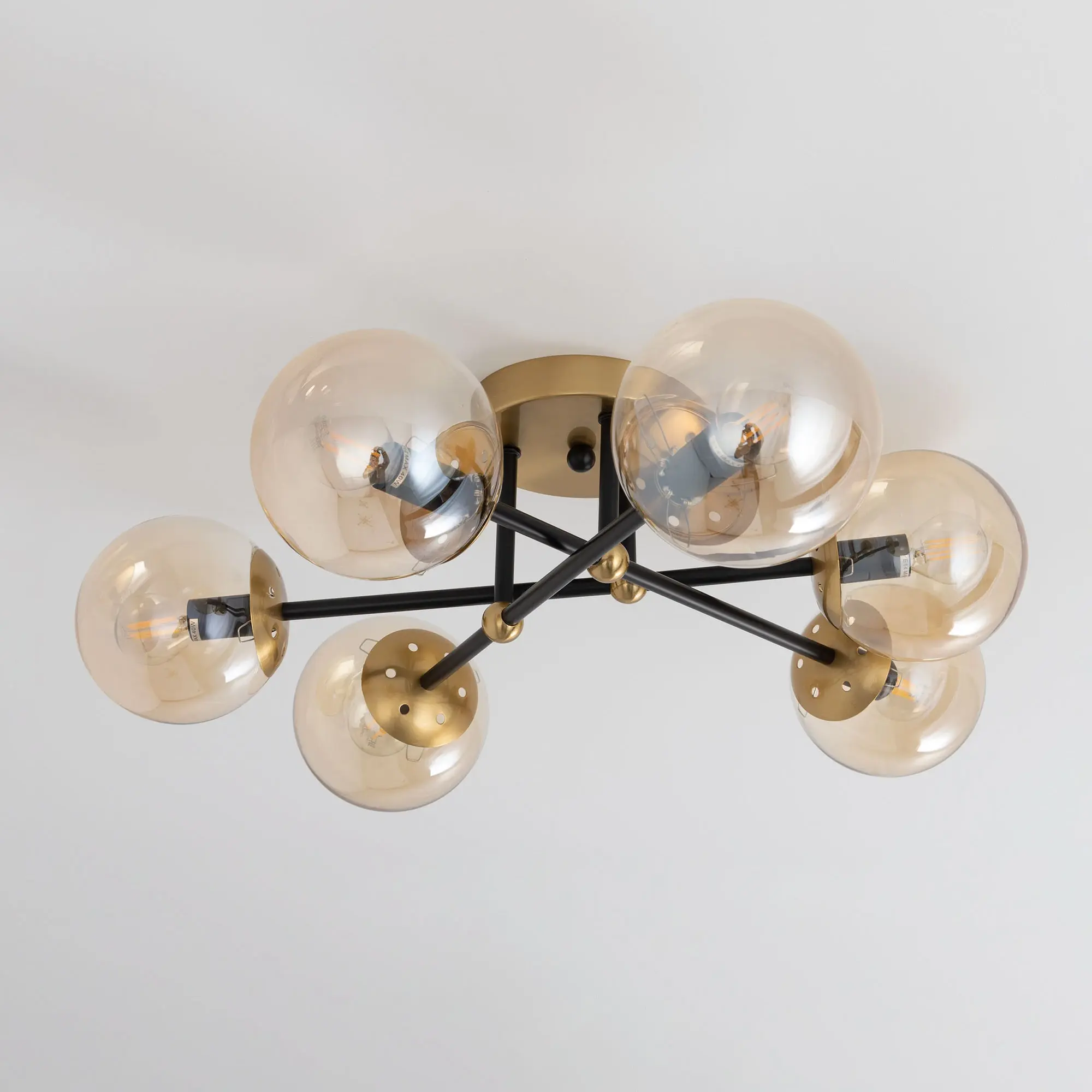 Стильная потолочная люстра Citilux Памела CL144165 для модных интерьеров, оформленных в стиле сканди, модерн или лофт. Корпус светильника металлический, цвет – сочетание чёрного и бронзы. Основание круглое, рожки-штанги расположены параллельно потолку. Плафоны в форме шара, изготовлены из прозрачного стекла светло-янтарного оттенка. В изделии используются 6 ламп с цоколем Е14, максимальной мощностью для ламп накаливания 40Вт. Светодиодные лампы можно устанавливать более яркие. Подходит для всех типов потолков, в том числе натяжных, тип крепления – планка,