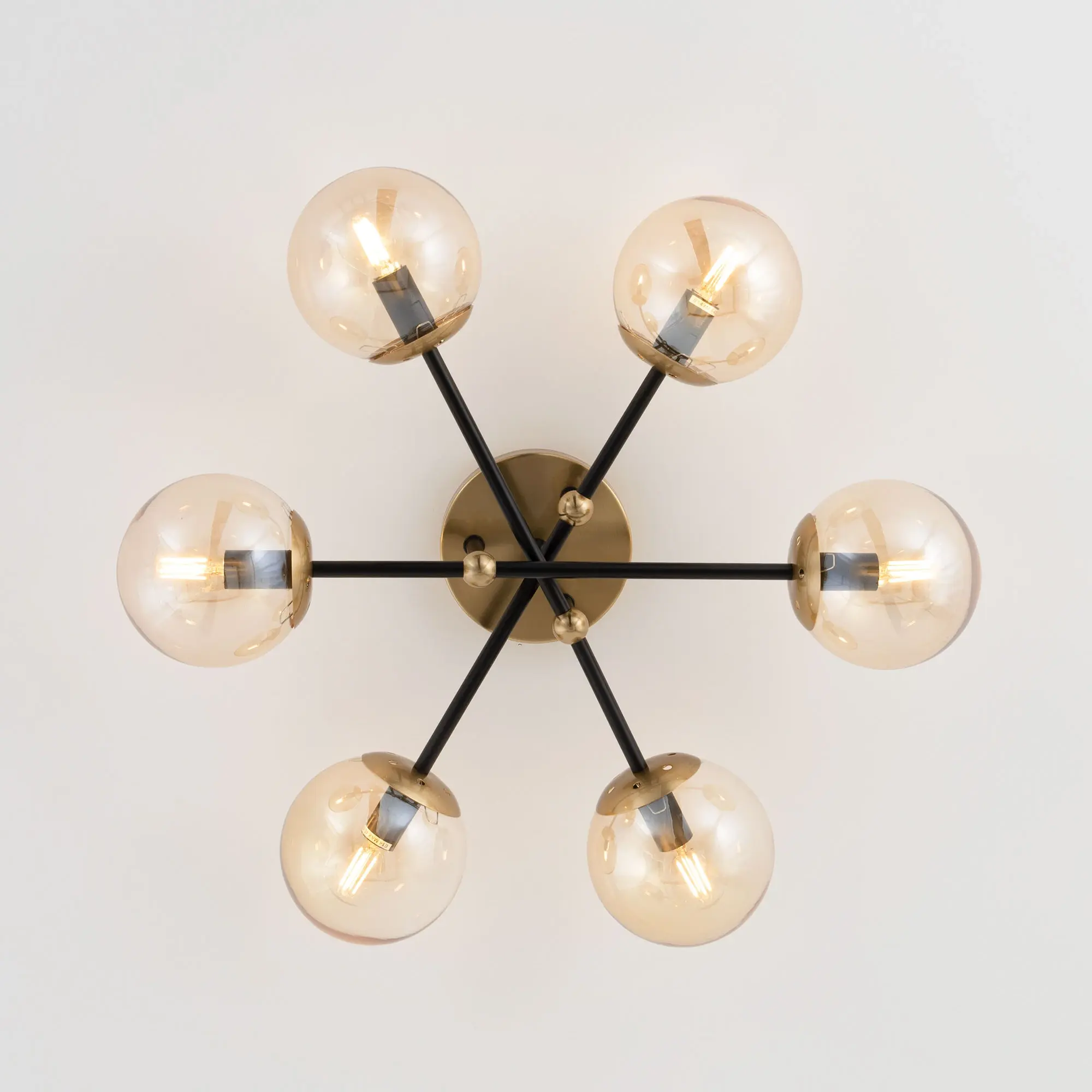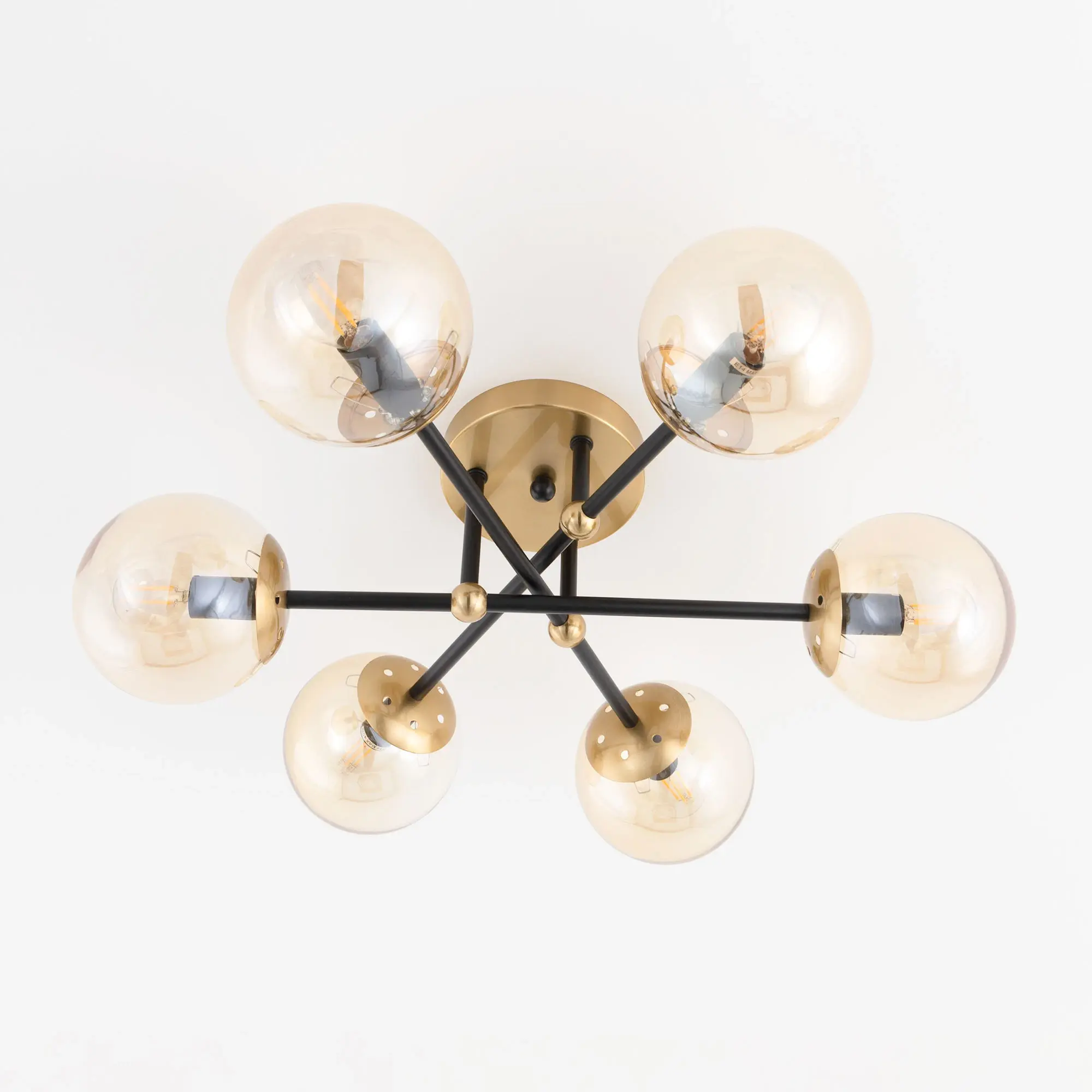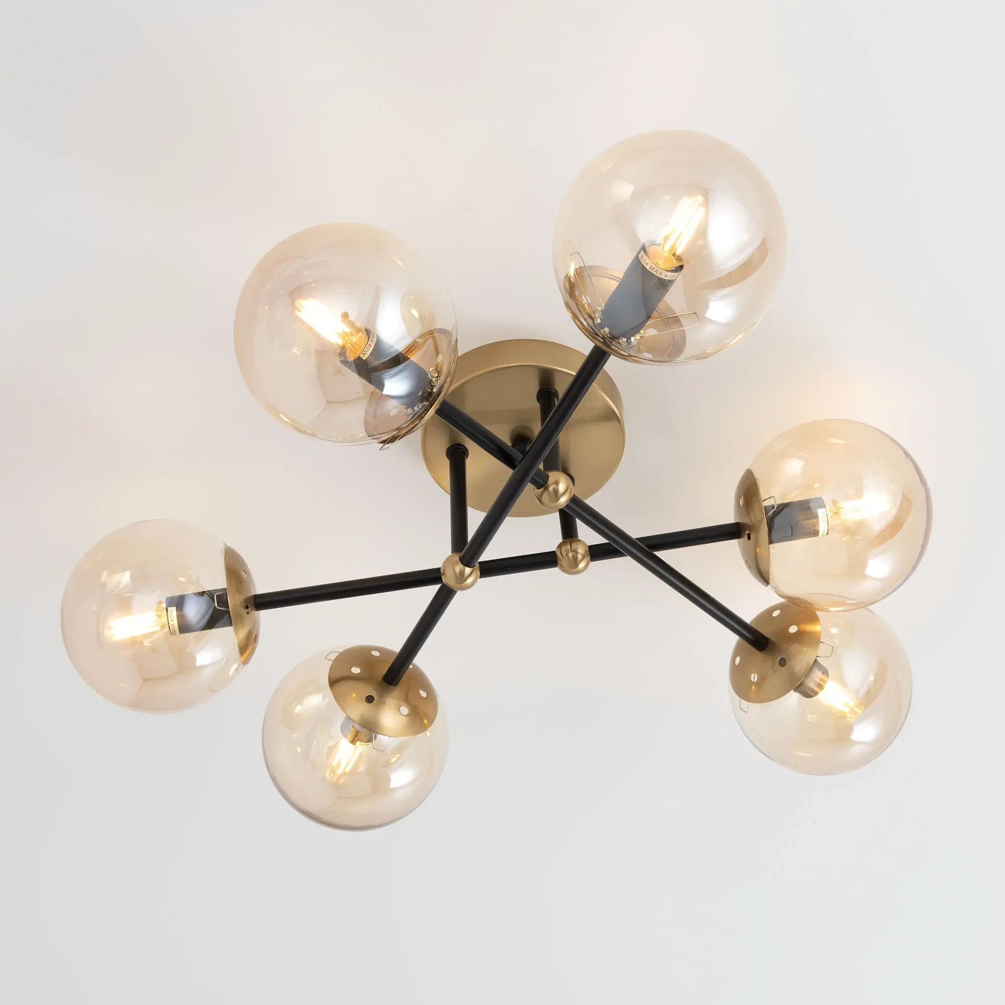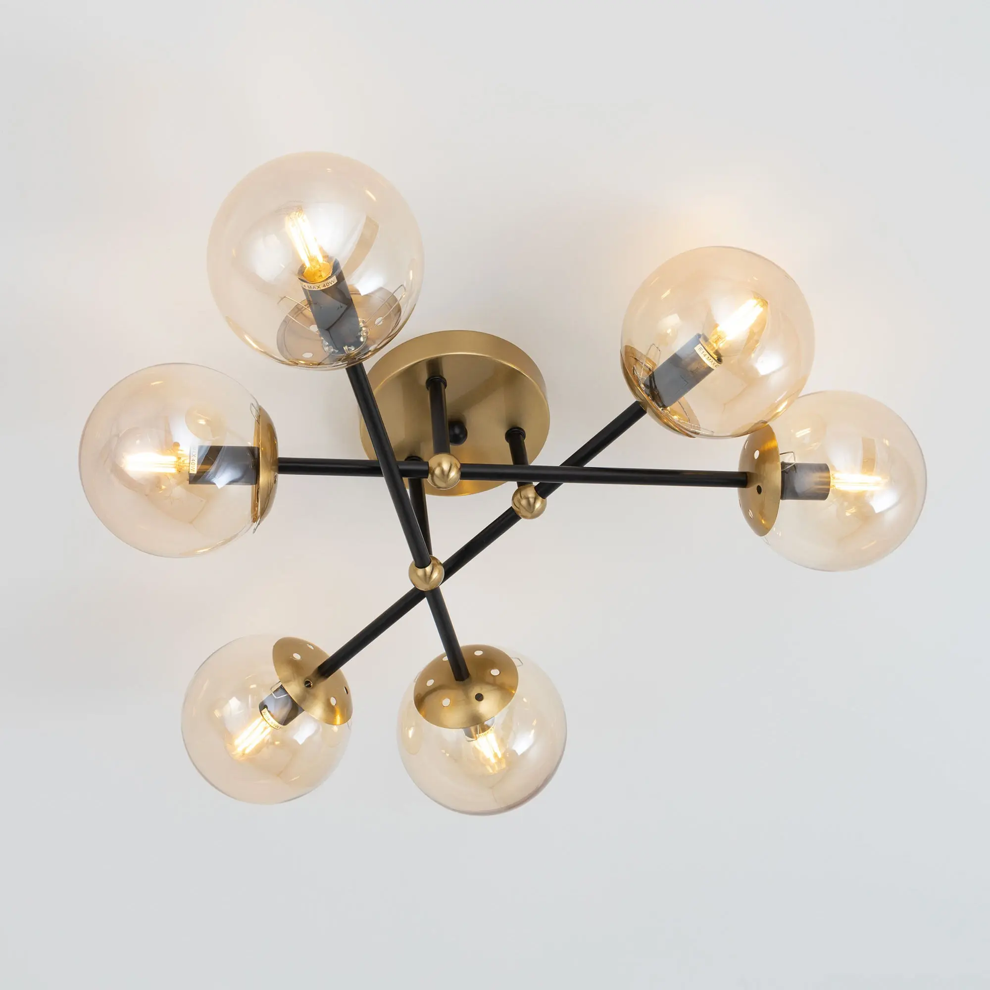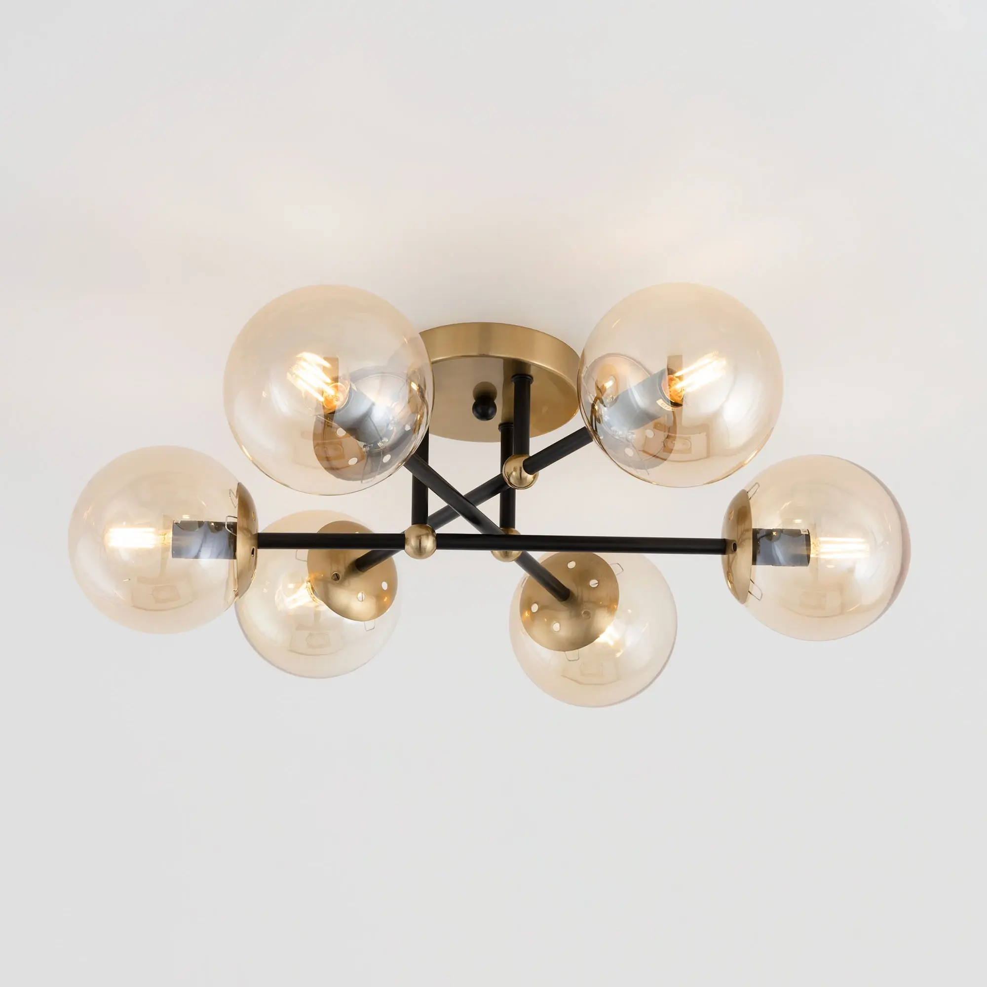 Стильная потолочная люстра Citilux Памела CL144165 для модных интерьеров, оформленных в стиле сканди, модерн или лофт. Корпус светильника металлический, цвет – сочетание чёрного и бронзы. Основание круглое, рожки-штанги расположены параллельно потолку. Плафоны в форме шара, изготовлены из прозрачного стекла светло-янтарного оттенка. В изделии используются 6 ламп с цоколем Е14, максимальной мощностью для ламп накаливания 40Вт. Светодиодные лампы можно устанавливать более яркие. Подходит для всех типов потолков, в том числе натяжных, тип крепления – планка,