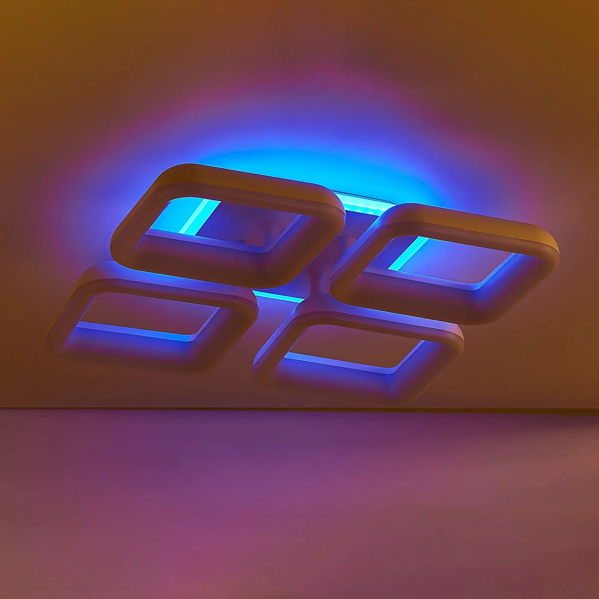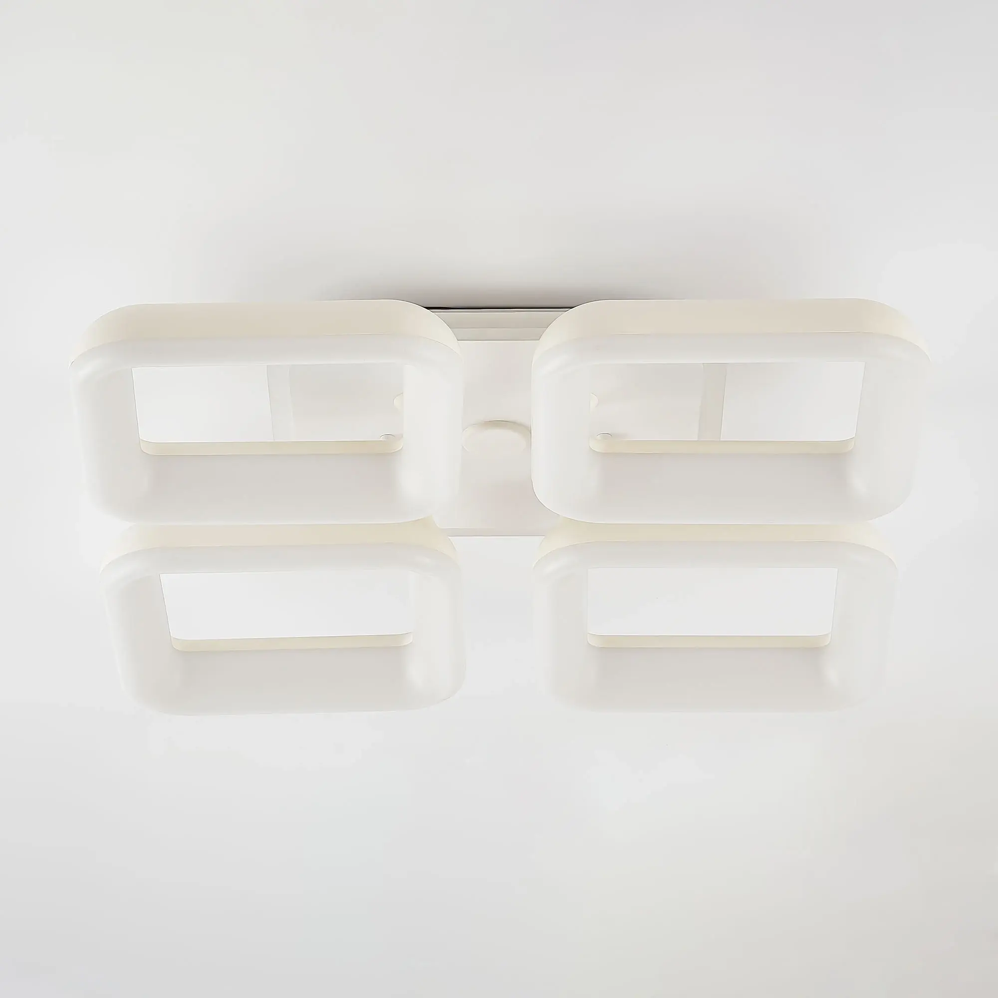 Светильник белый матовый, с квадратным основанием. Четыре светодиодных модуля плафона, формирующих внешний вид люстры, так же квадратной формы. Корпус плафонов белого цвета изготовлен из ударопрочного полимера, рассеиватель белый матовый из оптического полимера. Модель подходит для всех типов потолков, в том числе натяжных.