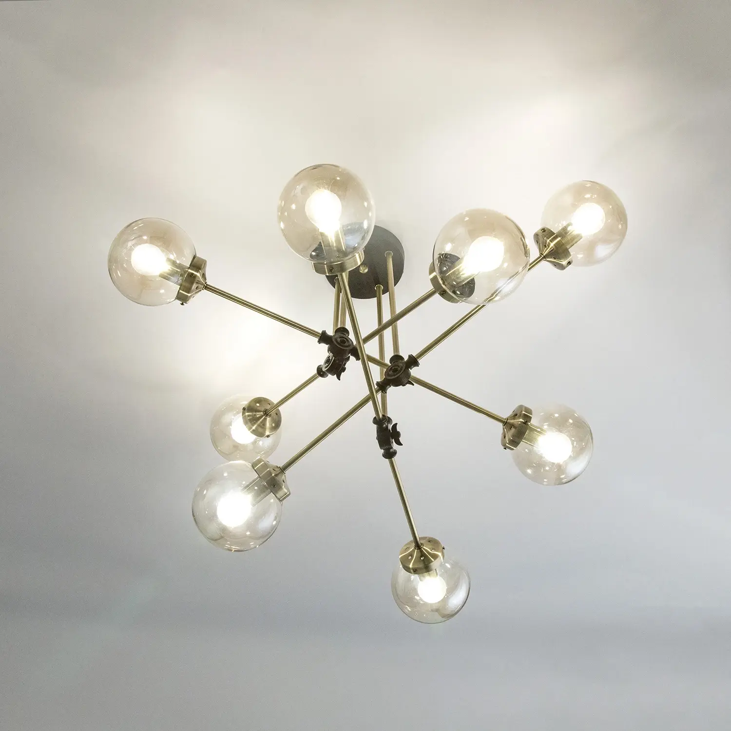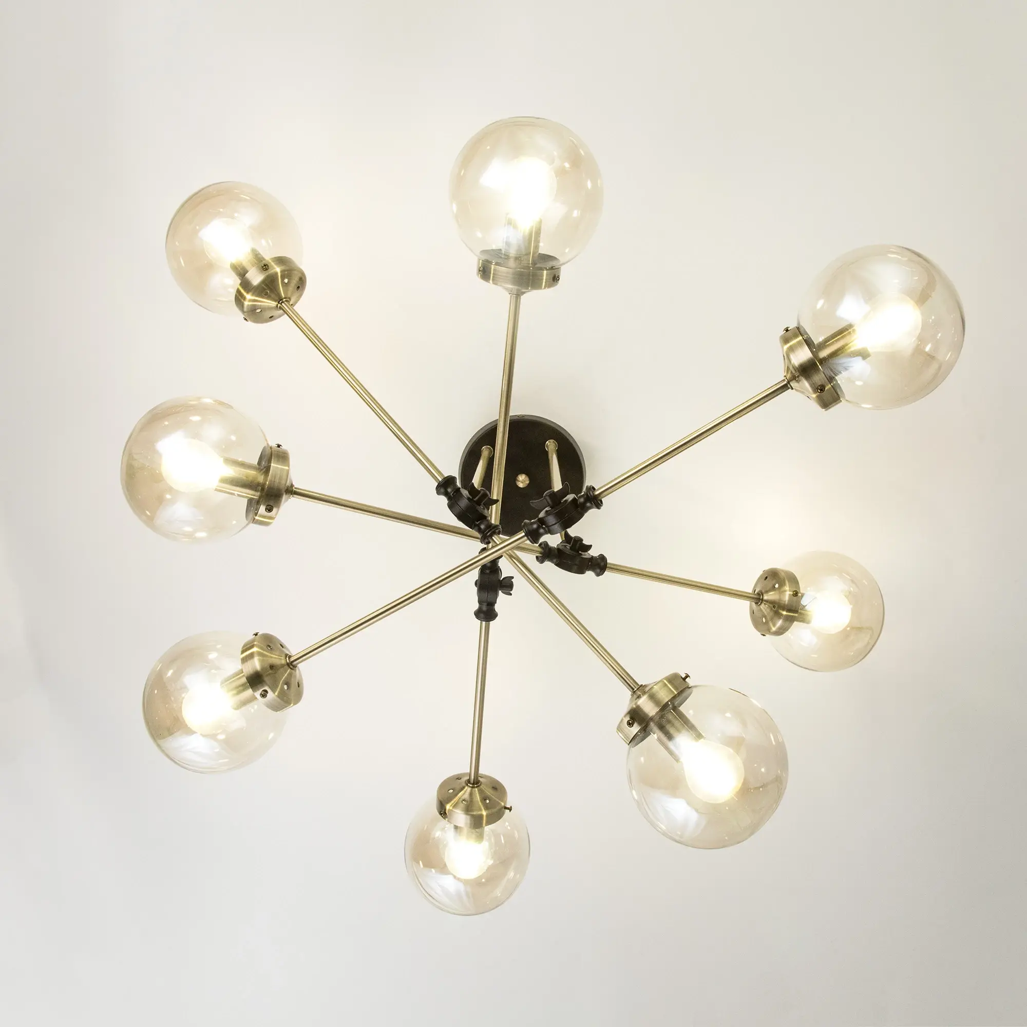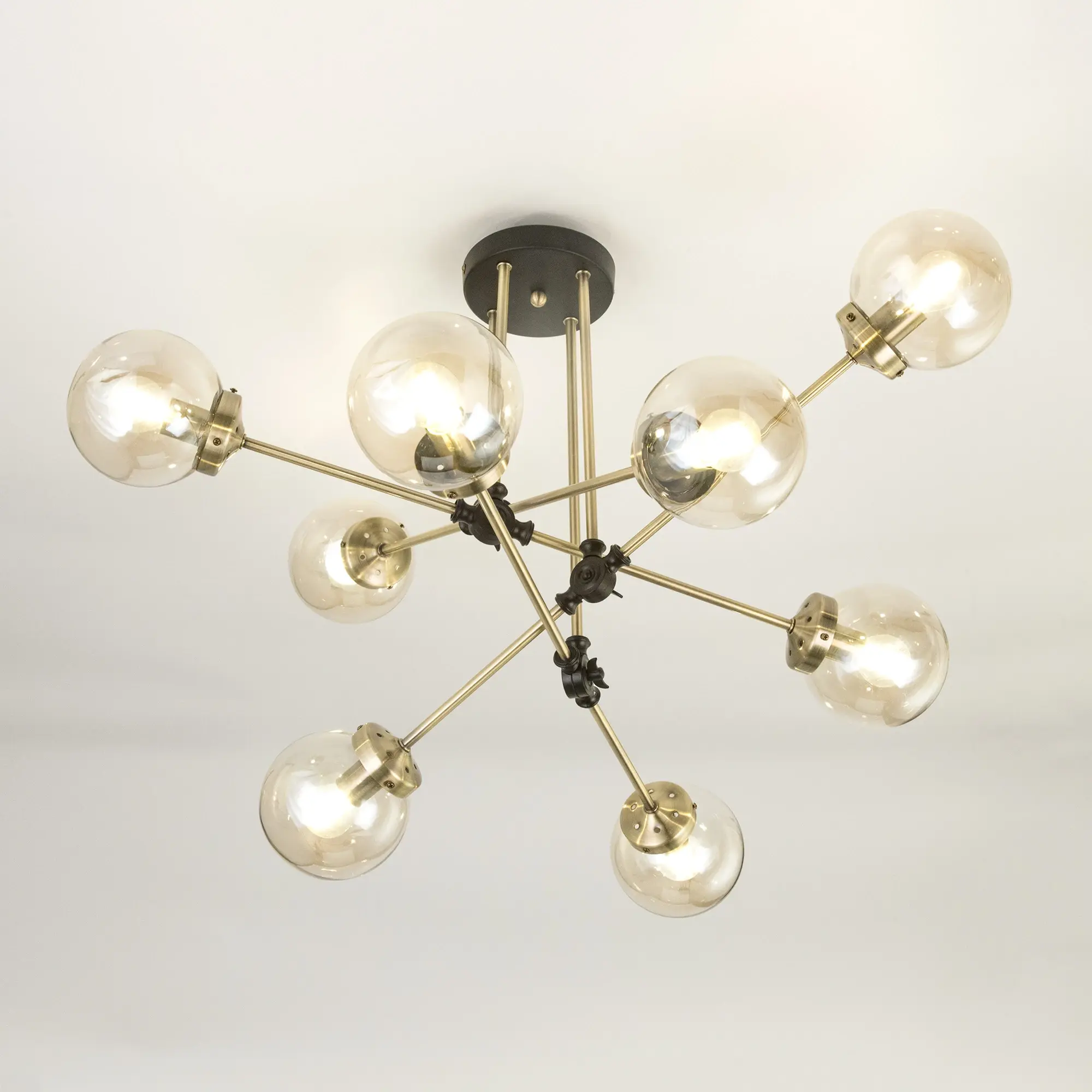Люстра поворотная Citilux Планета CL105185 для модных интерьеров. Корпус металлический, цвет – сочетание чёрного и бронзы. Плафоны в форме шара, изготовлены из прозрачного стекла светло-янтарного оттенка. В изделии используются 8 ламп с цоколем Е14, максимальной мощностью для ламп накаливания 20Вт. Рекомендуем устанавливать светодиодные филаментные лампы с прозрачной колбой. Модель рассчитана на работу как с одноклавишным, так и с двухклавишным выключателем. После установки, двойные рожки-штанги можно закрепить в разных положениях, создав свой неповторимый дизайн. Подходит для всех типов потолков, в том числе натяжных, тип крепления – планка. Площадь освещения около 22м²