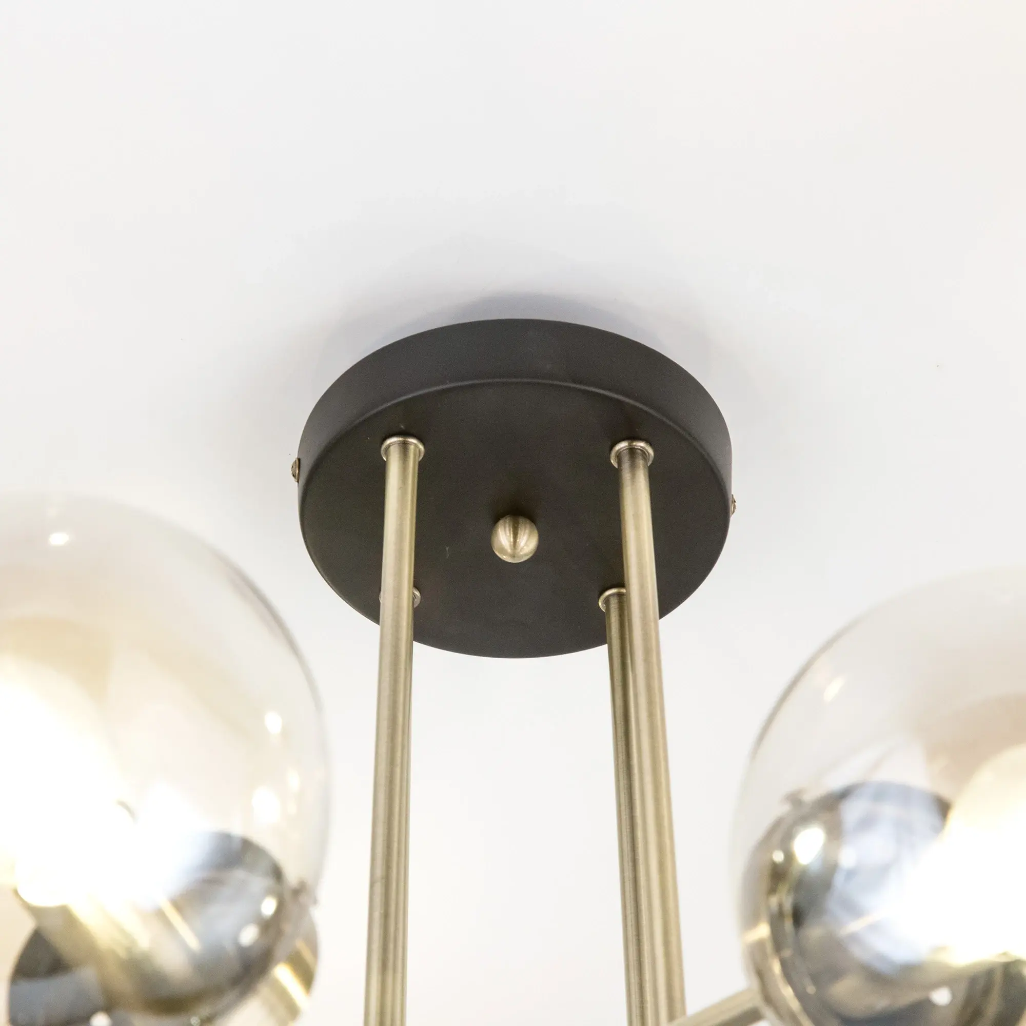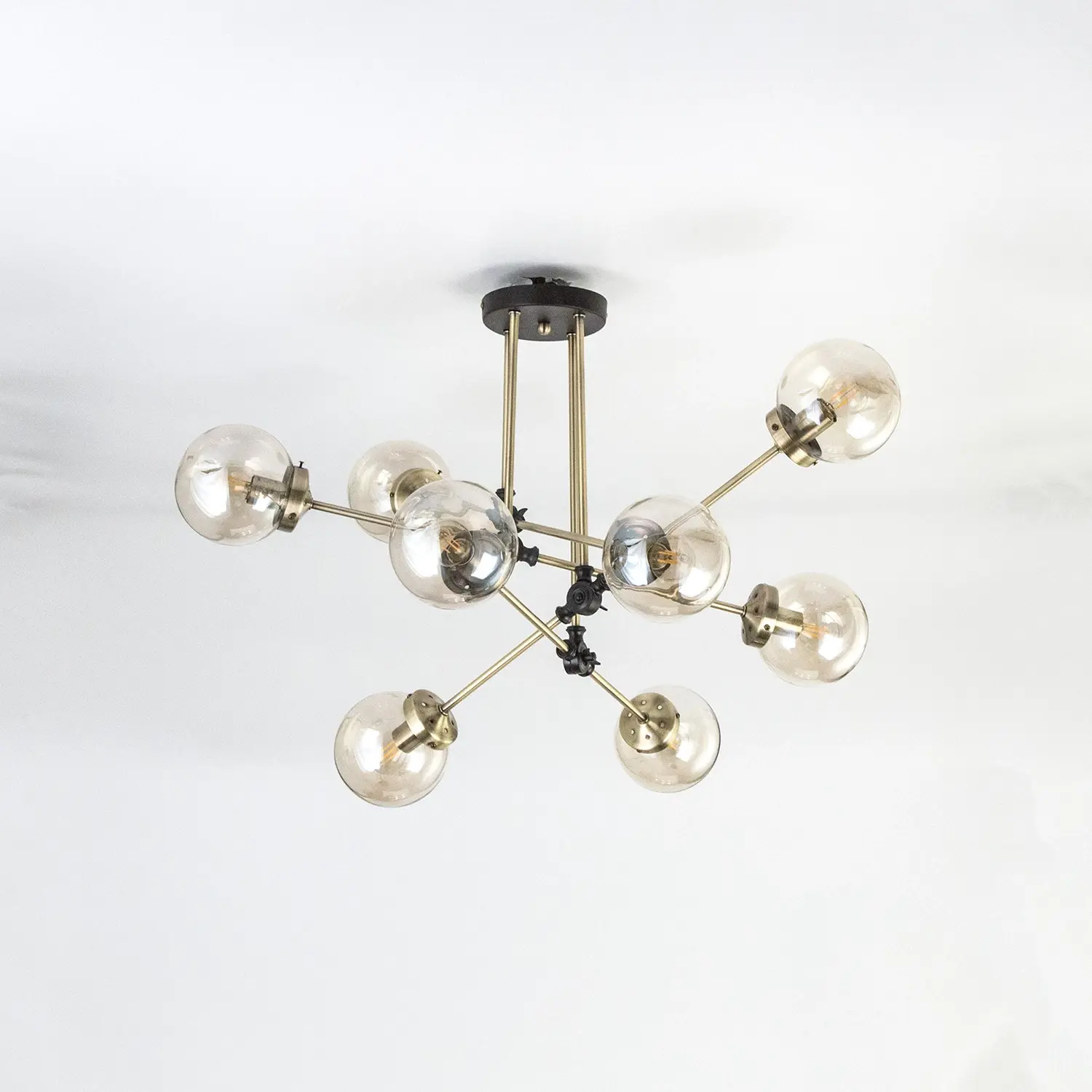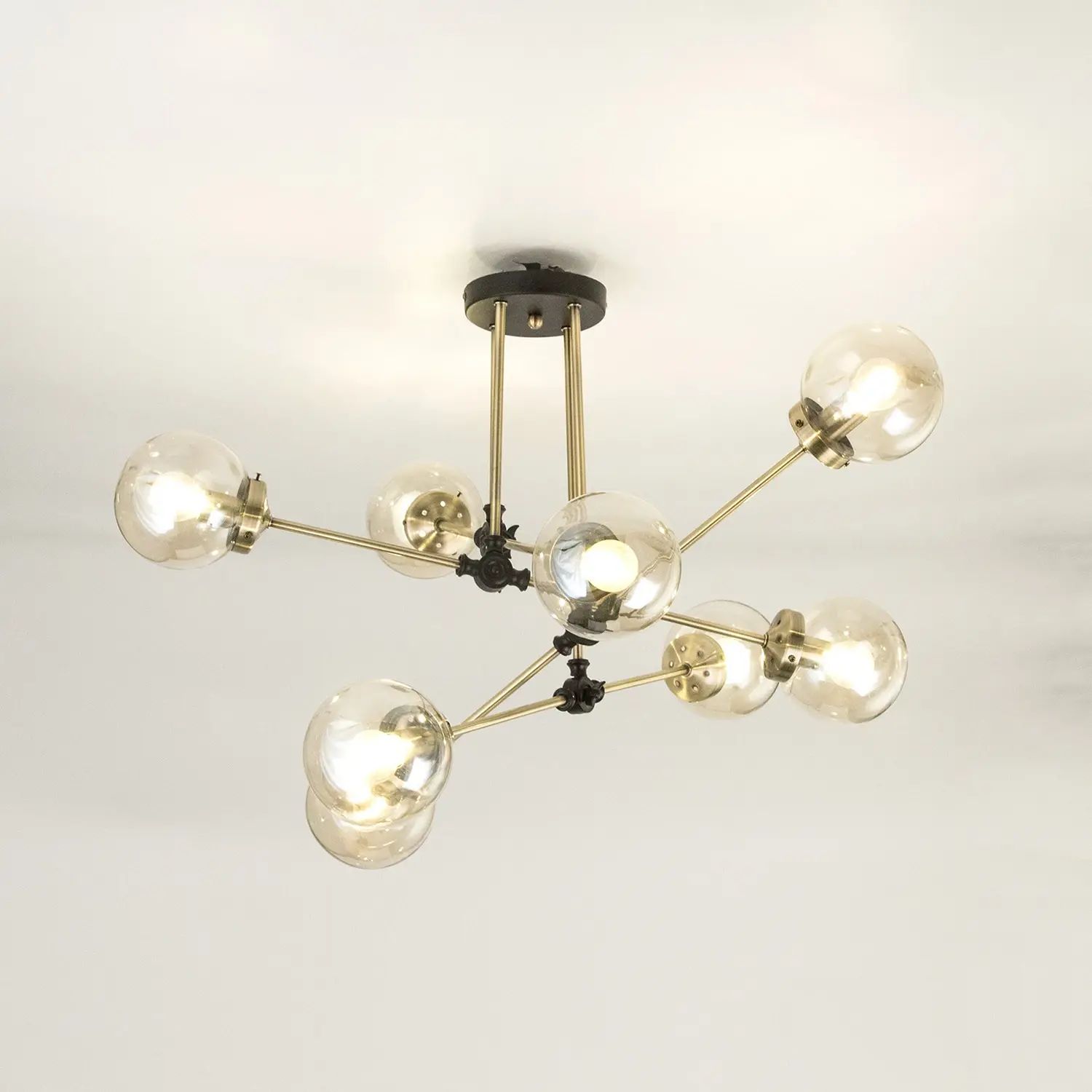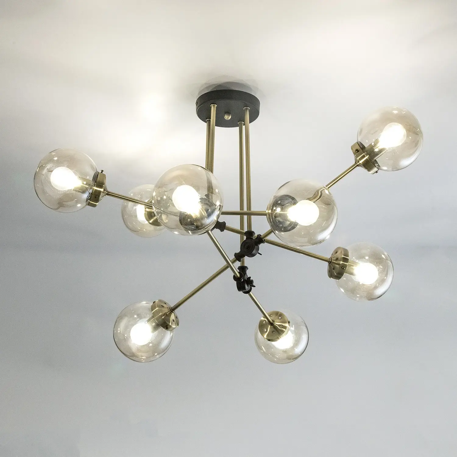 Люстра поворотная Citilux Планета CL105185 для модных интерьеров. Корпус металлический, цвет – сочетание чёрного и бронзы. Плафоны в форме шара, изготовлены из прозрачного стекла светло-янтарного оттенка. В изделии используются 8 ламп с цоколем Е14, максимальной мощностью для ламп накаливания 20Вт. Рекомендуем устанавливать светодиодные филаментные лампы с прозрачной колбой. Модель рассчитана на работу как с одноклавишным, так и с двухклавишным выключателем. После установки, двойные рожки-штанги можно закрепить в разных положениях, создав свой неповторимый дизайн. Подходит для всех типов потолков, в том числе натяжных, тип крепления – планка. Площадь освещения около 22м²