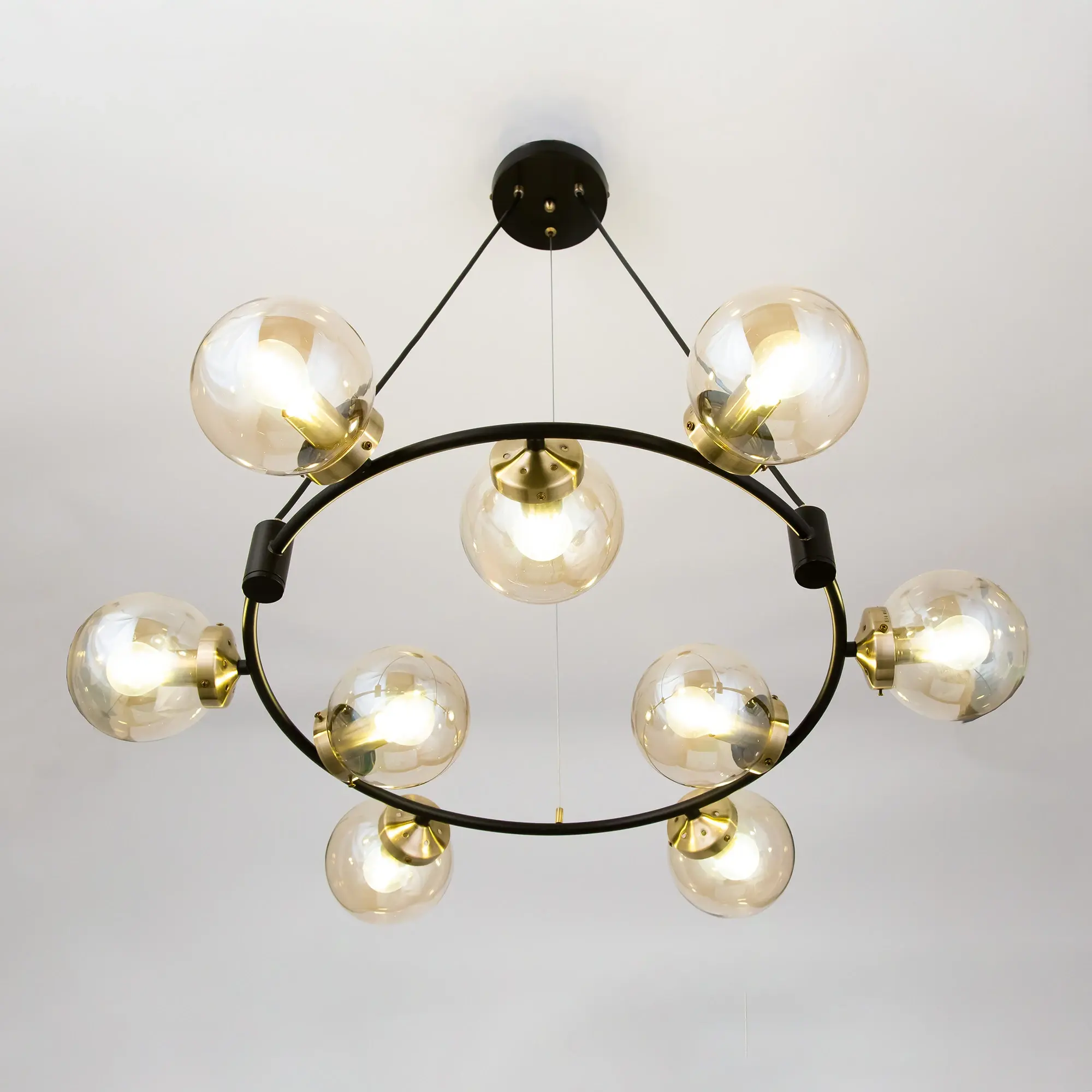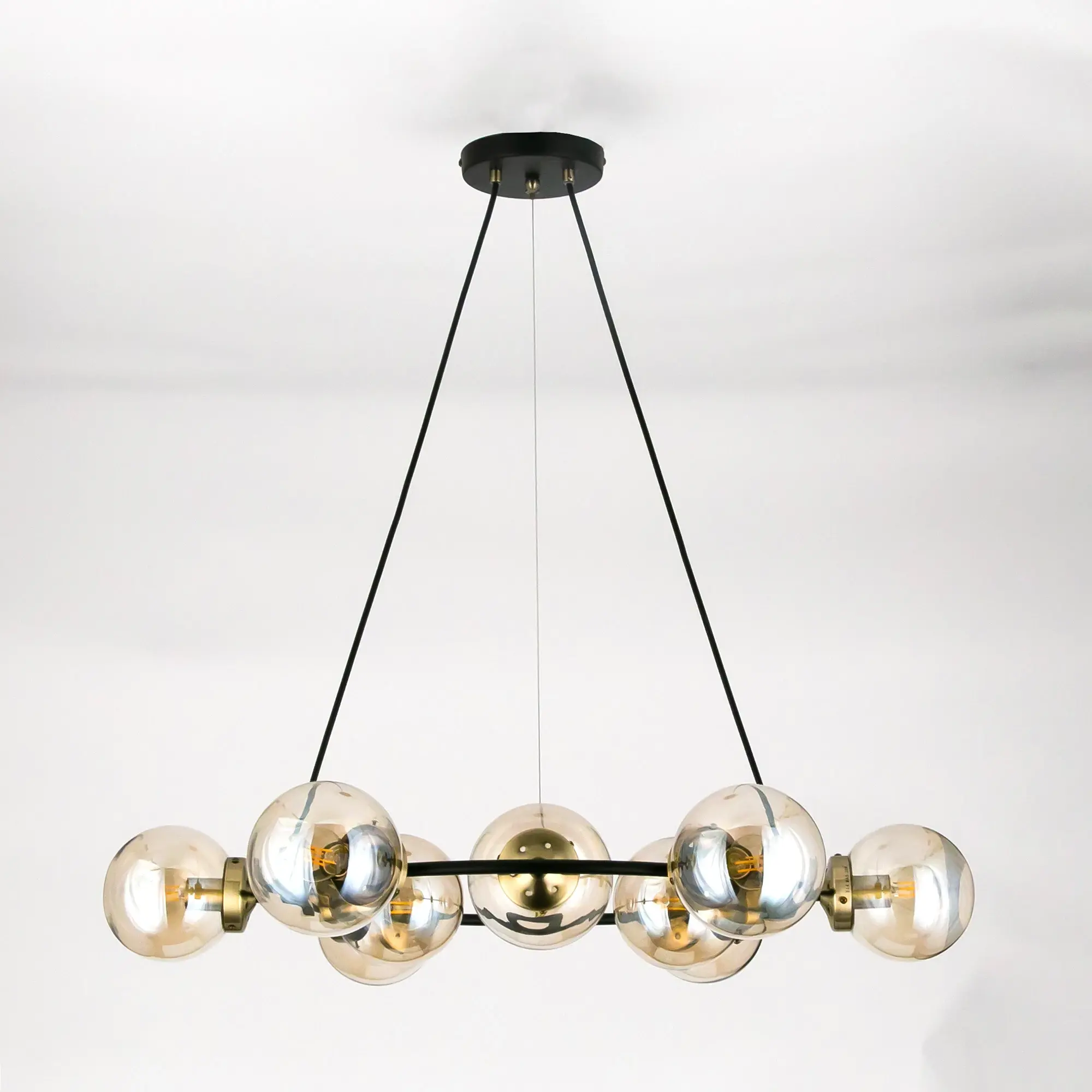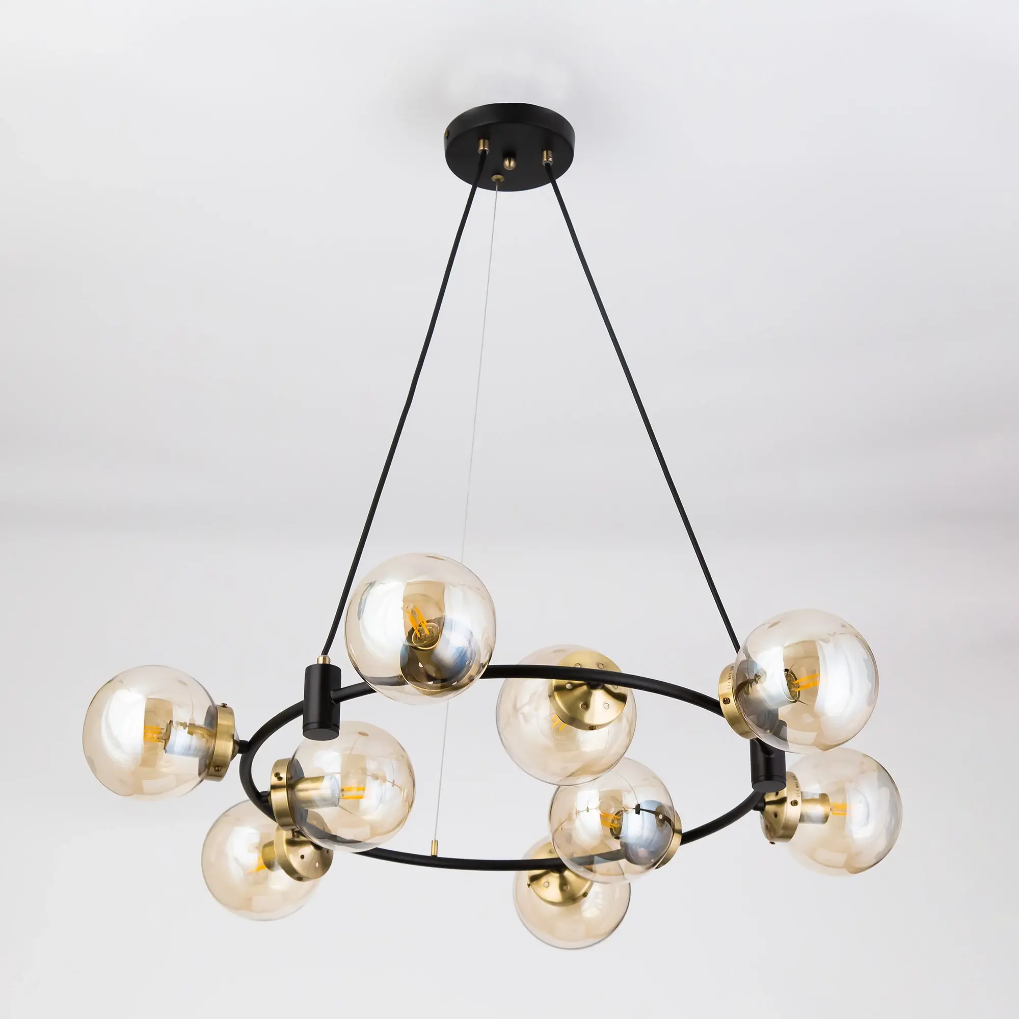 Подвесная люстра Citilux Планета CL105195 для модных интерьеров. Корпус металлический, в виде подвесного кольца, цвет – сочетание чёрного и бронзы. Плафоны в форме шара, изготовлены из прозрачного стекла светло-янтарного оттенка. В изделии используются 9 ламп с цоколем Е14, максимальной мощностью для ламп накаливания 20Вт. Рекомендуем устанавливать светодиодные филаментные лампы с прозрачной колбой. Модель рассчитана на работу как с одноклавишным, так и с двухклавишным выключателем. Высоту люстры можно отрегулировать в диапазоне от 30 до 80см. Подходит для всех типов потолков, в том числе натяжных, тип крепления – планка. Площадь освещения около 25м².