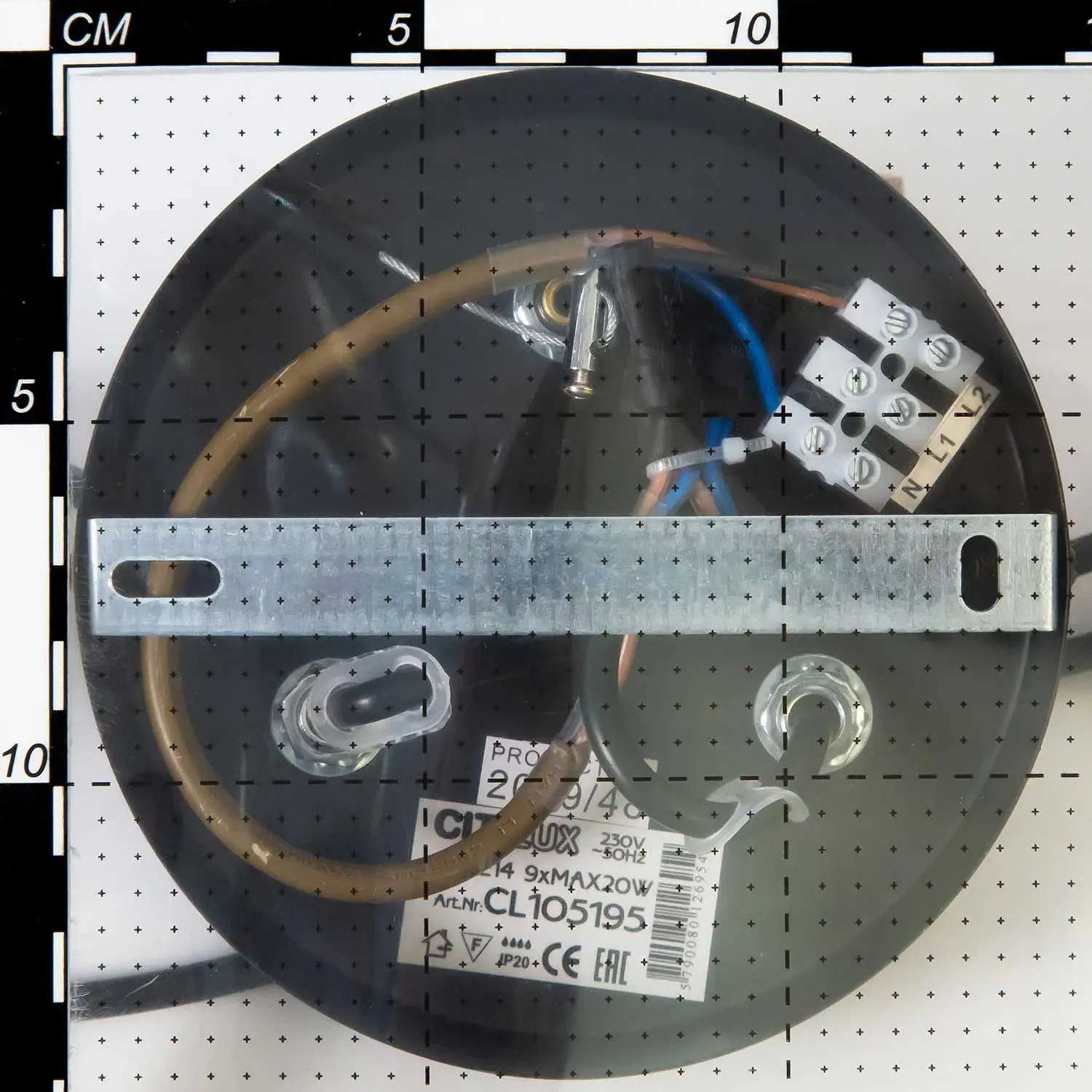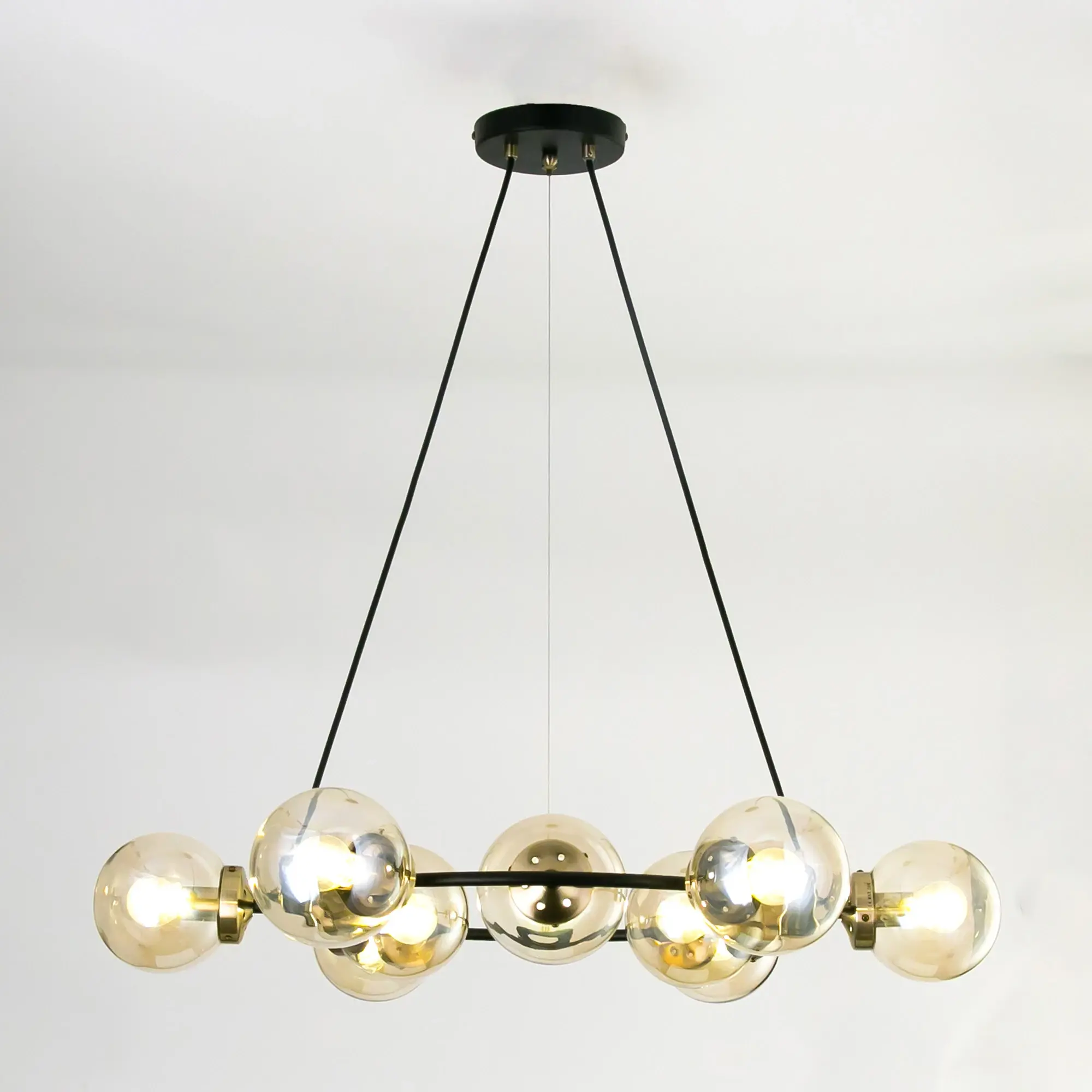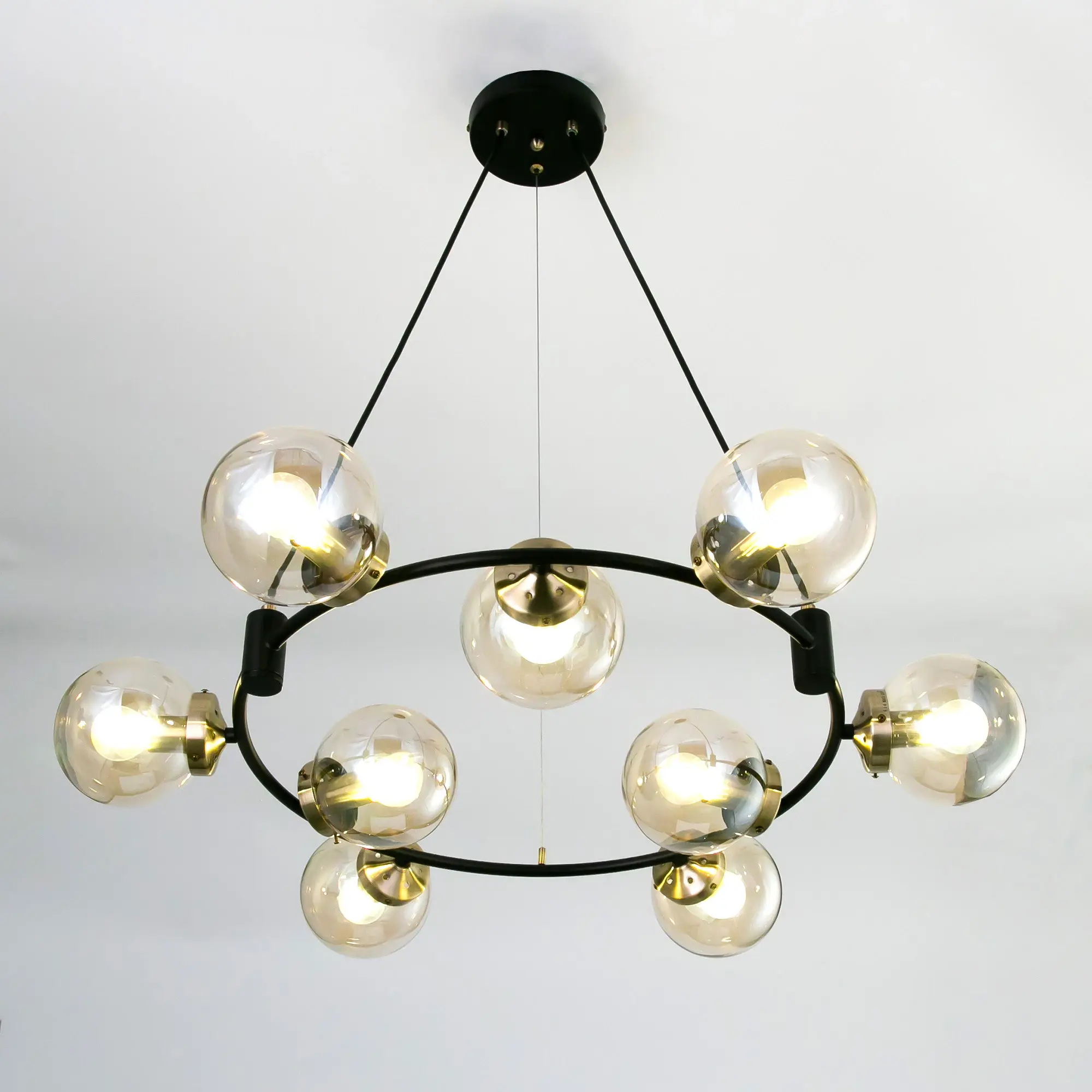 Подвесная люстра Citilux Планета CL105195 для модных интерьеров. Корпус металлический, в виде подвесного кольца, цвет – сочетание чёрного и бронзы. Плафоны в форме шара, изготовлены из прозрачного стекла светло-янтарного оттенка. В изделии используются 9 ламп с цоколем Е14, максимальной мощностью для ламп накаливания 20Вт. Рекомендуем устанавливать светодиодные филаментные лампы с прозрачной колбой. Модель рассчитана на работу как с одноклавишным, так и с двухклавишным выключателем. Высоту люстры можно отрегулировать в диапазоне от 30 до 80см. Подходит для всех типов потолков, в том числе натяжных, тип крепления – планка. Площадь освещения около 25м².