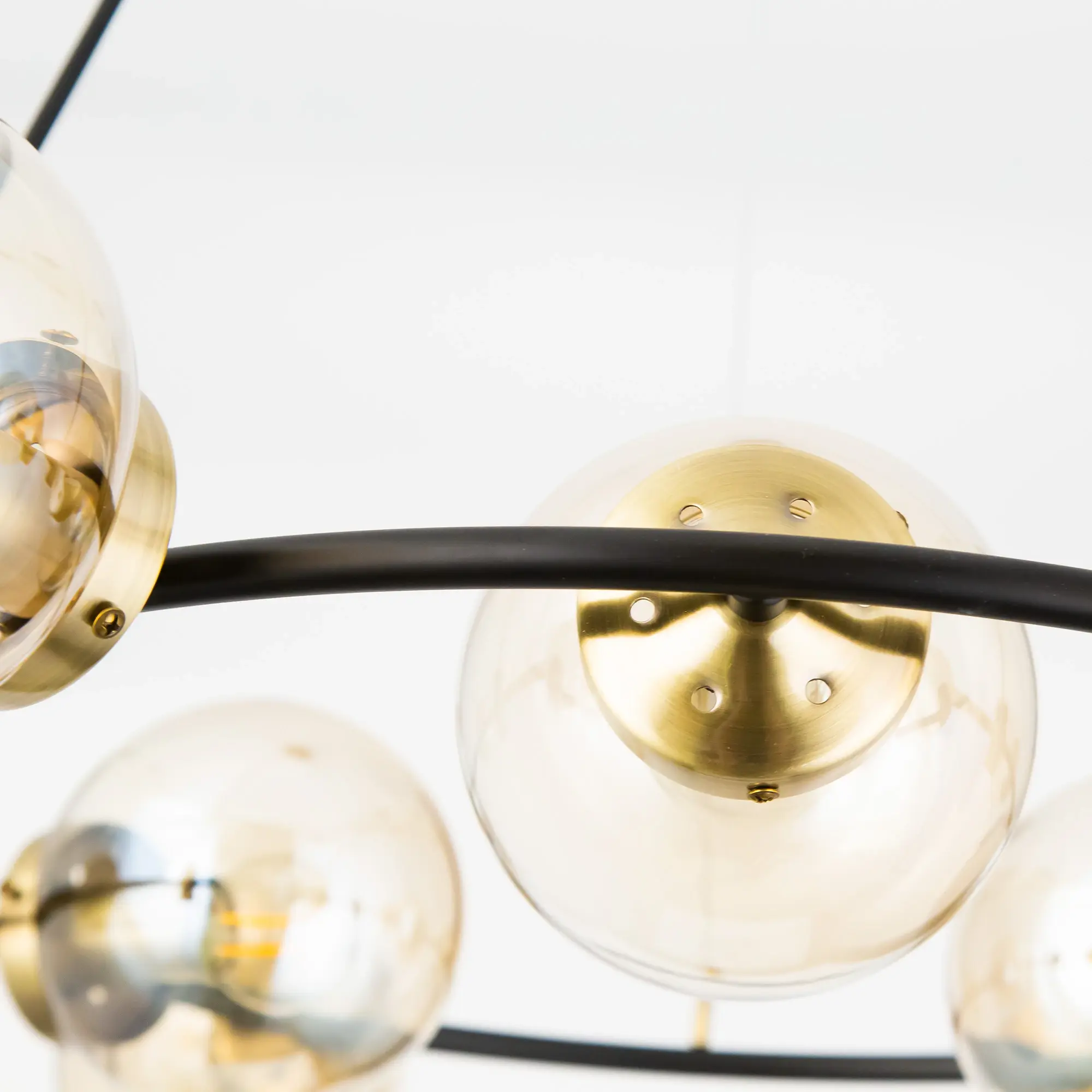Подвесная люстра Citilux Планета CL105195 для модных интерьеров. Корпус металлический, в виде подвесного кольца, цвет – сочетание чёрного и бронзы. Плафоны в форме шара, изготовлены из прозрачного стекла светло-янтарного оттенка. В изделии используются 9 ламп с цоколем Е14, максимальной мощностью для ламп накаливания 20Вт. Рекомендуем устанавливать светодиодные филаментные лампы с прозрачной колбой. Модель рассчитана на работу как с одноклавишным, так и с двухклавишным выключателем. Высоту люстры можно отрегулировать в диапазоне от 30 до 80см. Подходит для всех типов потолков, в том числе натяжных, тип крепления – планка. Площадь освещения около 25м²,
