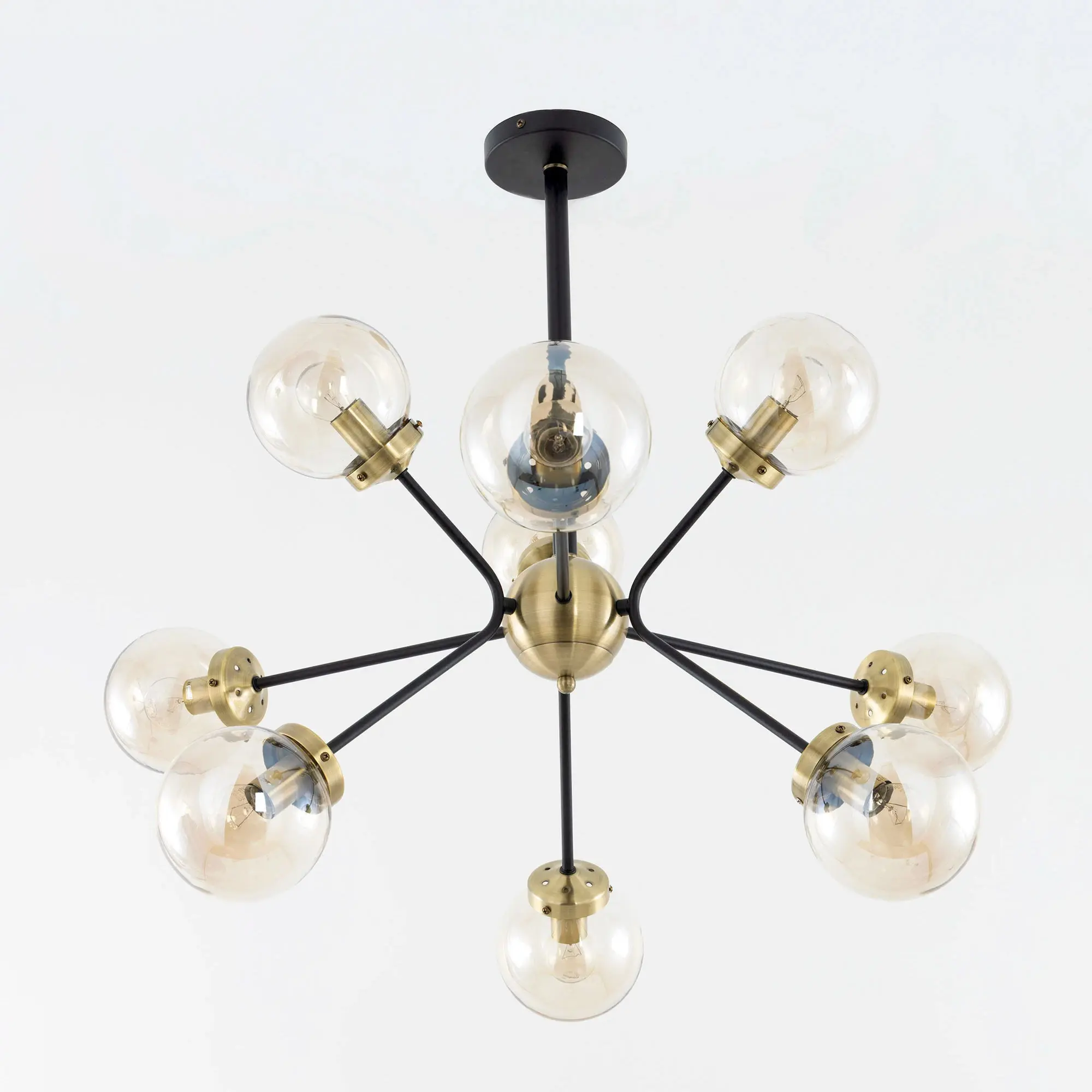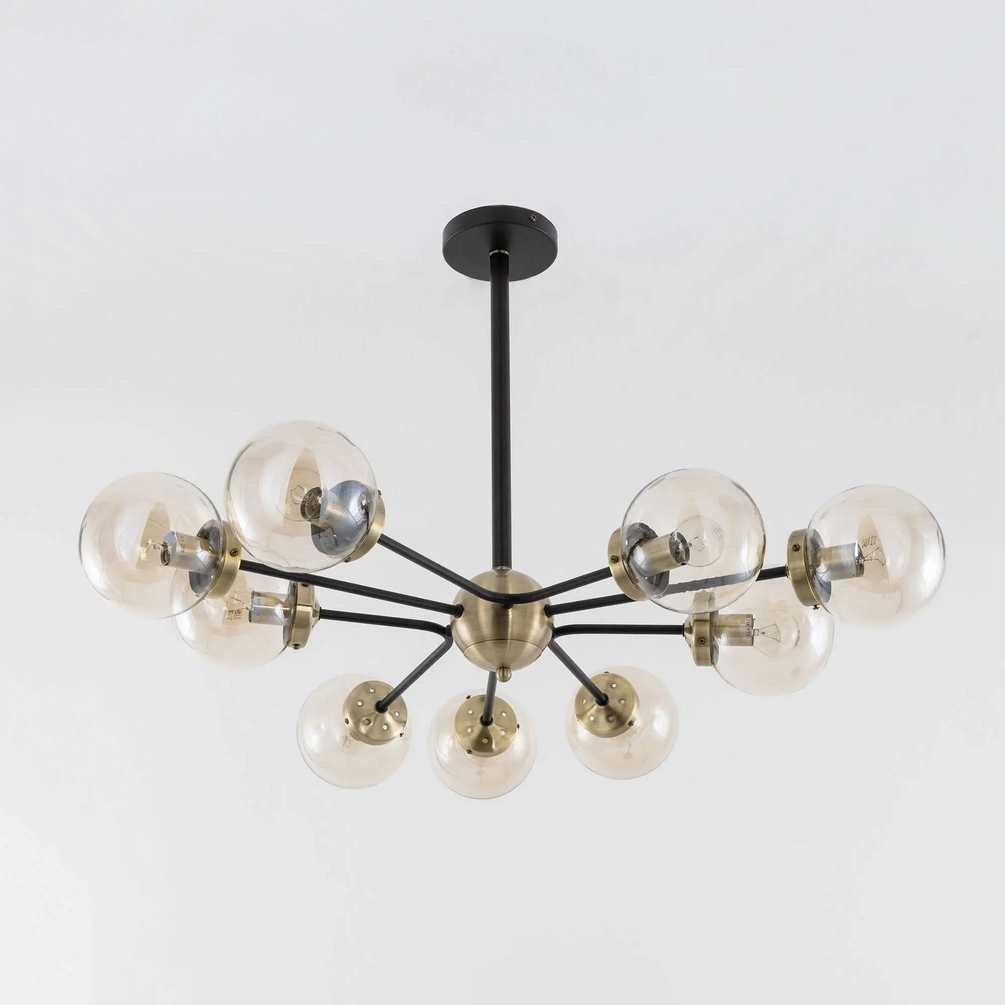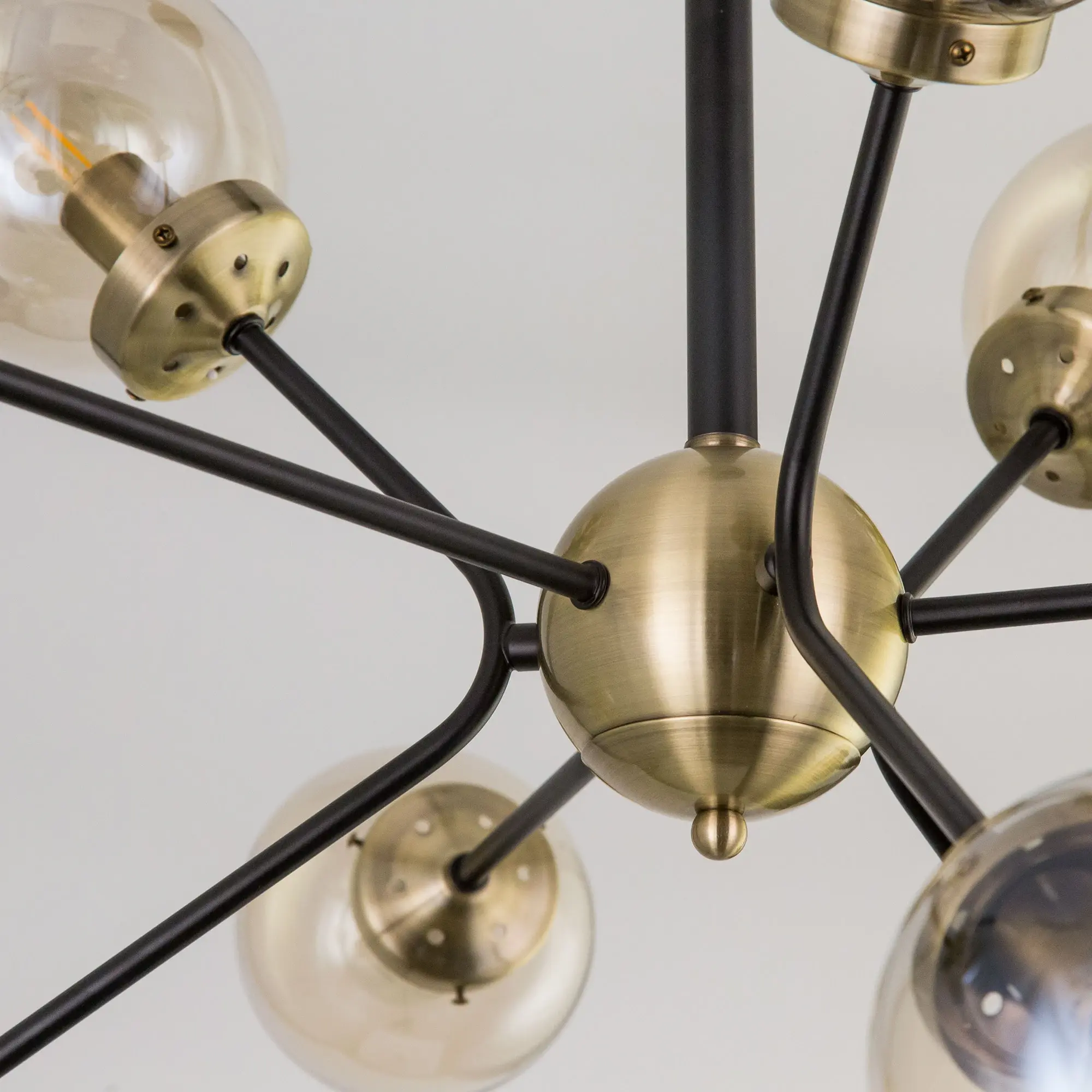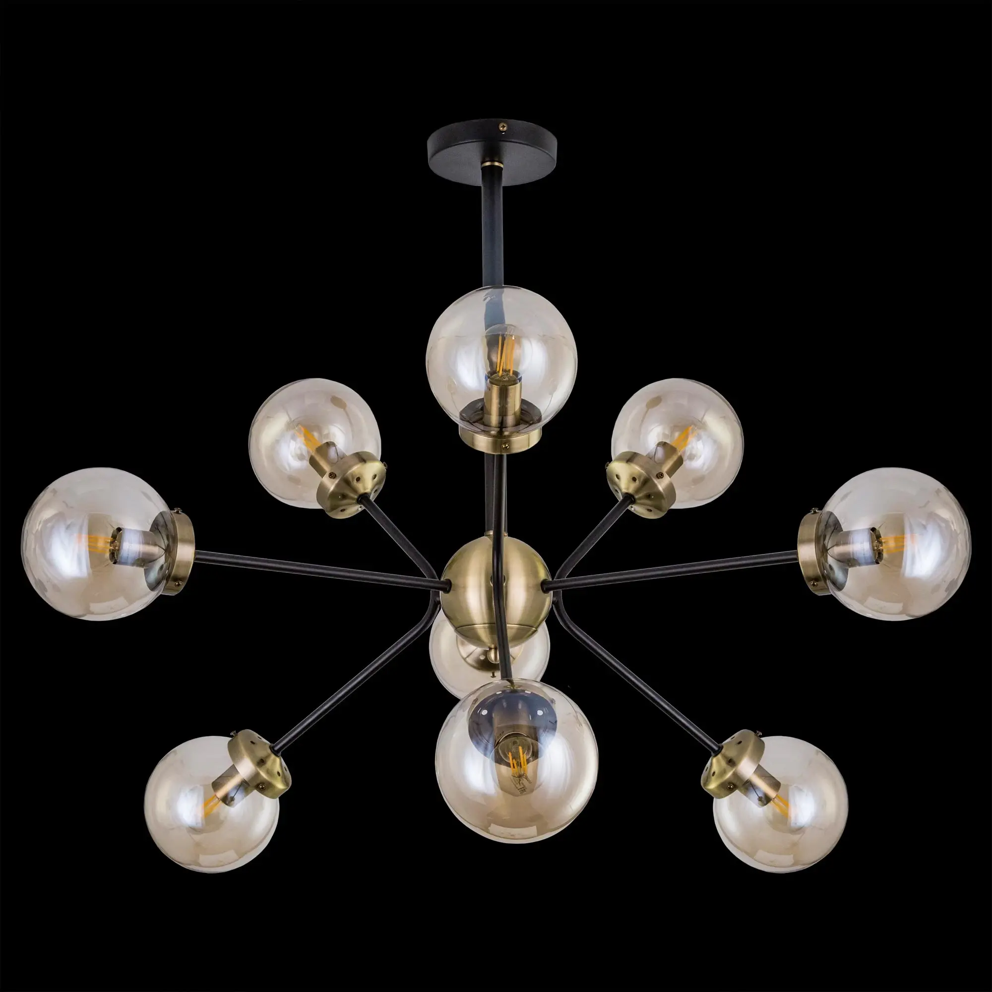 Люстра на штанге Citilux Планета CL105295 для модных интерьеров. Корпус металлический, цвет – сочетание чёрного и бронзы. Плафоны в форме шара, изготовлены из прозрачного стекла светло-янтарного оттенка. В изделии используются 9 ламп с цоколем Е14, максимальной мощностью для ламп накаливания 20Вт, что позволяет осветить помещение максимально равномерно. Рекомендуем устанавливать светодиодные филаментные лампы с прозрачной колбой. Модель поставляется частично разобранная, нужно только прикрутить рожки. При сборке, двойные рожки-штанги можно закрепить в разных положениях, создав свой неповторимый дизайн. Электрическая часть скоммутированна, рассчитана на работу как с одноклавишным, так и с двухклавишным выключателем. Люстра подходит для всех типов потолков, в том числе натяжных, тип крепления – планка. Площадь освещения около 25м².