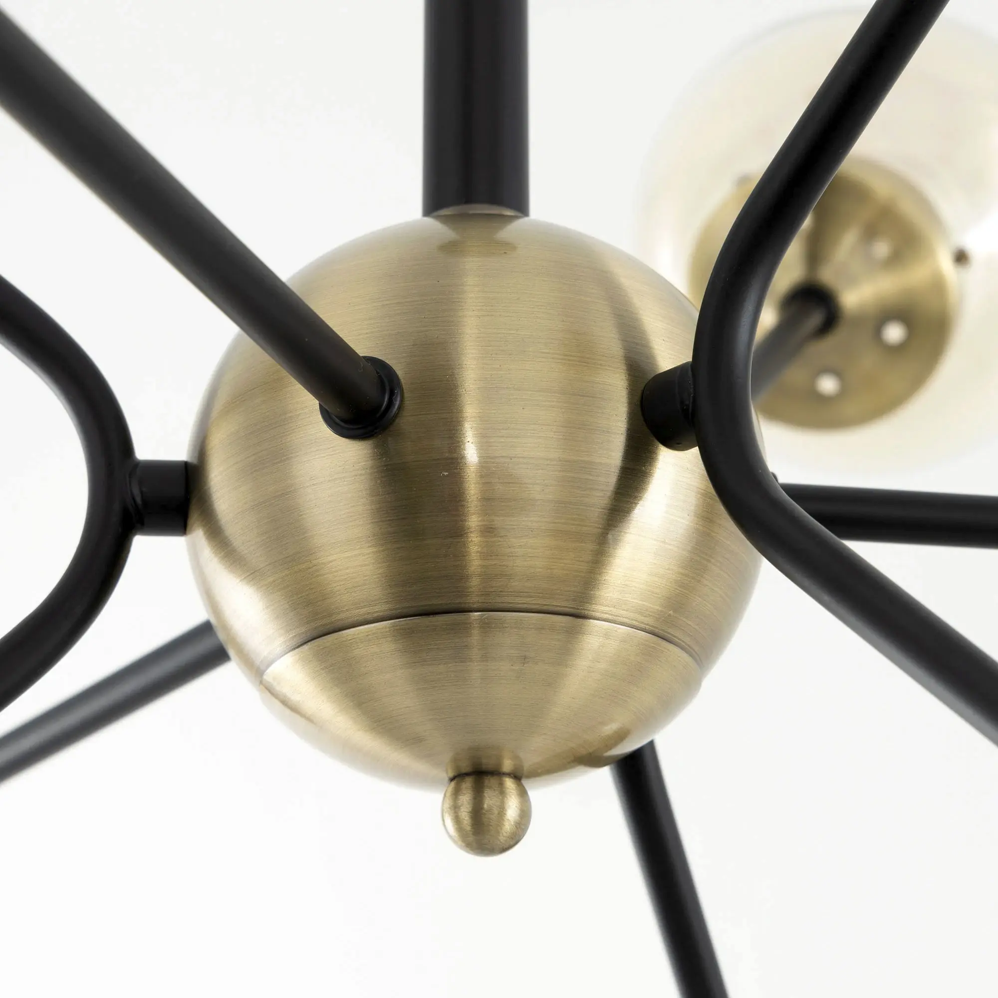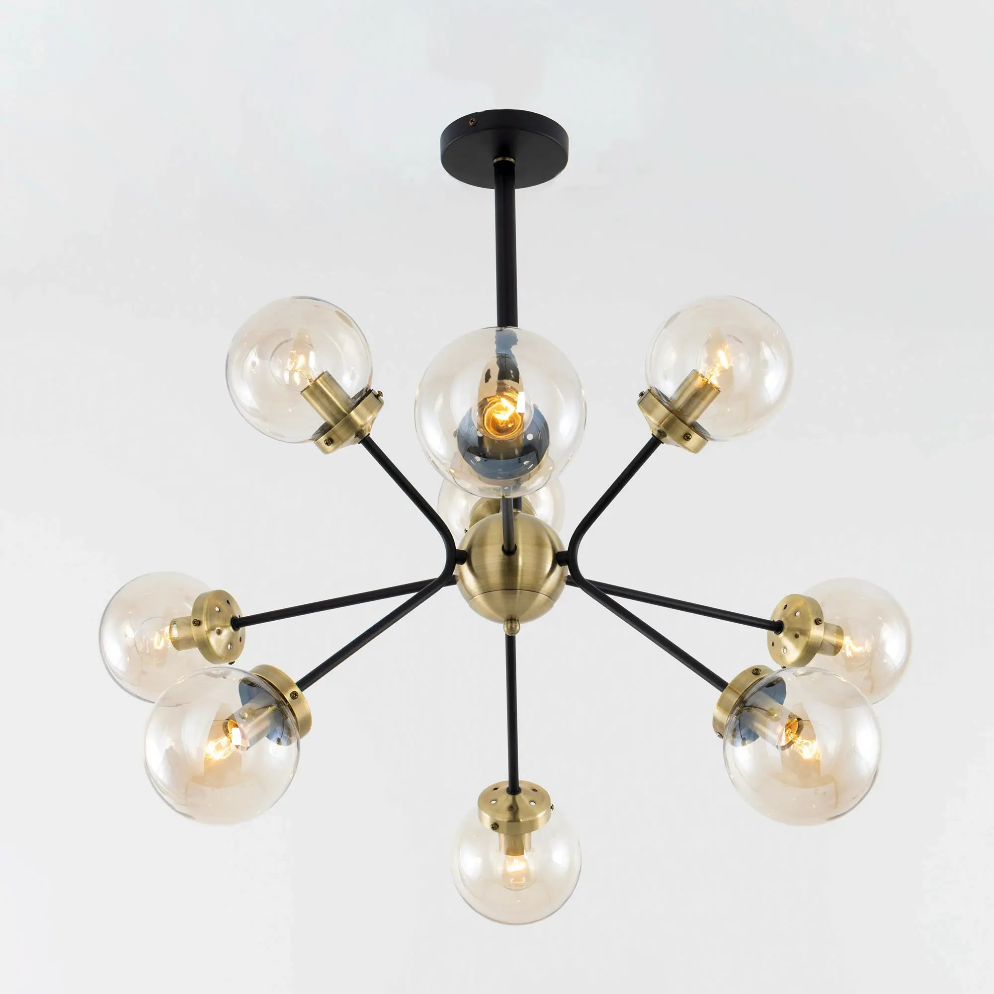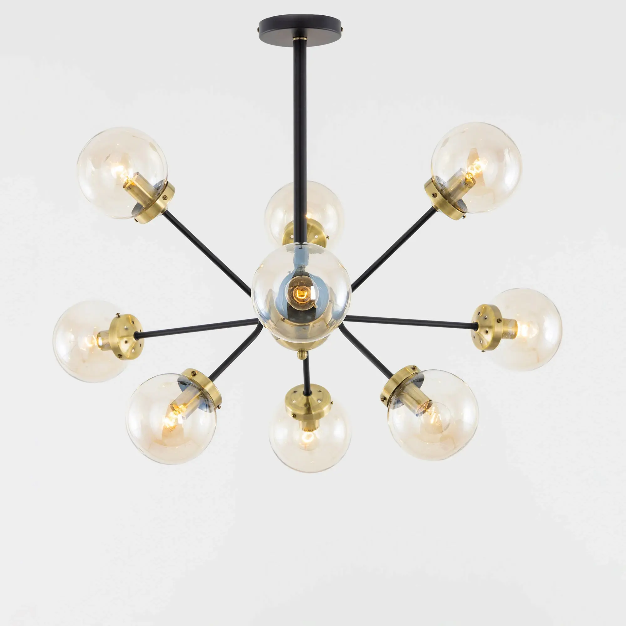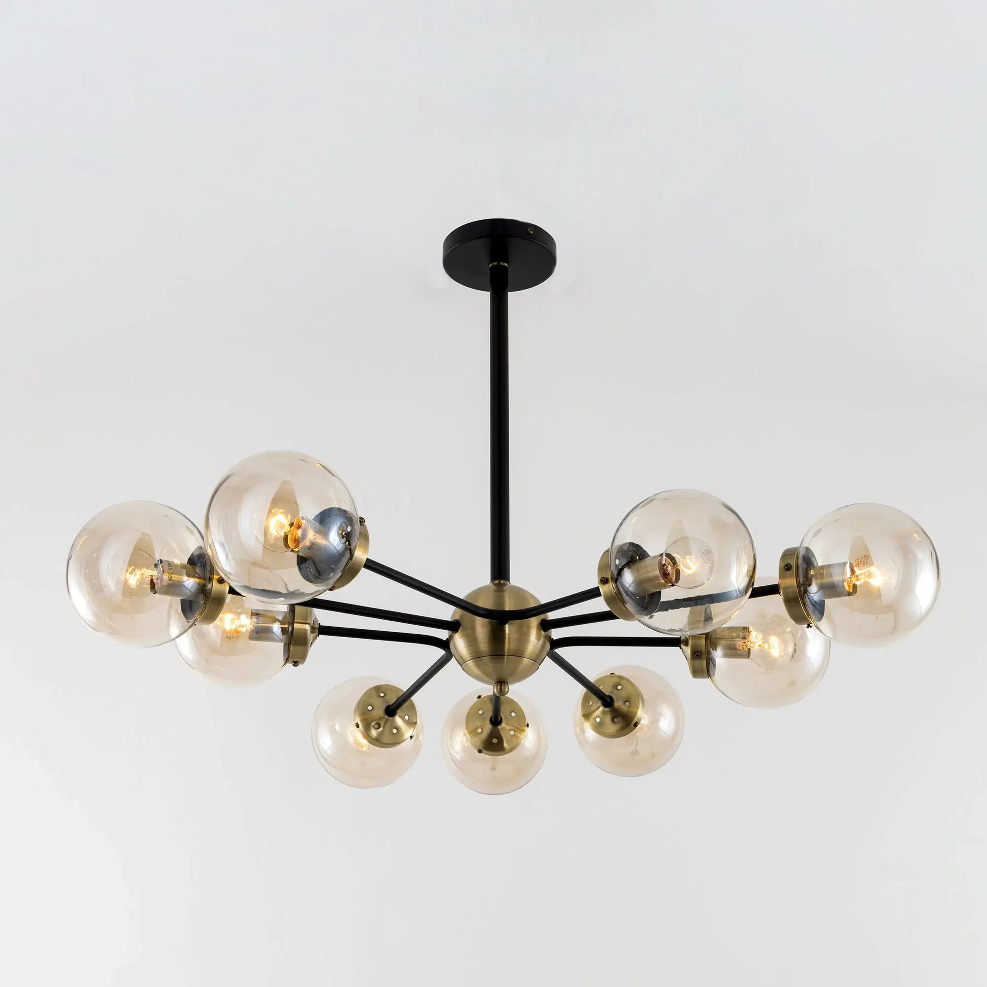 Люстра на штанге Citilux Планета CL105295 для модных интерьеров. Корпус металлический, цвет – сочетание чёрного и бронзы. Плафоны в форме шара, изготовлены из прозрачного стекла светло-янтарного оттенка. В изделии используются 9 ламп с цоколем Е14, максимальной мощностью для ламп накаливания 20Вт, что позволяет осветить помещение максимально равномерно. Рекомендуем устанавливать светодиодные филаментные лампы с прозрачной колбой. Модель поставляется частично разобранная, нужно только прикрутить рожки. При сборке, двойные рожки-штанги можно закрепить в разных положениях, создав свой неповторимый дизайн. Электрическая часть скоммутированна, рассчитана на работу как с одноклавишным, так и с двухклавишным выключателем. Люстра подходит для всех типов потолков, в том числе натяжных, тип крепления – планка. Площадь освещения около 25м².