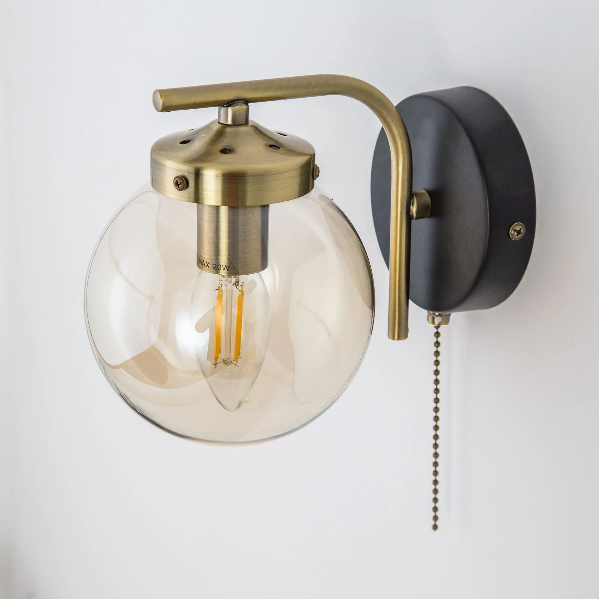 Настенный светильник Citilux Планета CL105315 с удобным выключателем. Корпус металлический, цвет – сочетание чёрного и бронзы. Плафон в форме шара, изготовлен из прозрачного стекла светло-янтарного оттенка. В изделии используются лампа с цоколем Е14, максимальной мощностью для ламп накаливания 20Вт. Рекомендуем устанавливать светодиодные филаментные лампы с прозрачной колбой. Тип крепления к стене – планка. Площадь освещения около 1м².
